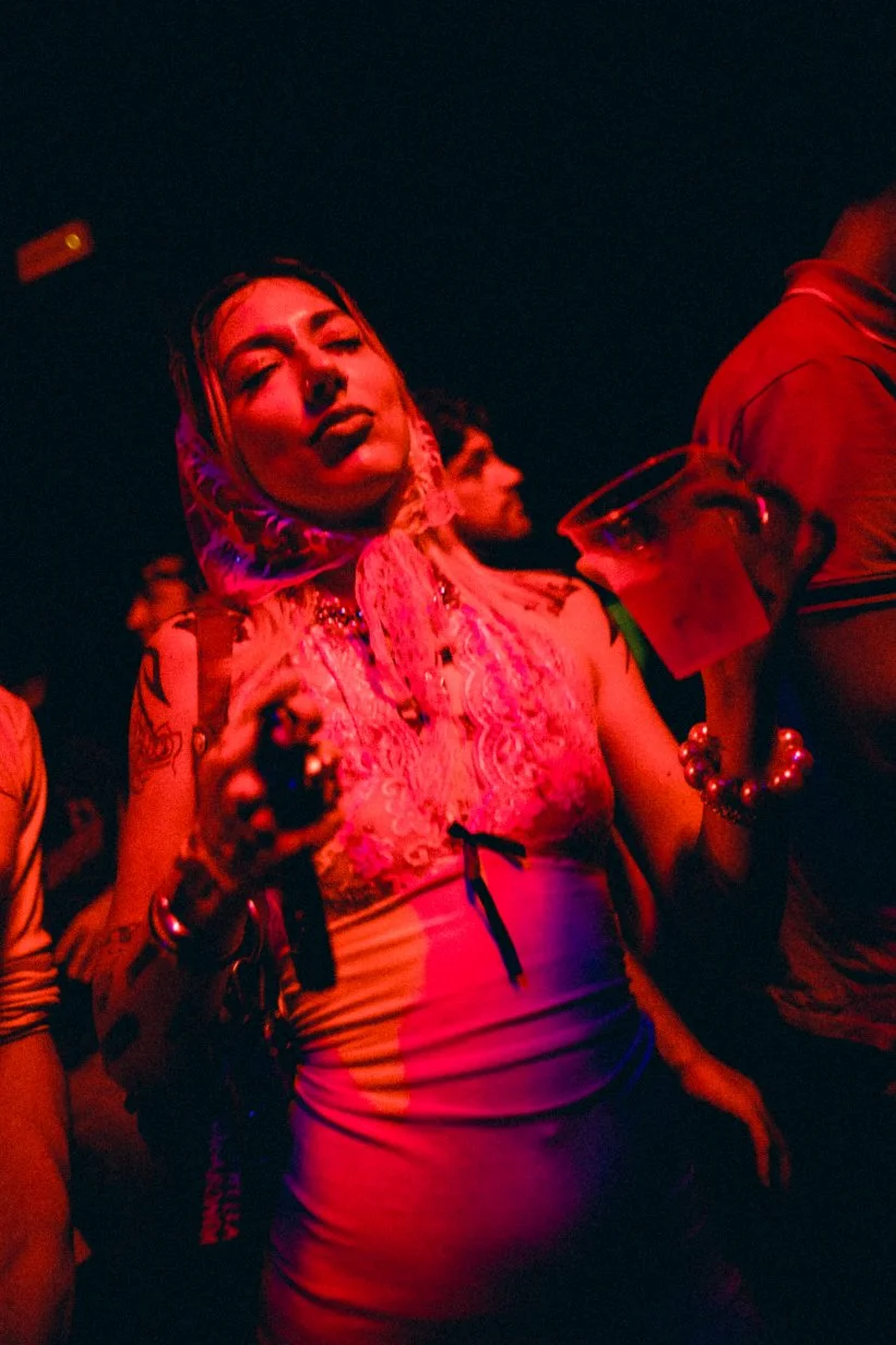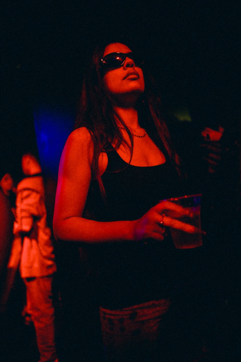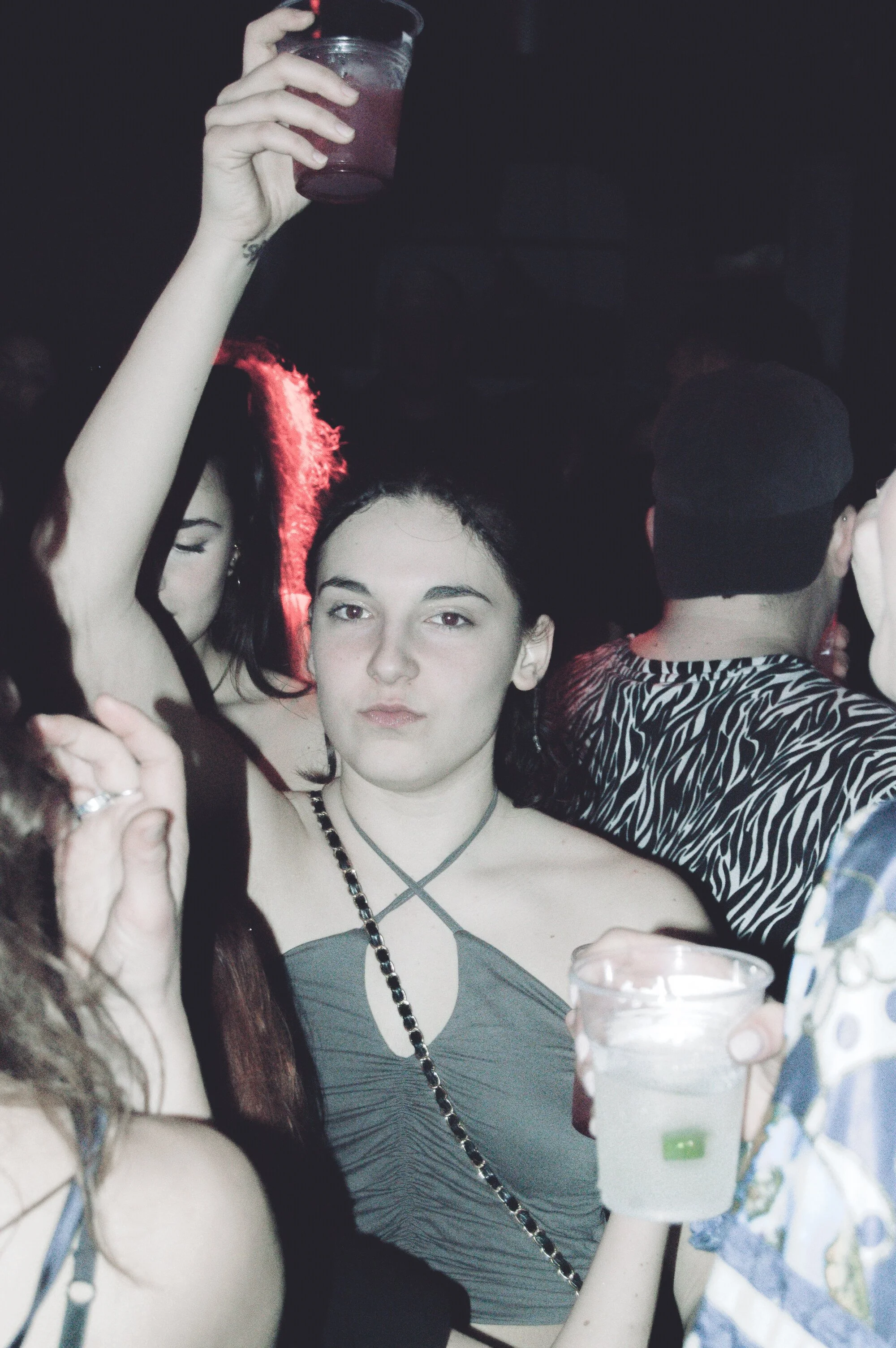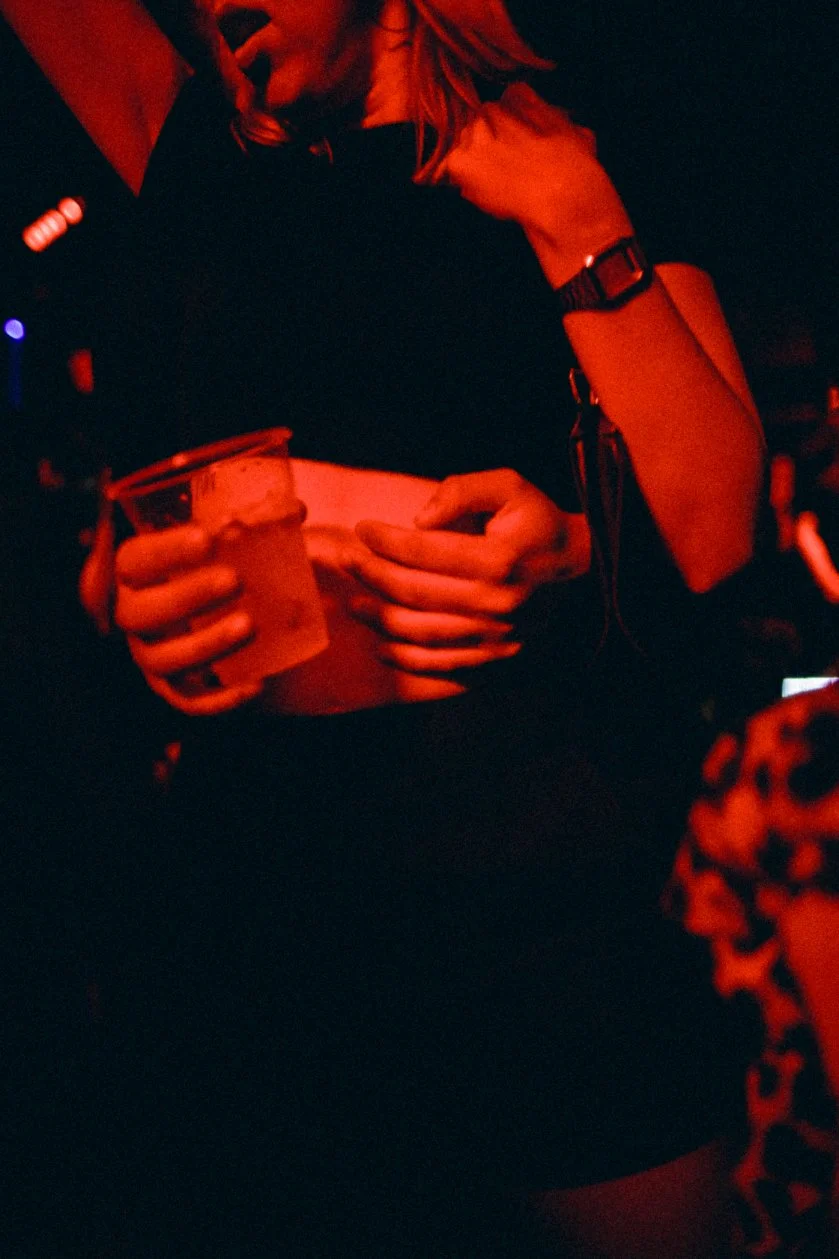 Una donna in un locale affollato, che sorseggia una bevanda trasparente in un bicchiere, con luci rosse e altri persone sullo sfondo.