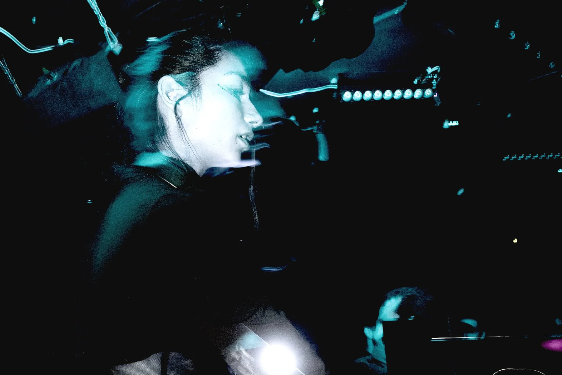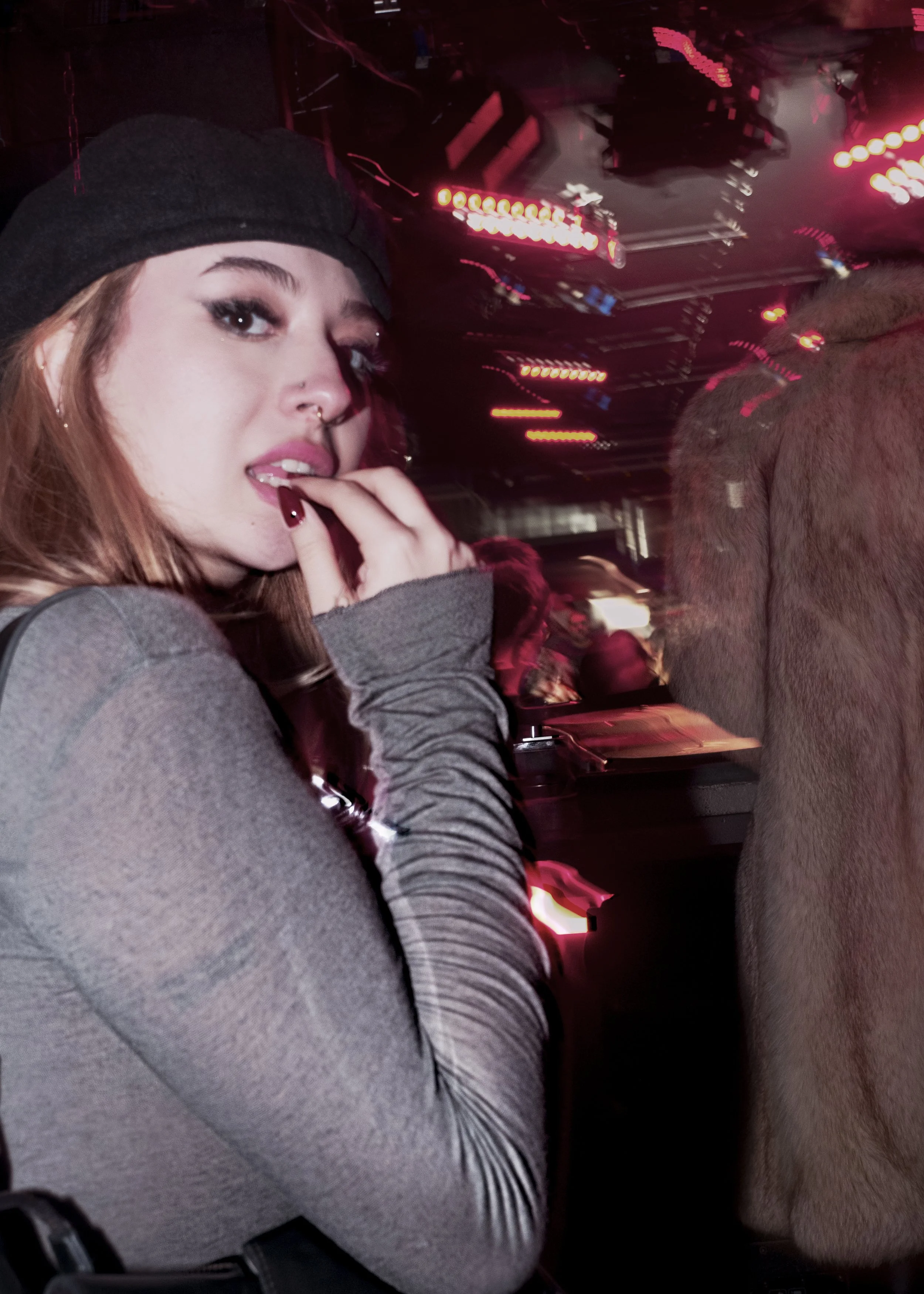 Una ragazza con abbigliamento da sera in un ambiente con luci colorate, probabilmente un club o una discoteca.
