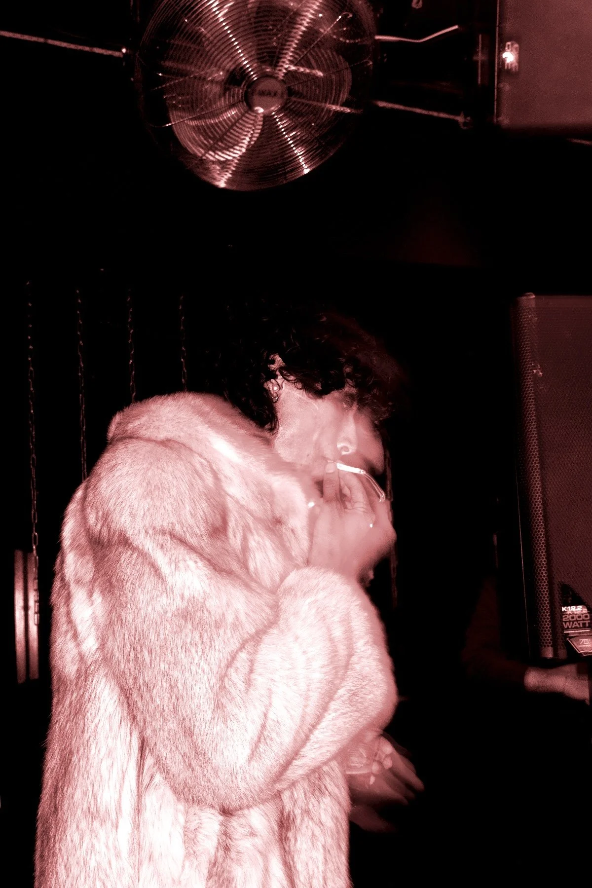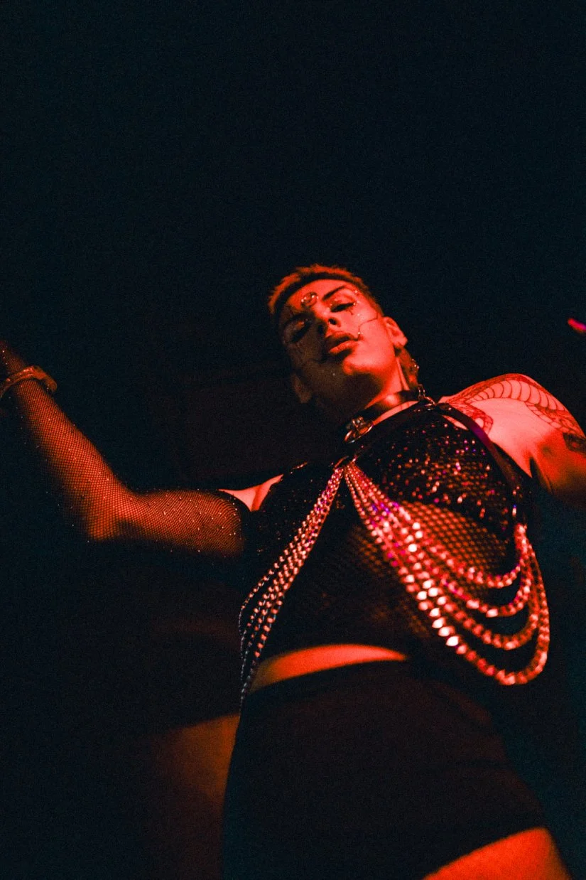 Una performer in abiti lucidi e accessori multicolore si esibisce in un locale notturno con luci soffuse e pubblico che la osserva.