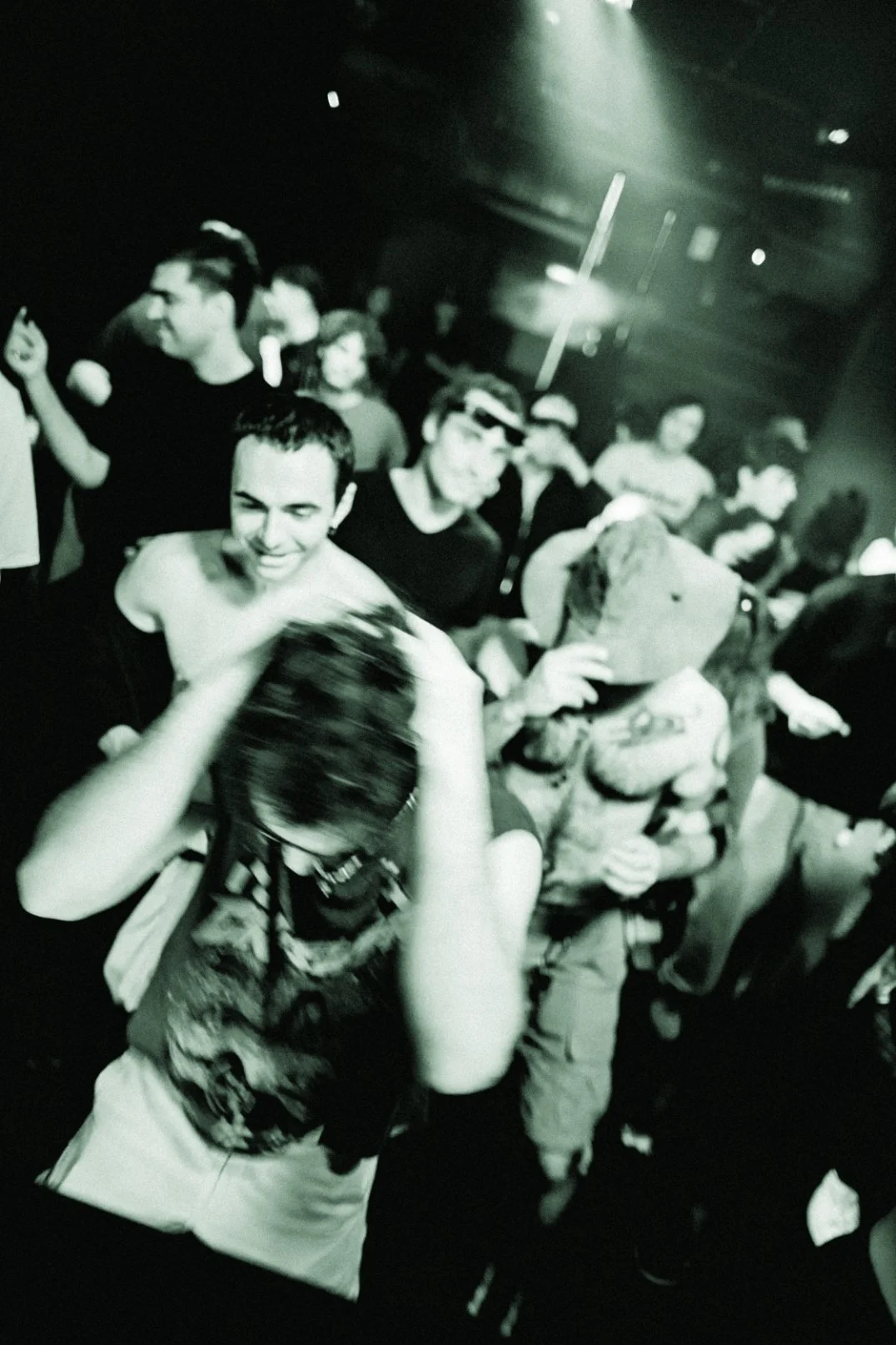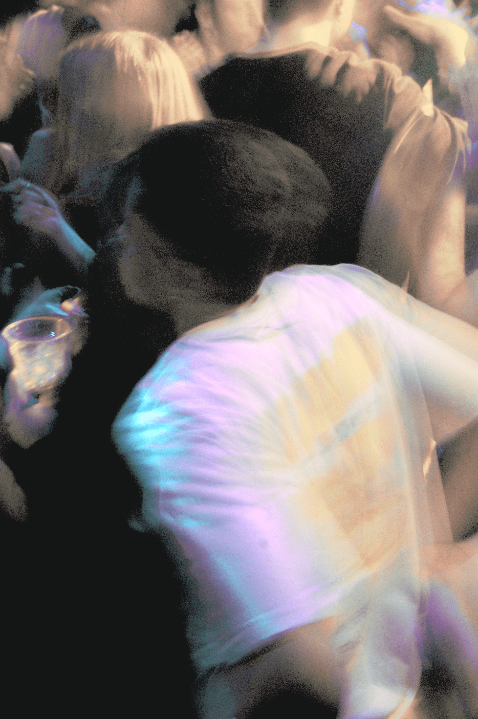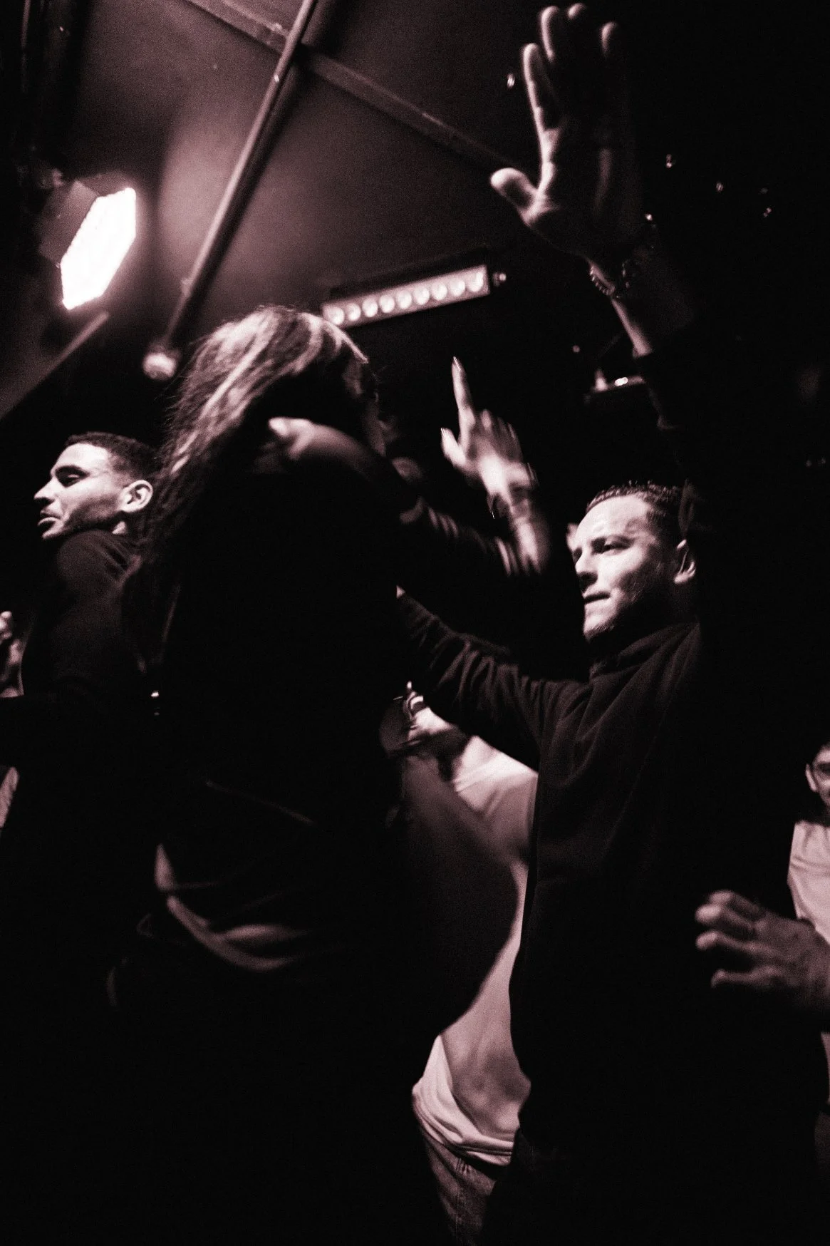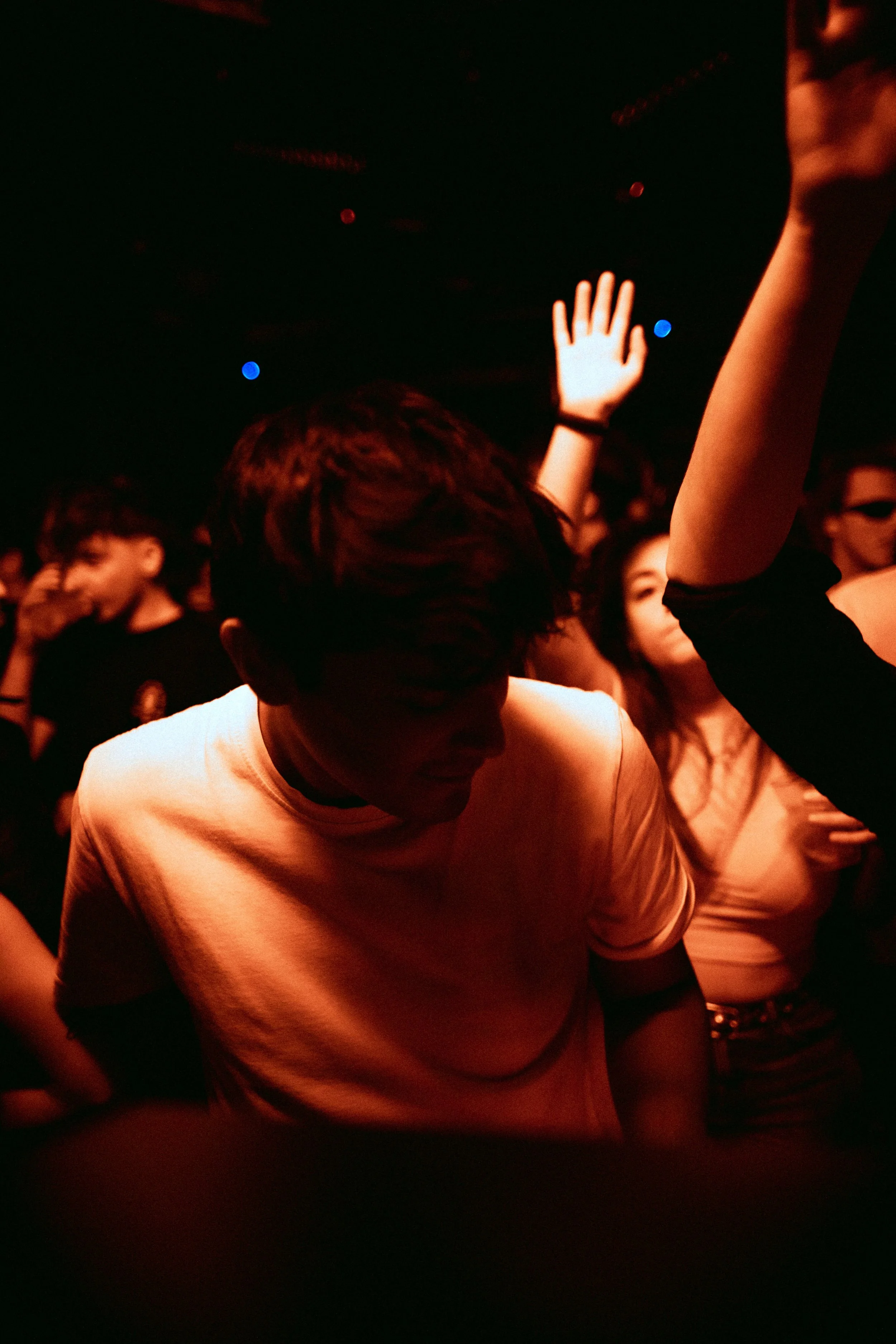 Gruppo di persone in un ambiente ambientato con luci soffuse, alcune persone si stanno muovendo e la scena sembra essere in un club o una festa.