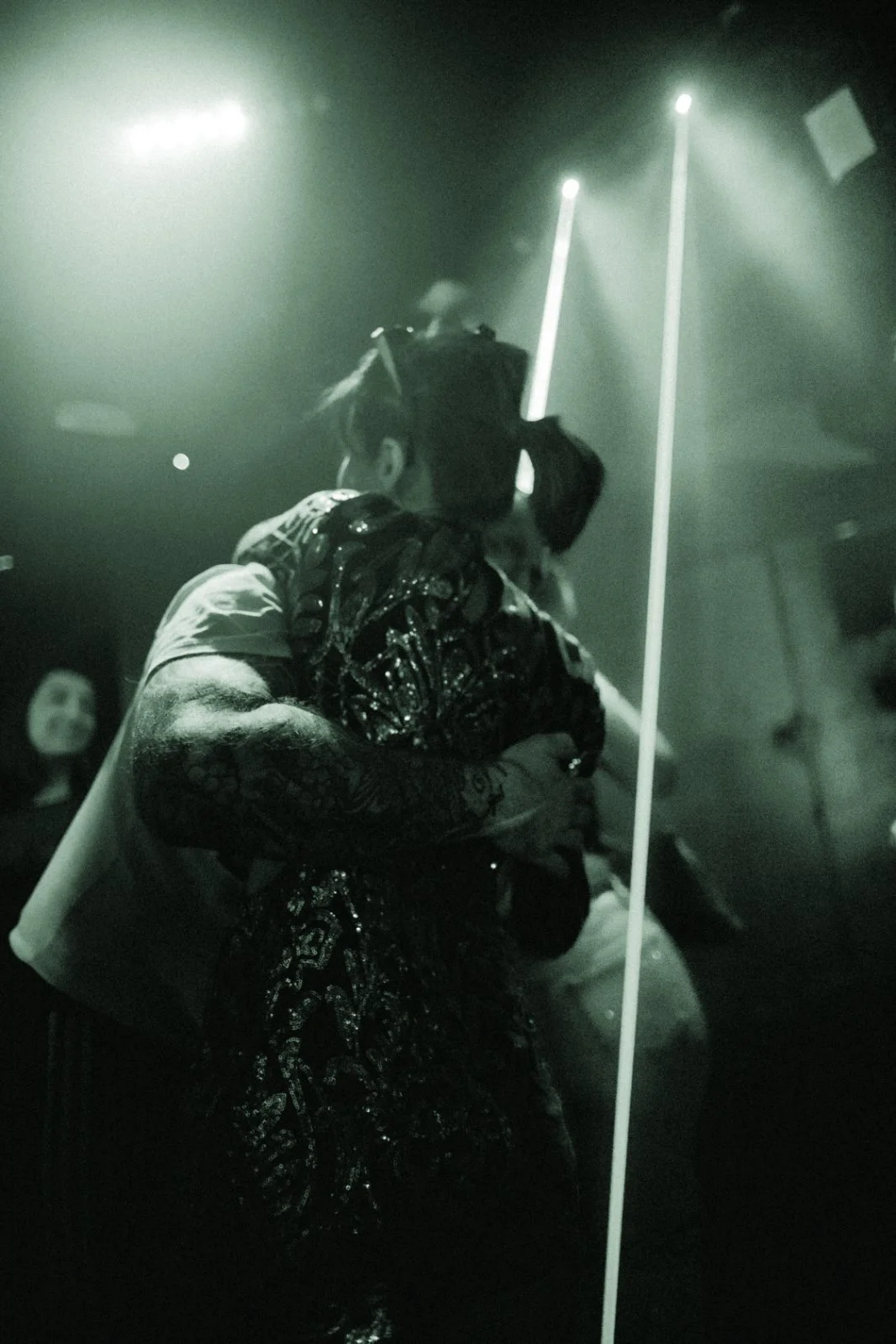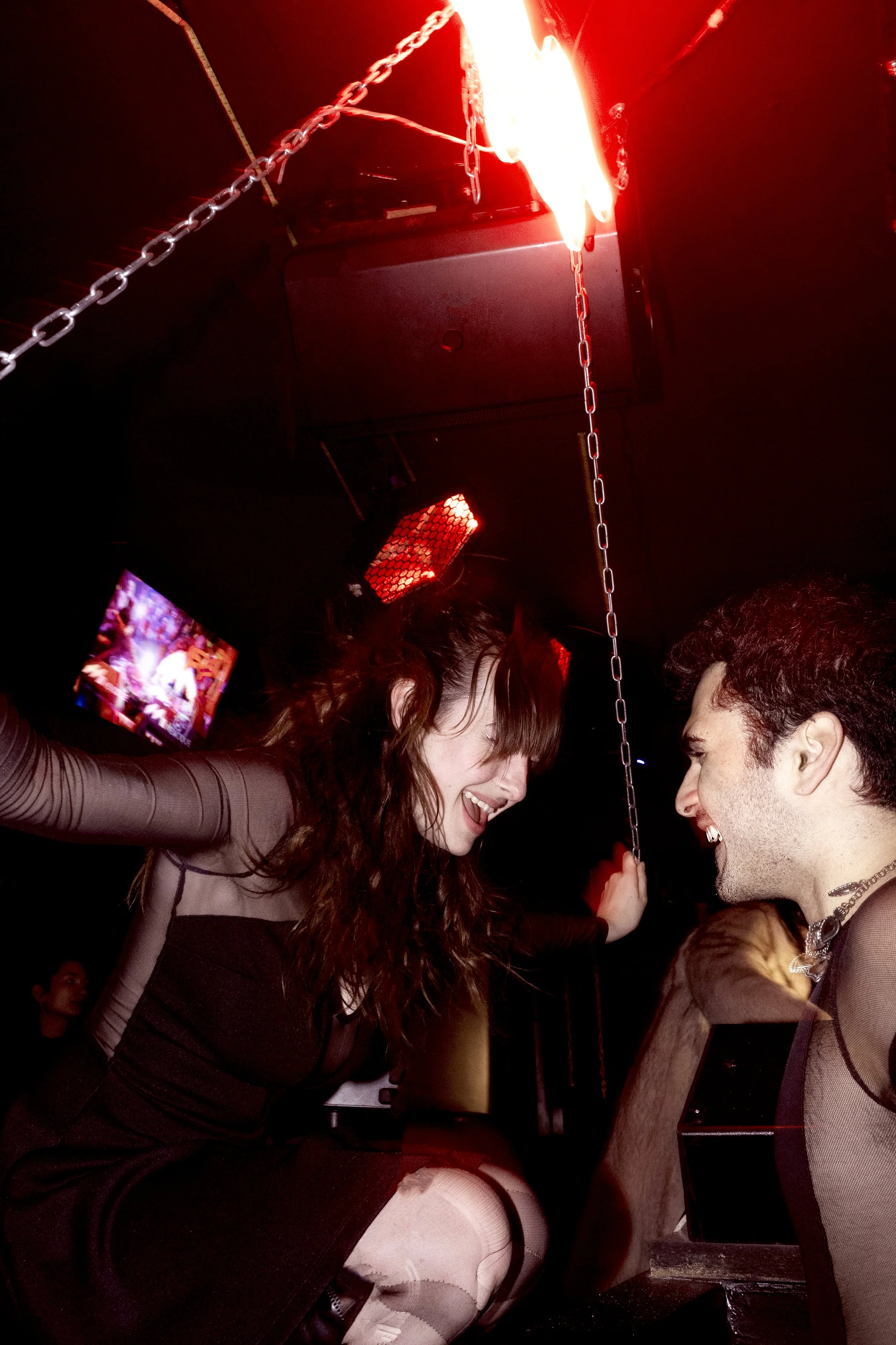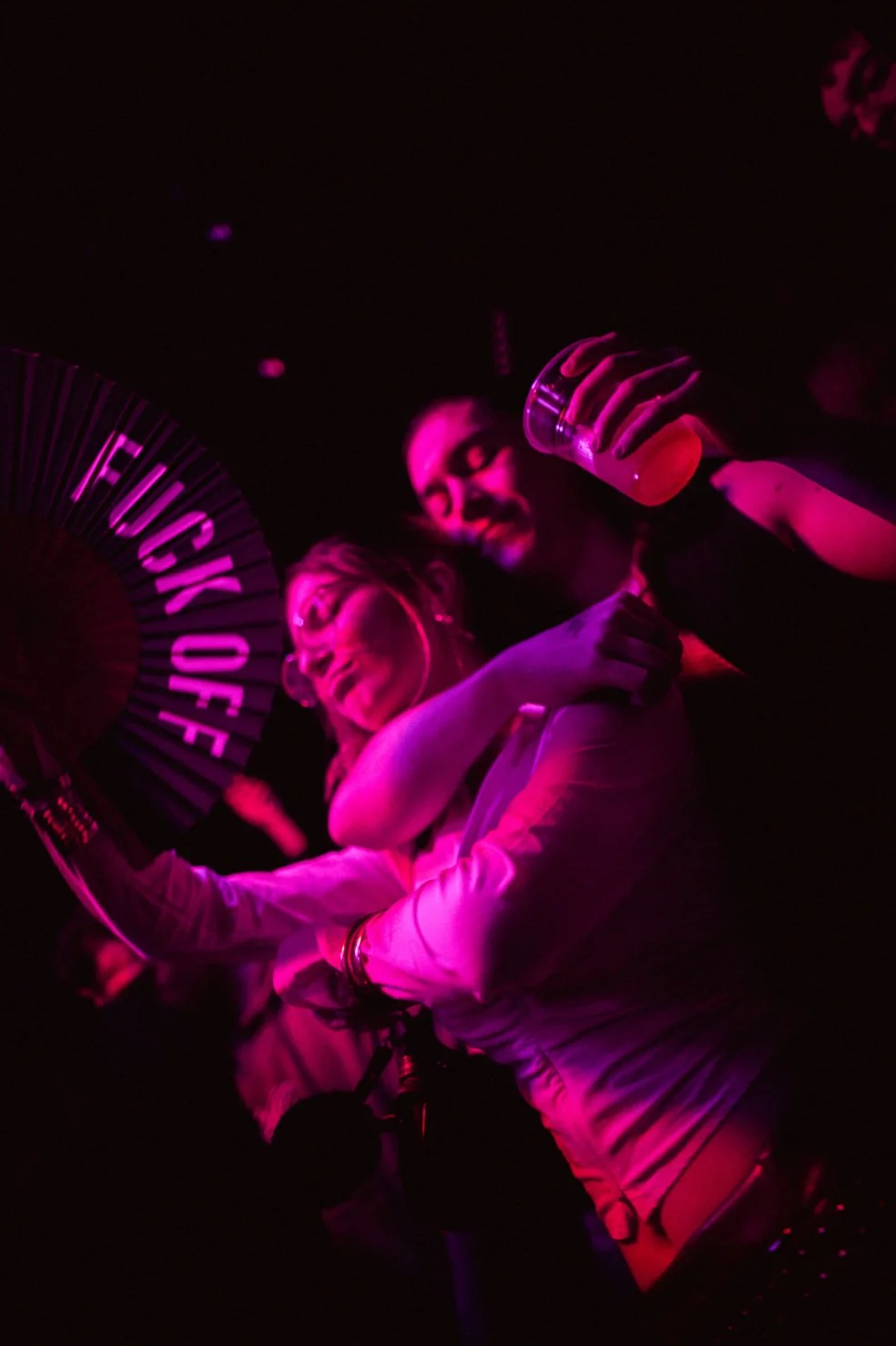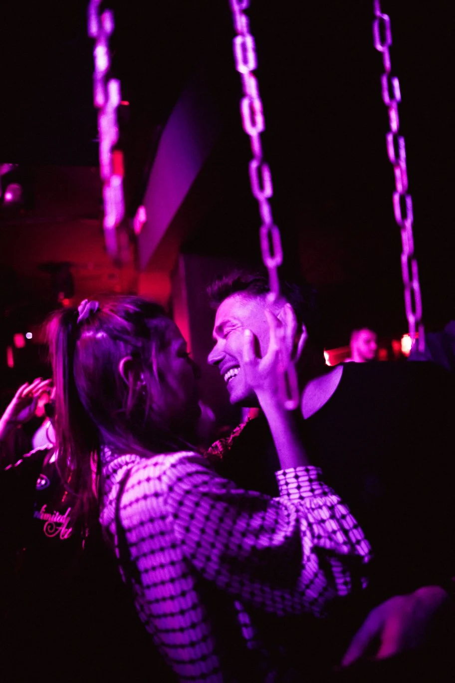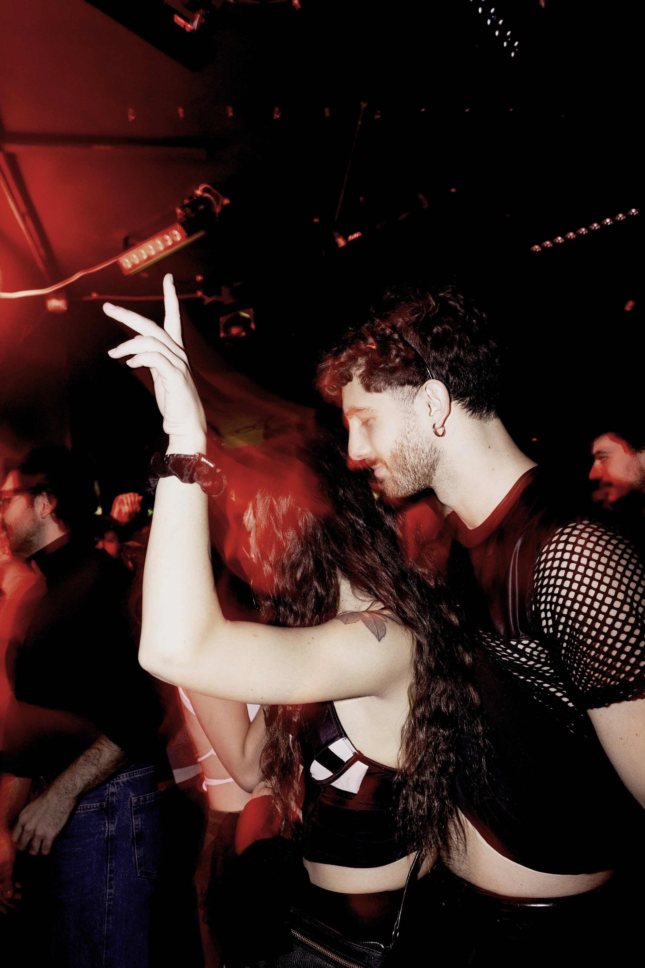 Due persone si tengono per mano al centro di un ambiente oscuro, probabilmente un club o una festa, con luci rosse e nere, creando un'atmosfera festosa e energica.