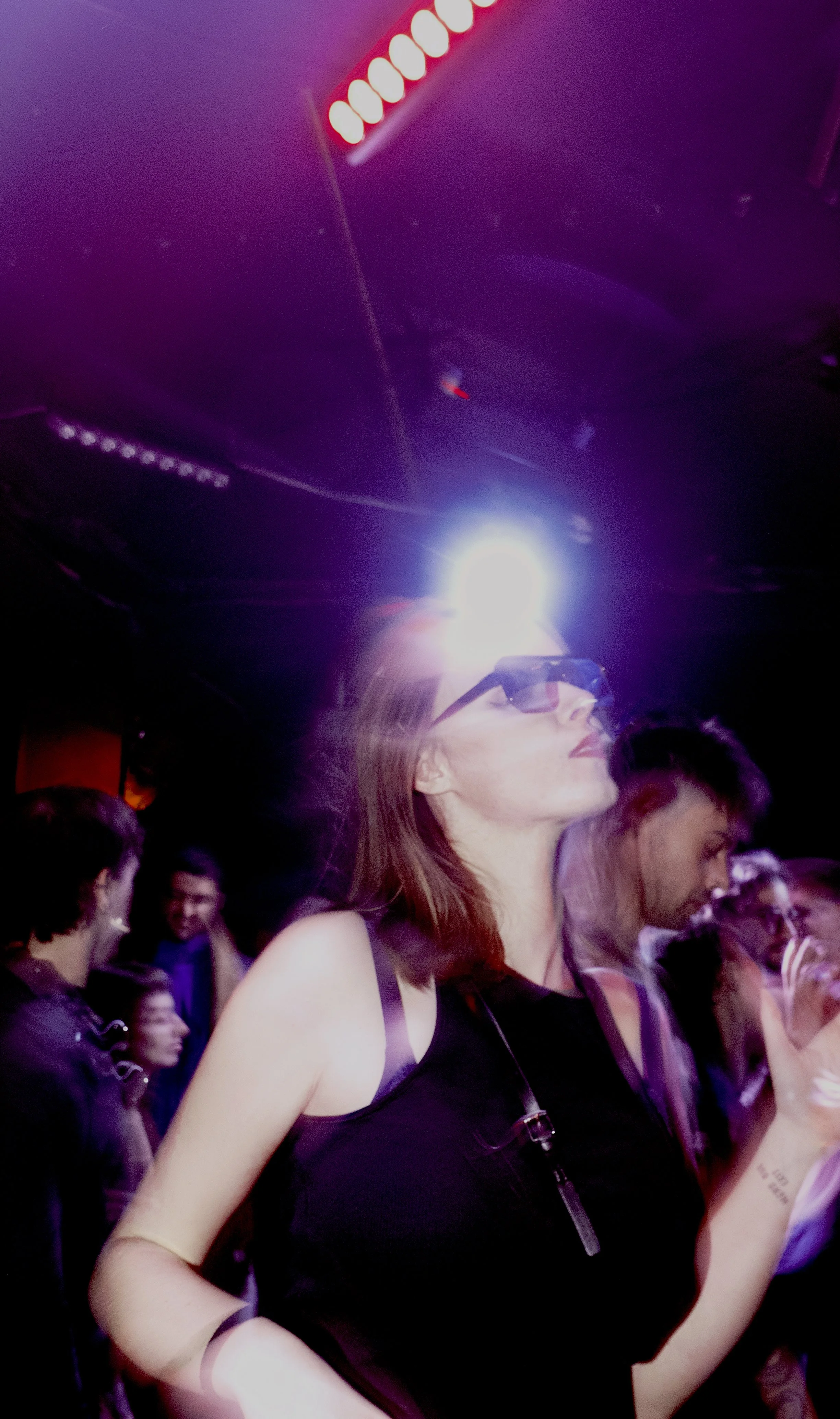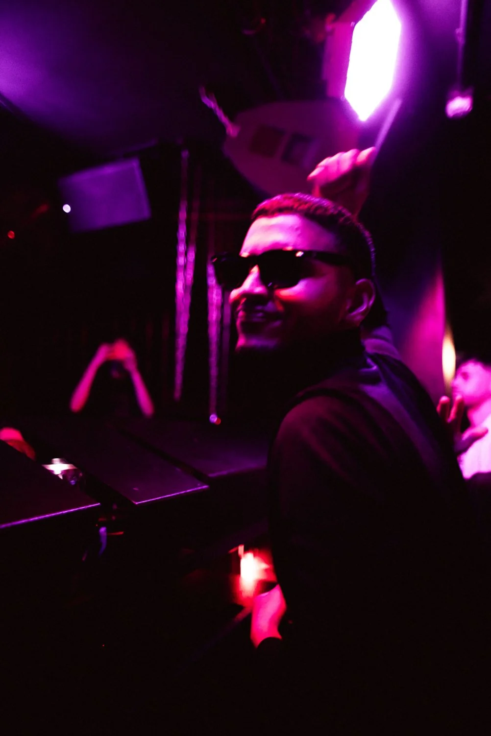 Persona che indossa occhiali da sole in un ambiente con luci colorate, probabilmente una discoteca o un evento notturno.