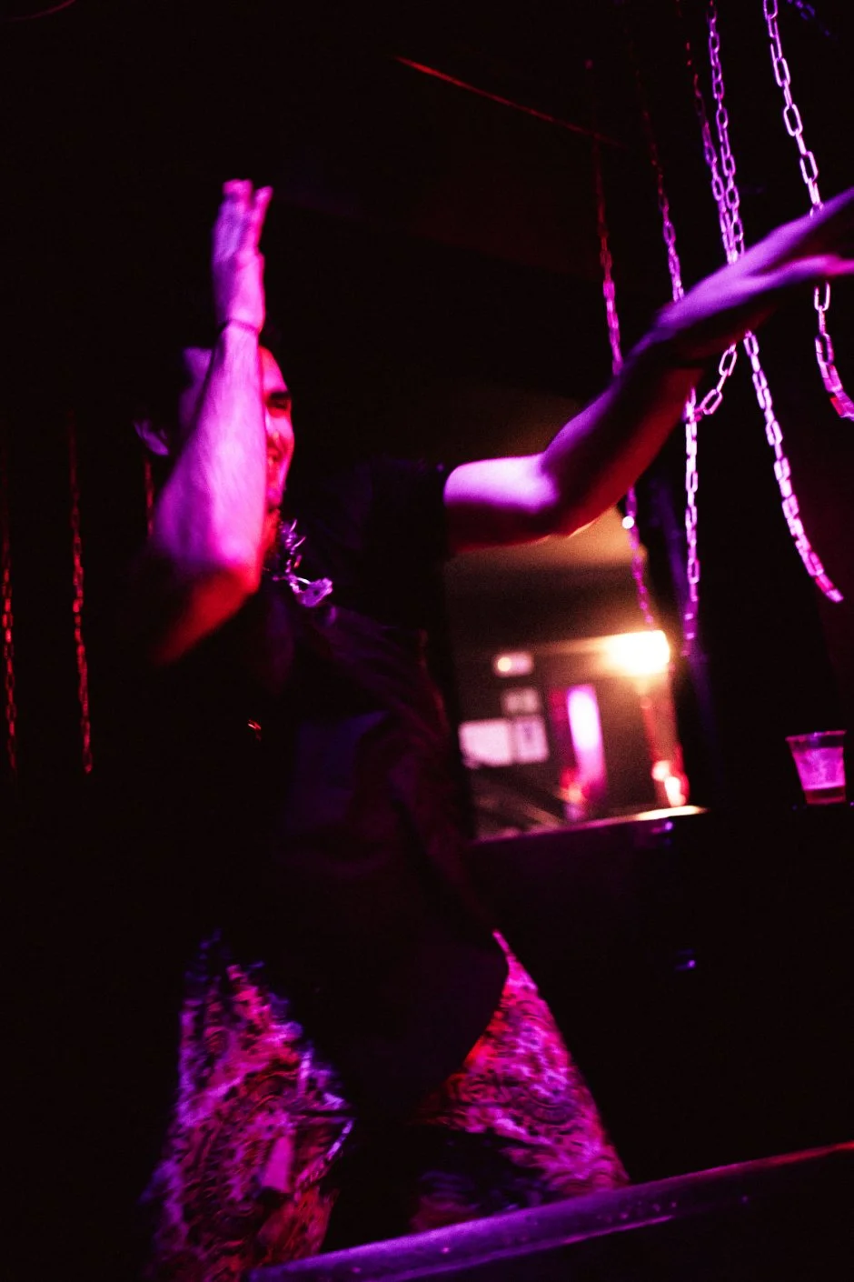 Uomo con occhiali neri, baffi, e orecchino, solleva le braccia al soffitto in un ambiente con luci verdi e scure.