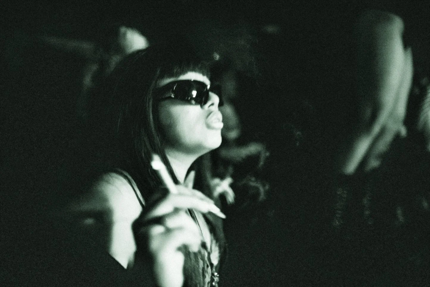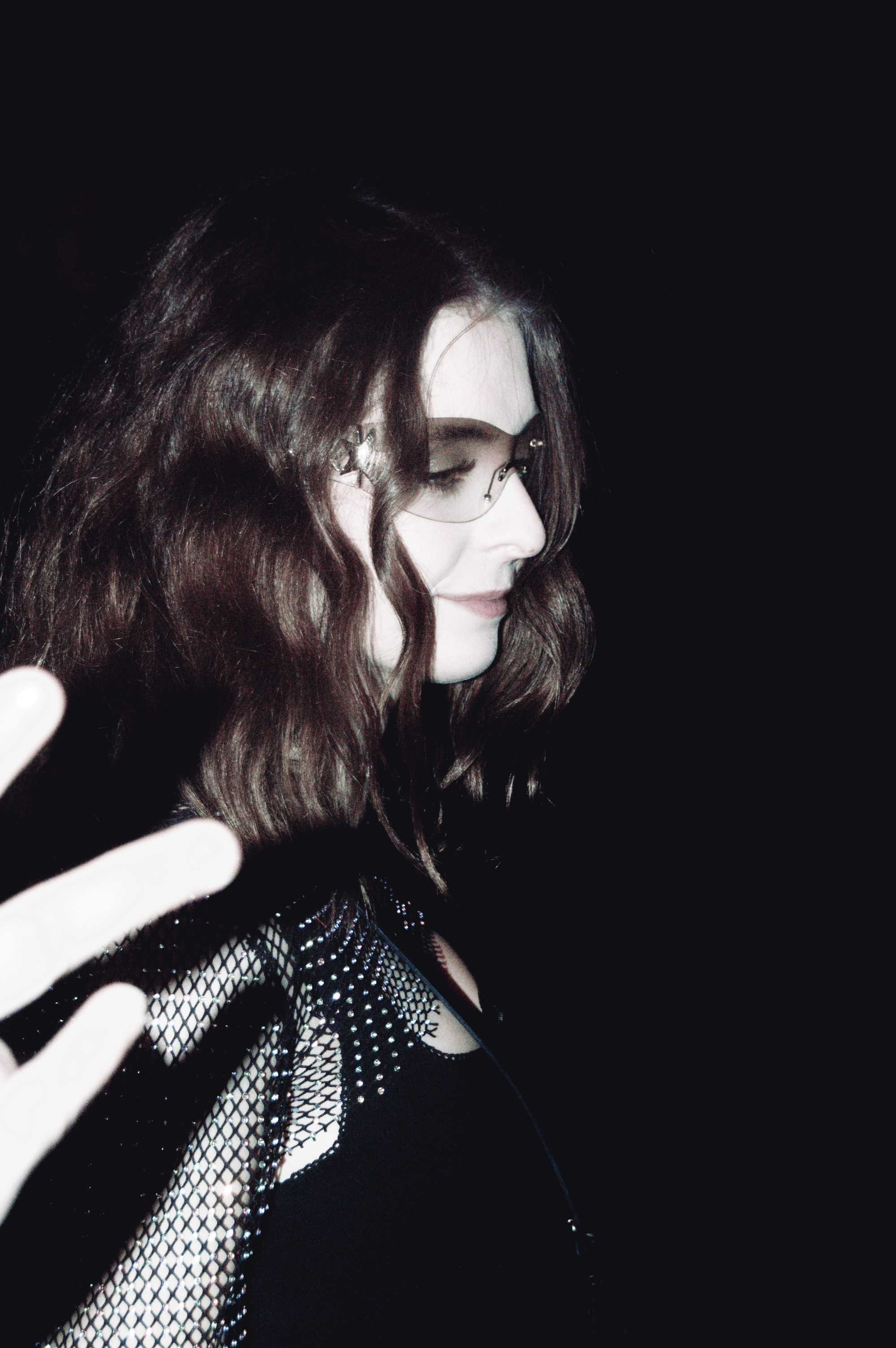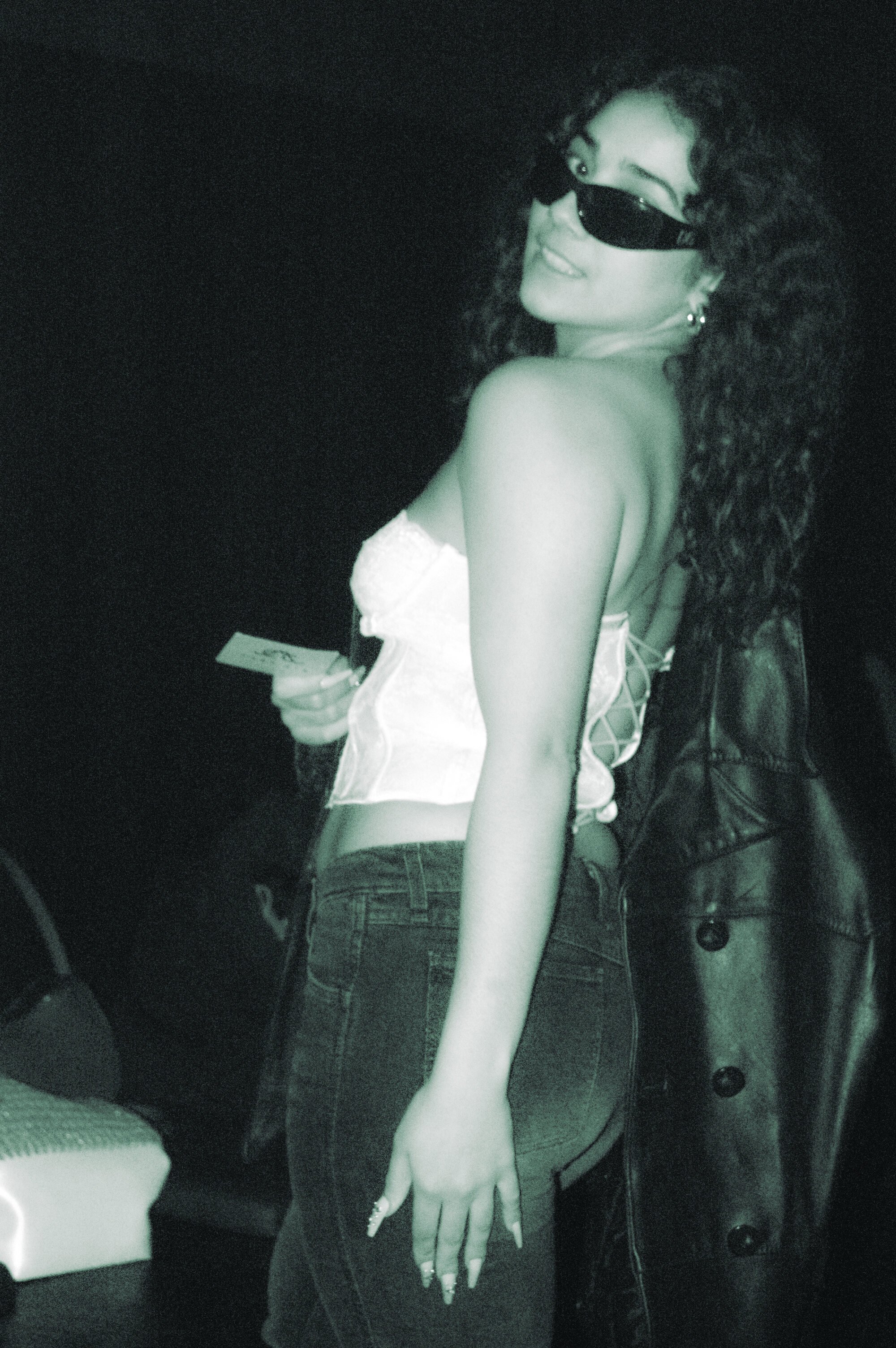 Ragazza con capelli riccioli scuri, indossa occhiali scuri e abbigliamento nero, illuminata da luci rosa e viola, in un ambiente scuro.