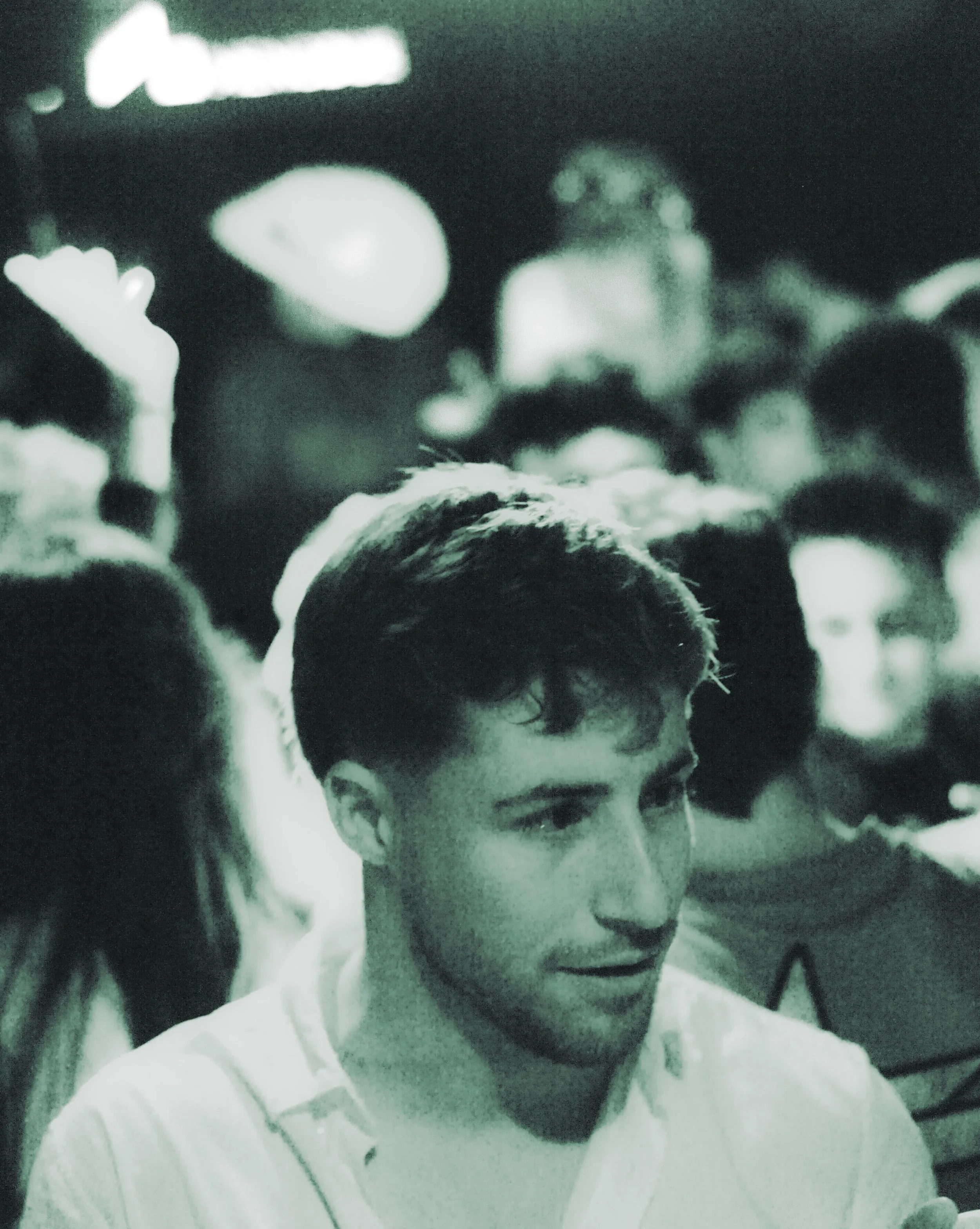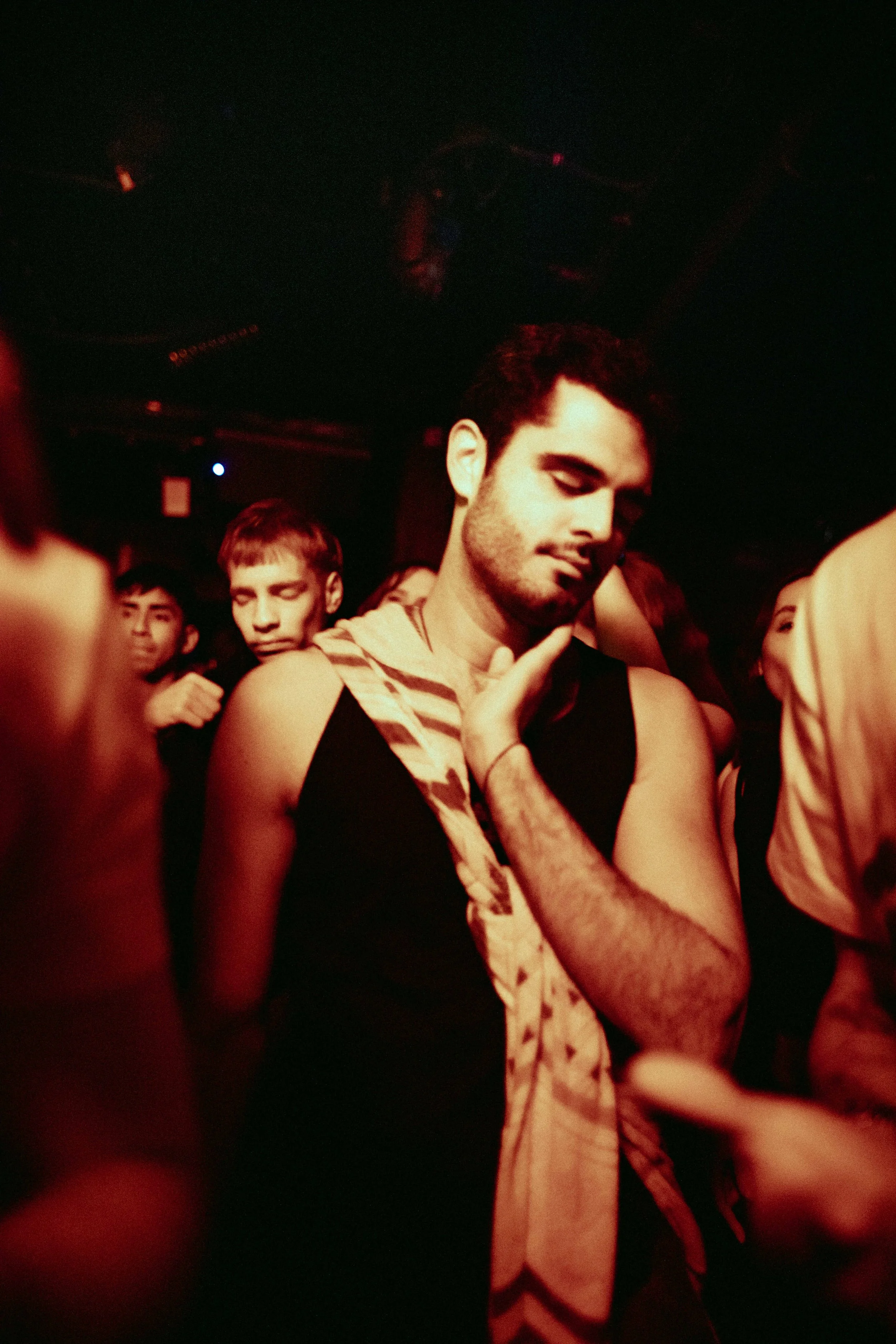 Giovane uomo in un club o un evento sociale, con gli occhi chiusi e un'espressione di relax, circondato da altre persone.