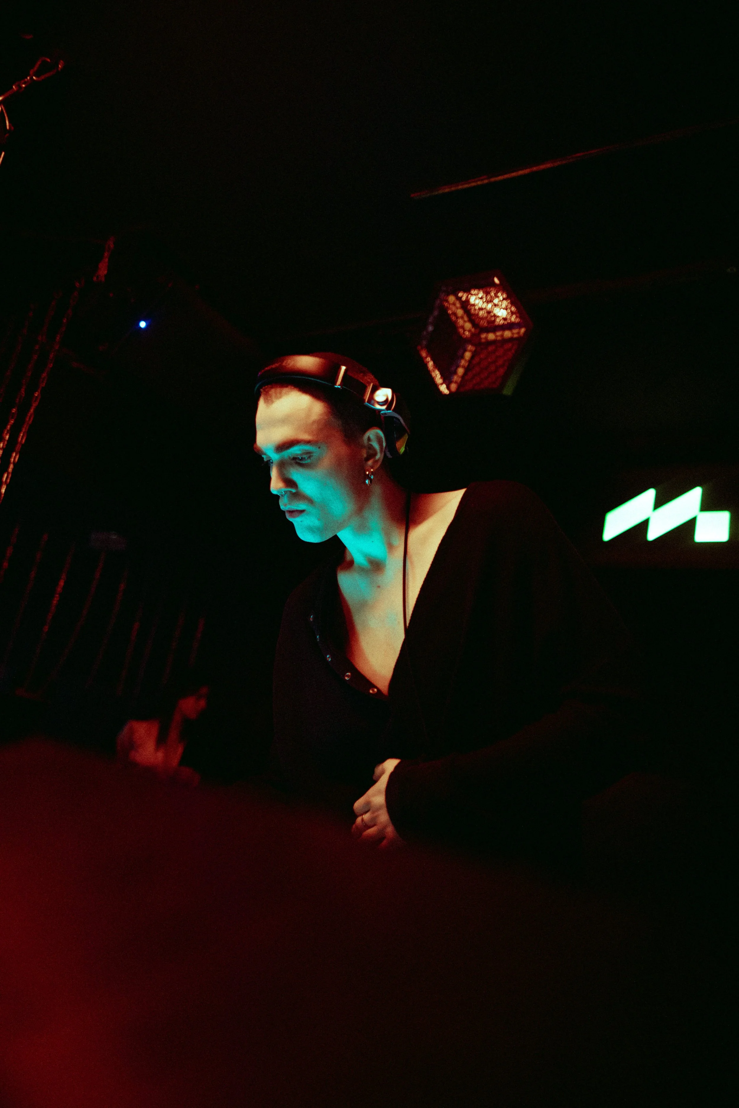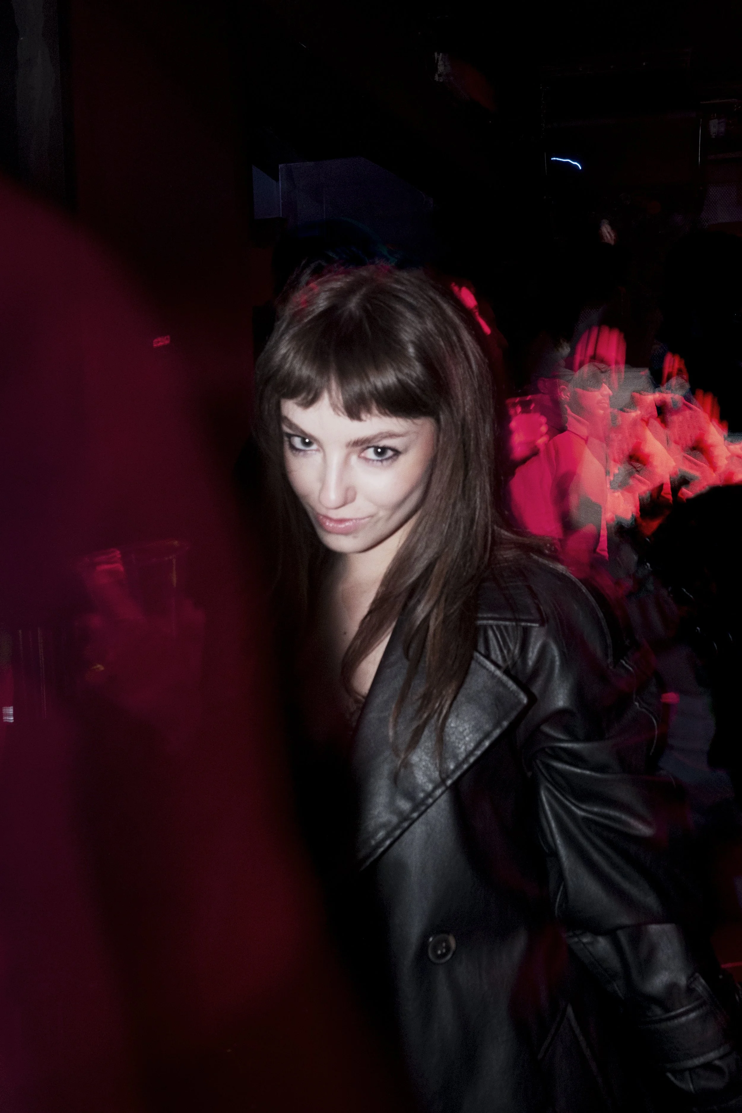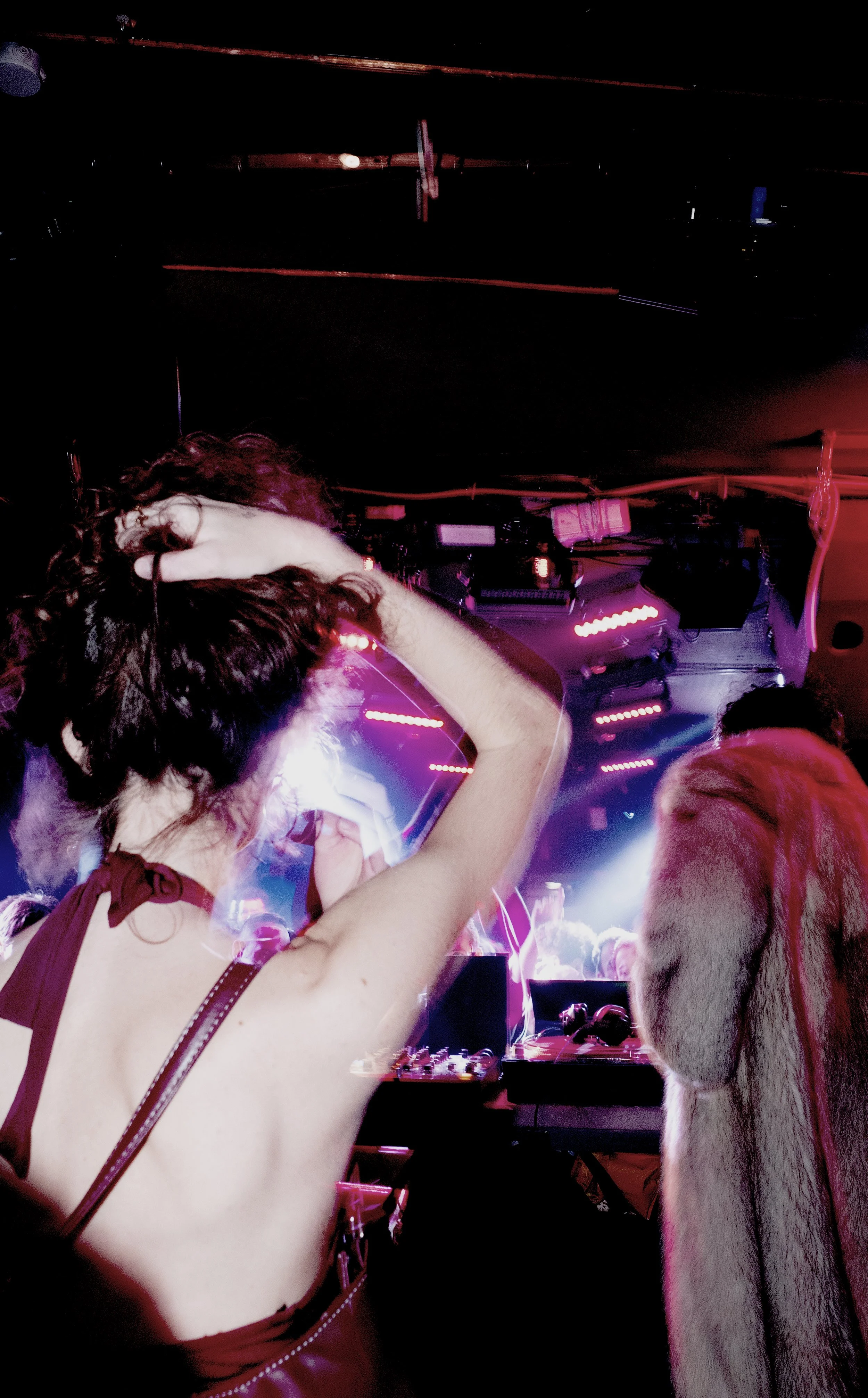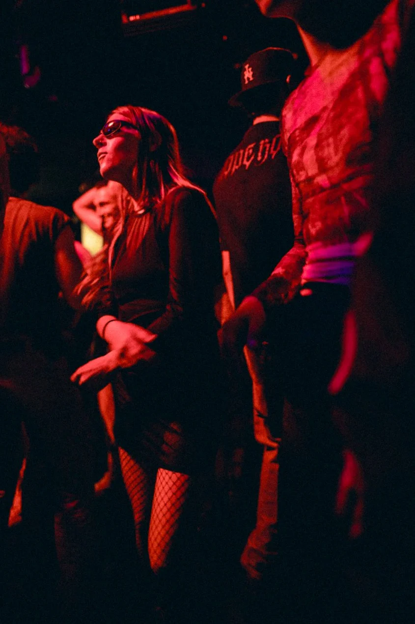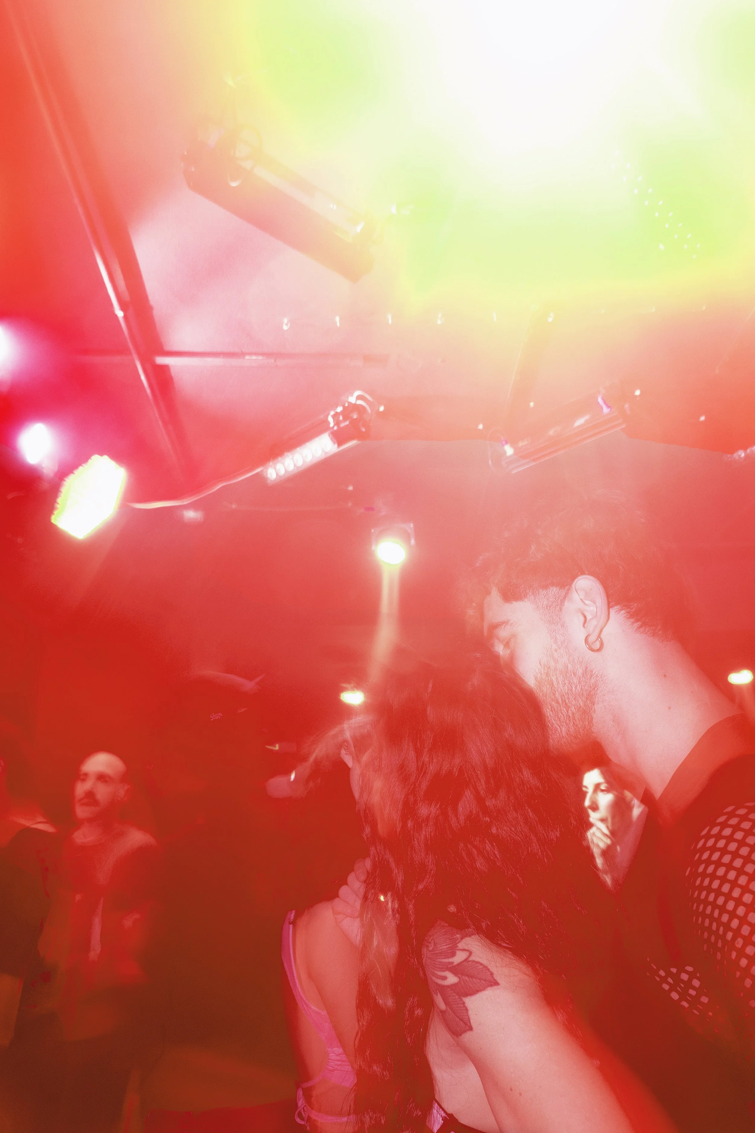 Persone che ballano in un nightclub al buio, con illuminazione rossa, una donna indossa cuffie da DJ e abbigliamento lucido