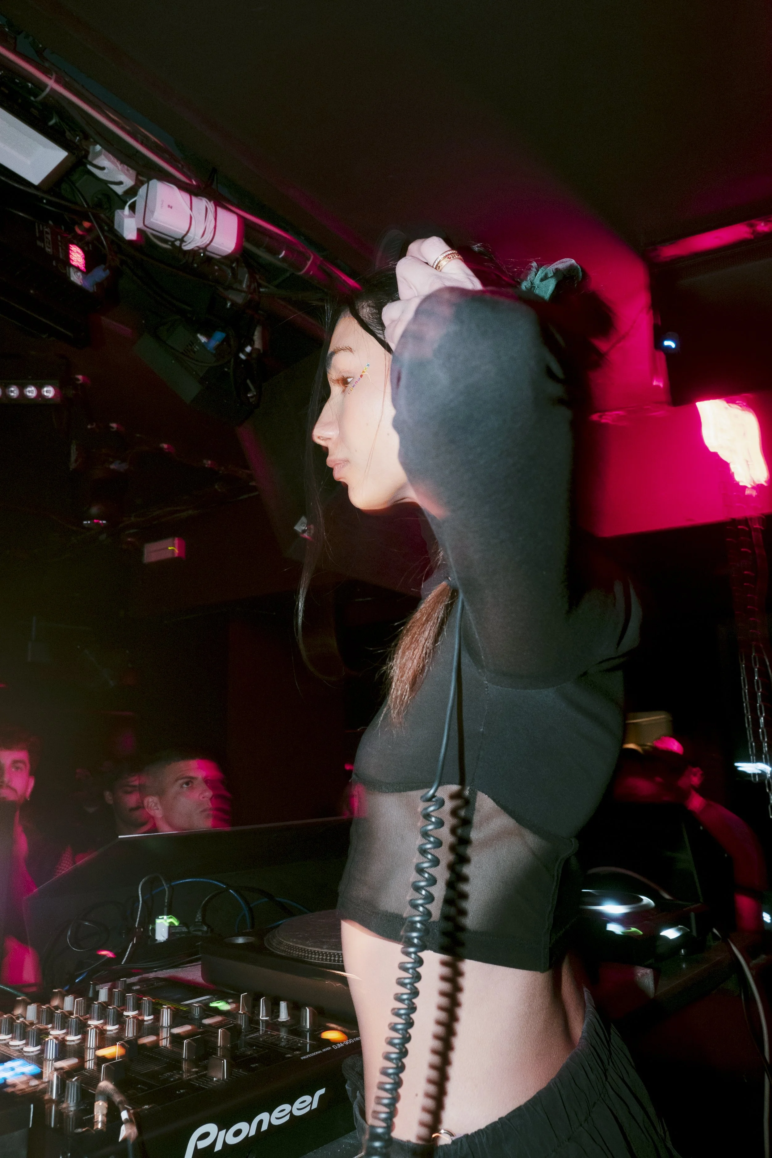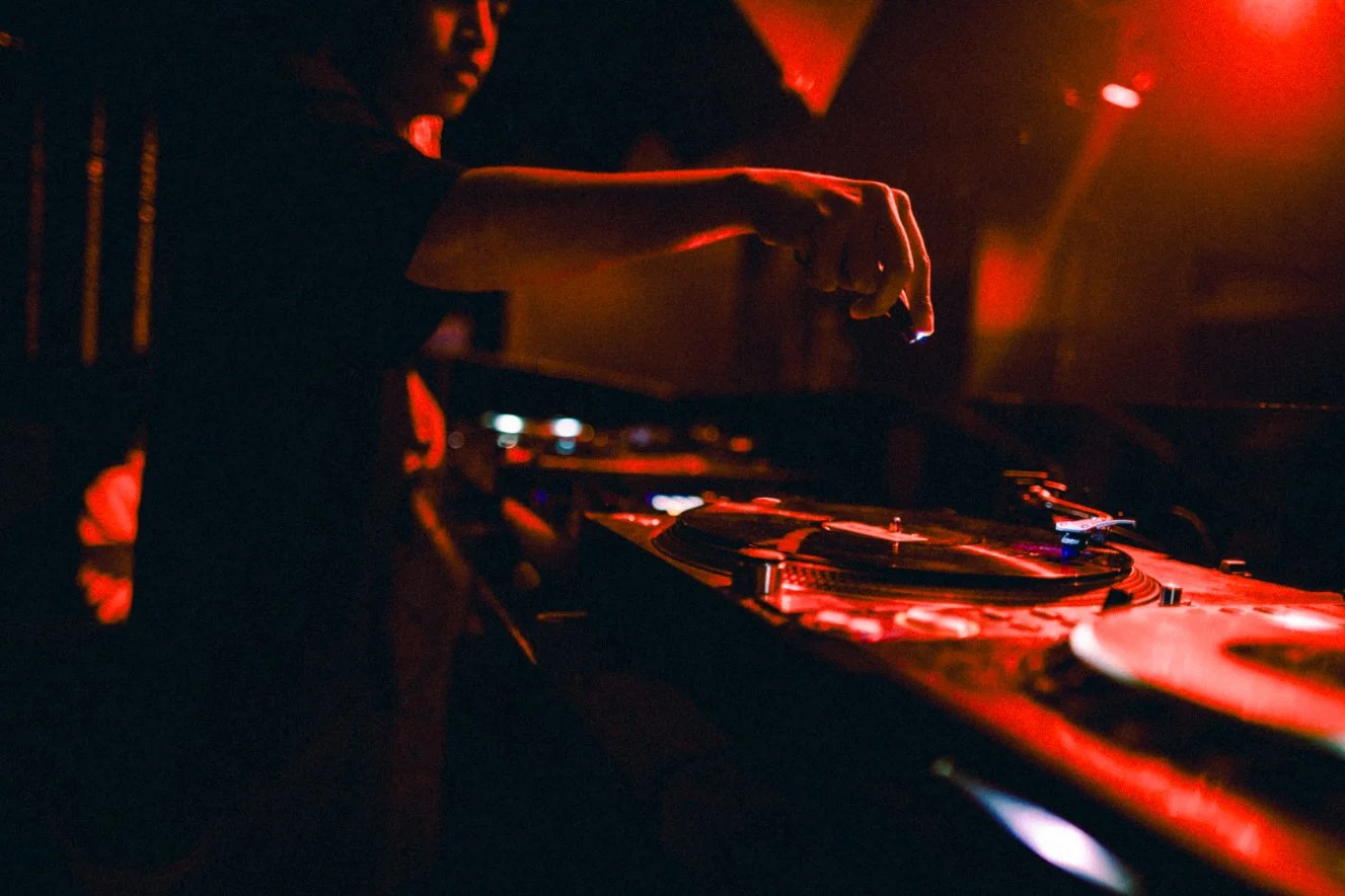 DJ che suona alla console in un club con luci rosse e un pubblico sullo sfondo.