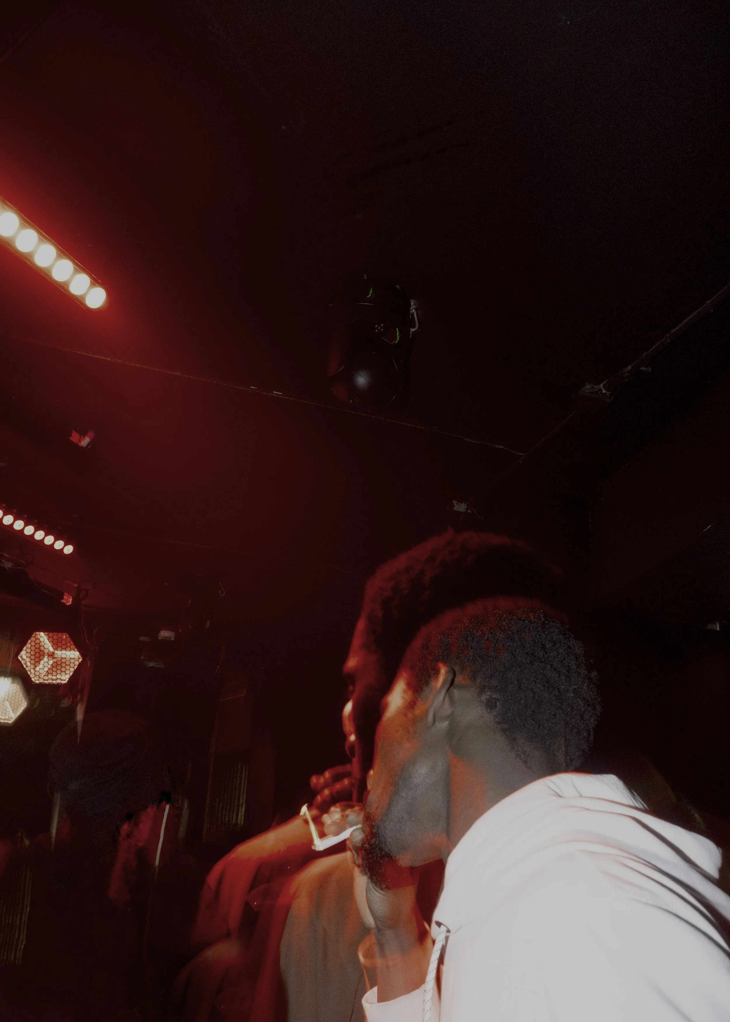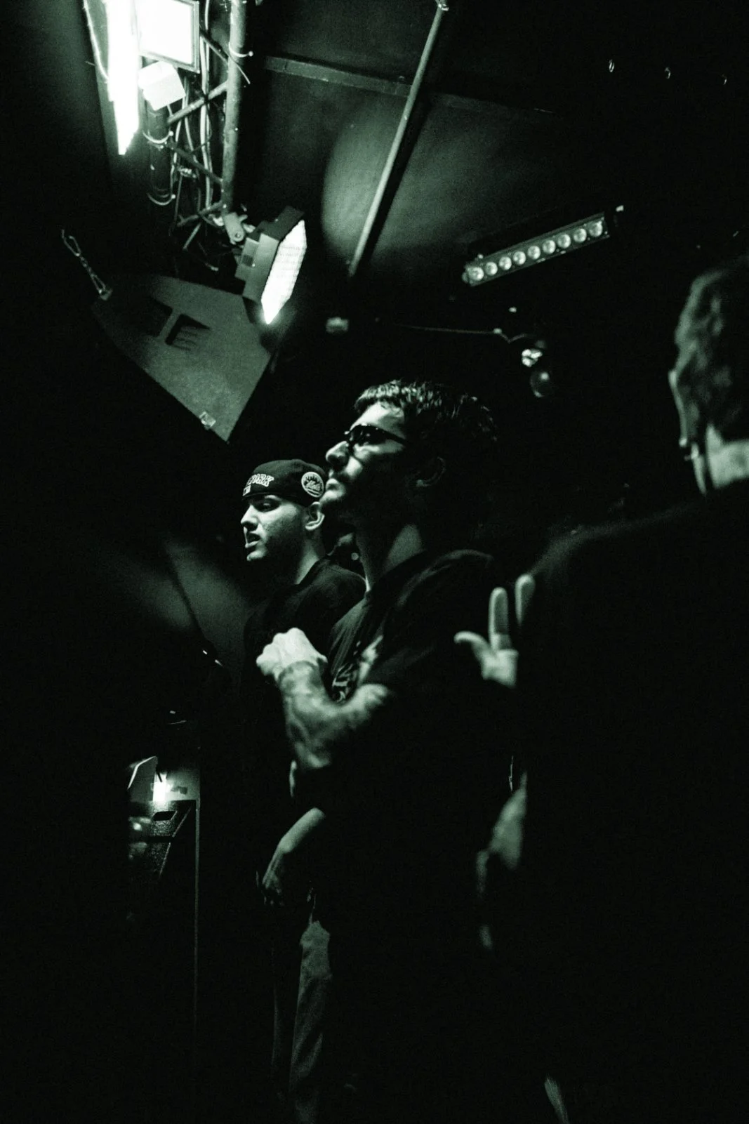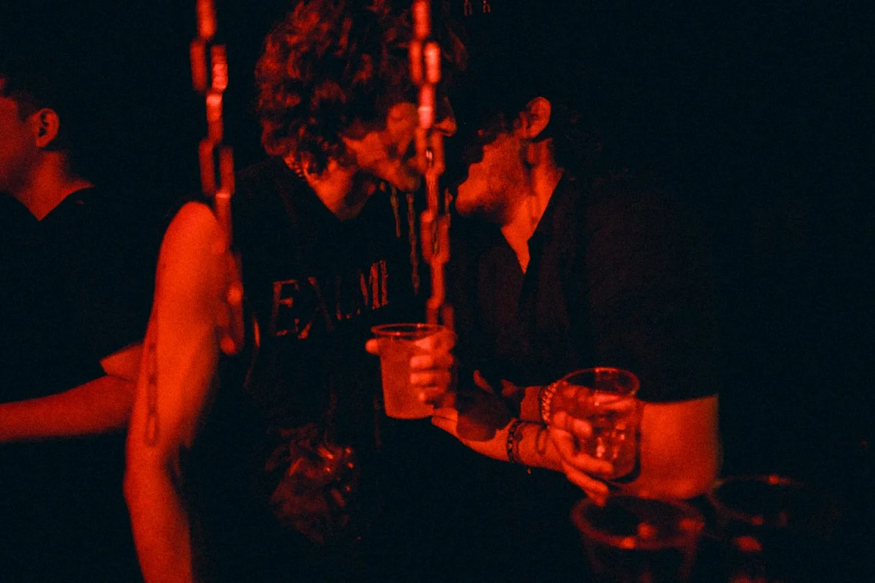 Due giovani uomini in un ambiente scuro, uno con cappello, che ascoltano musica o partecipano a un evento. Illuminazione soffusa con catene sospese visibili davanti.