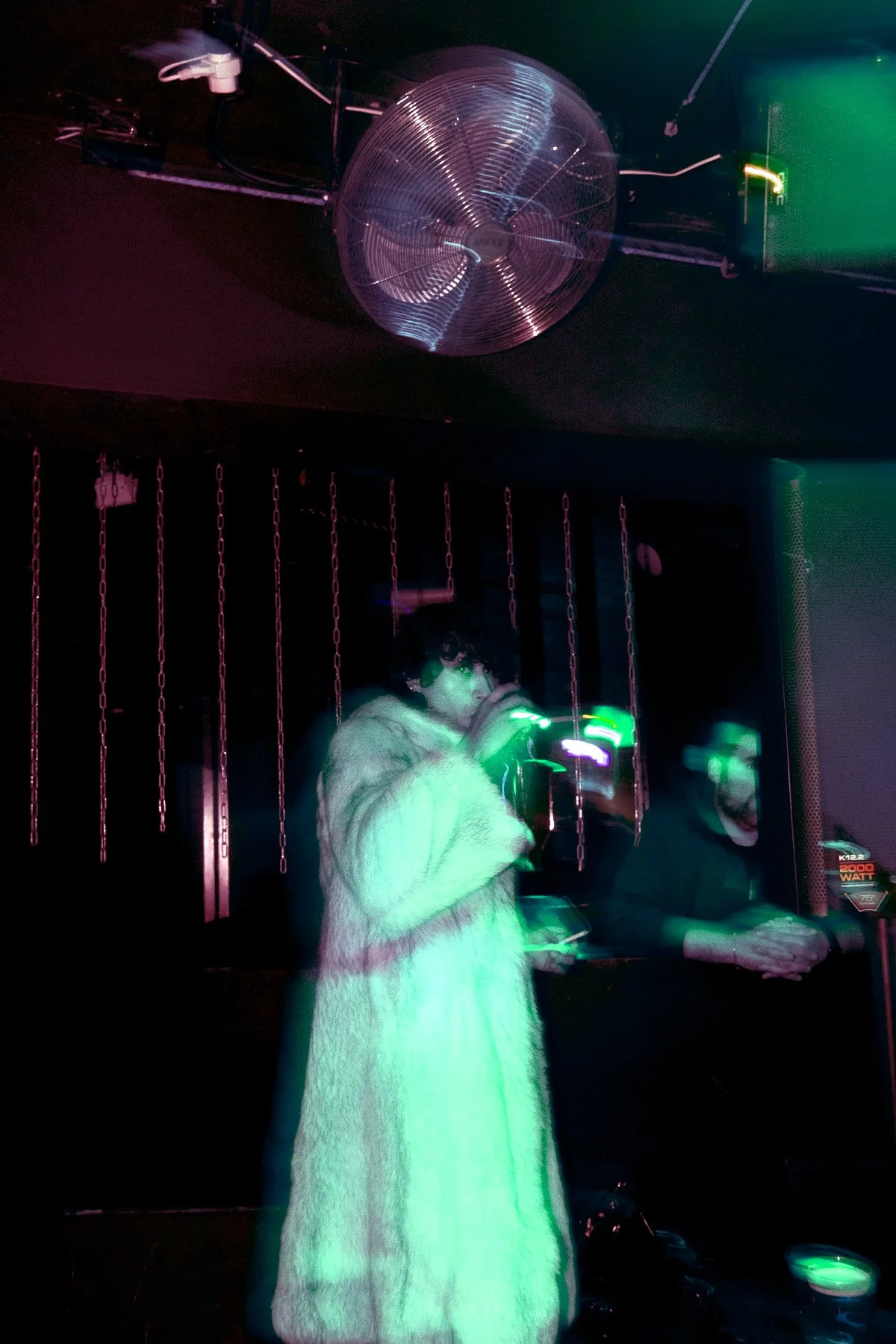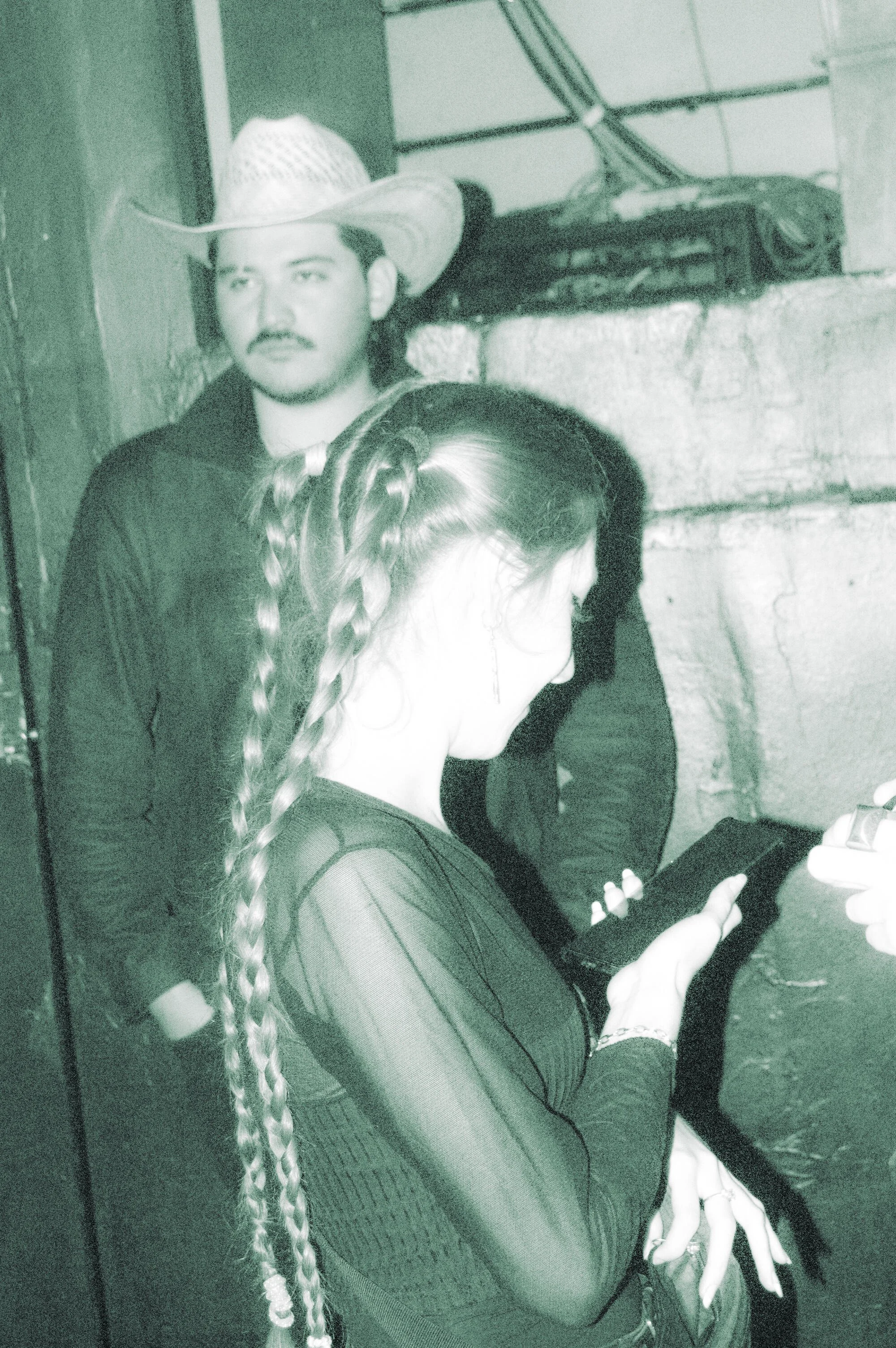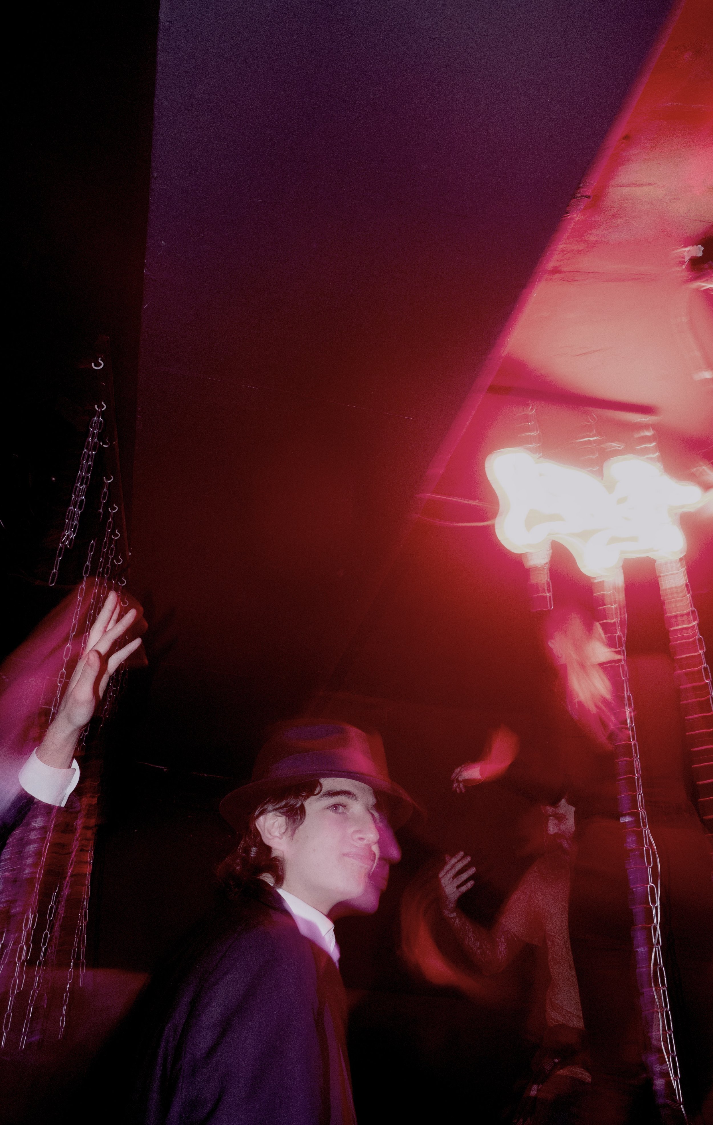 Due giovani uomini in un ambiente scuro, uno con cappello, che ascoltano musica o partecipano a un evento. Illuminazione soffusa con catene sospese visibili davanti.