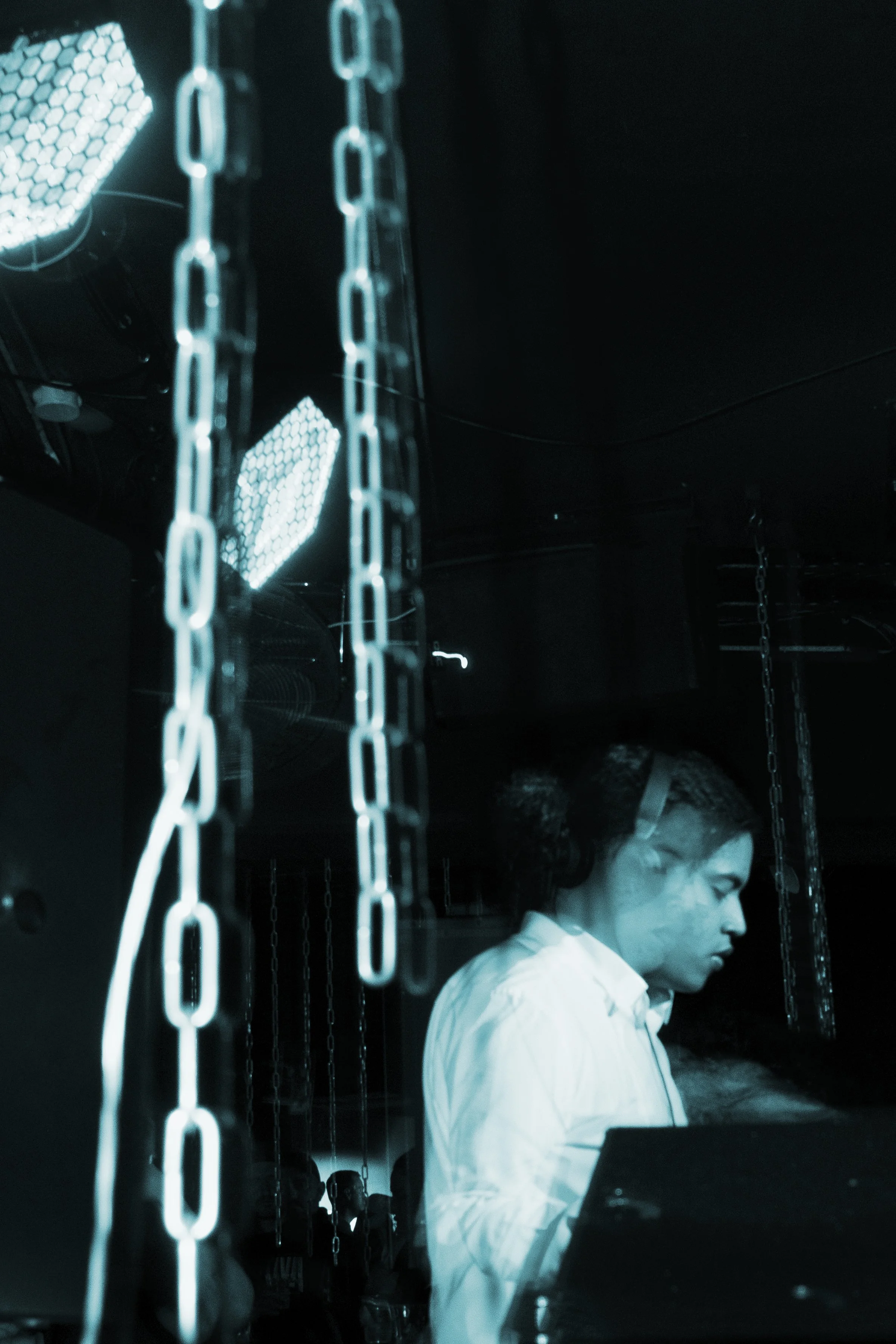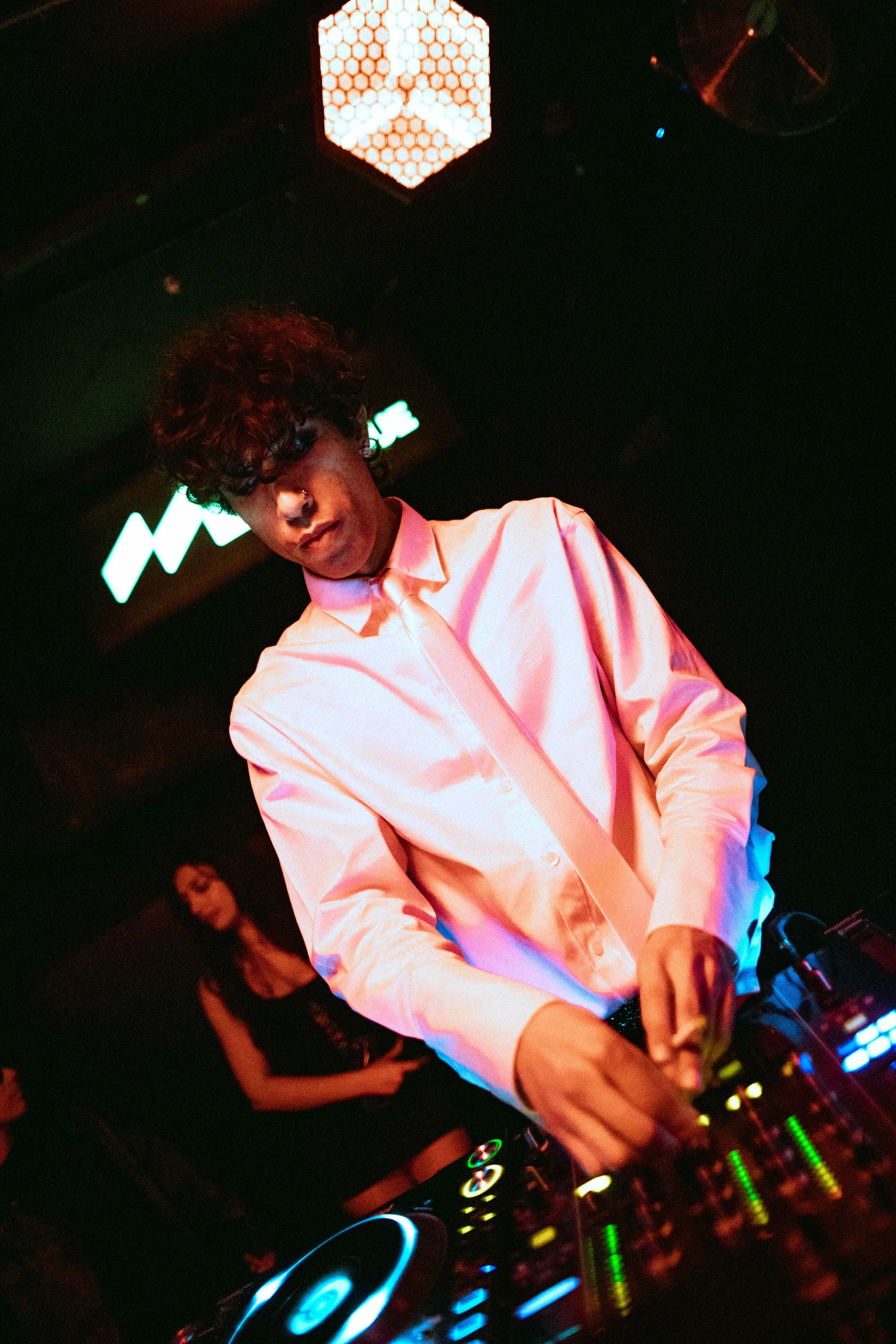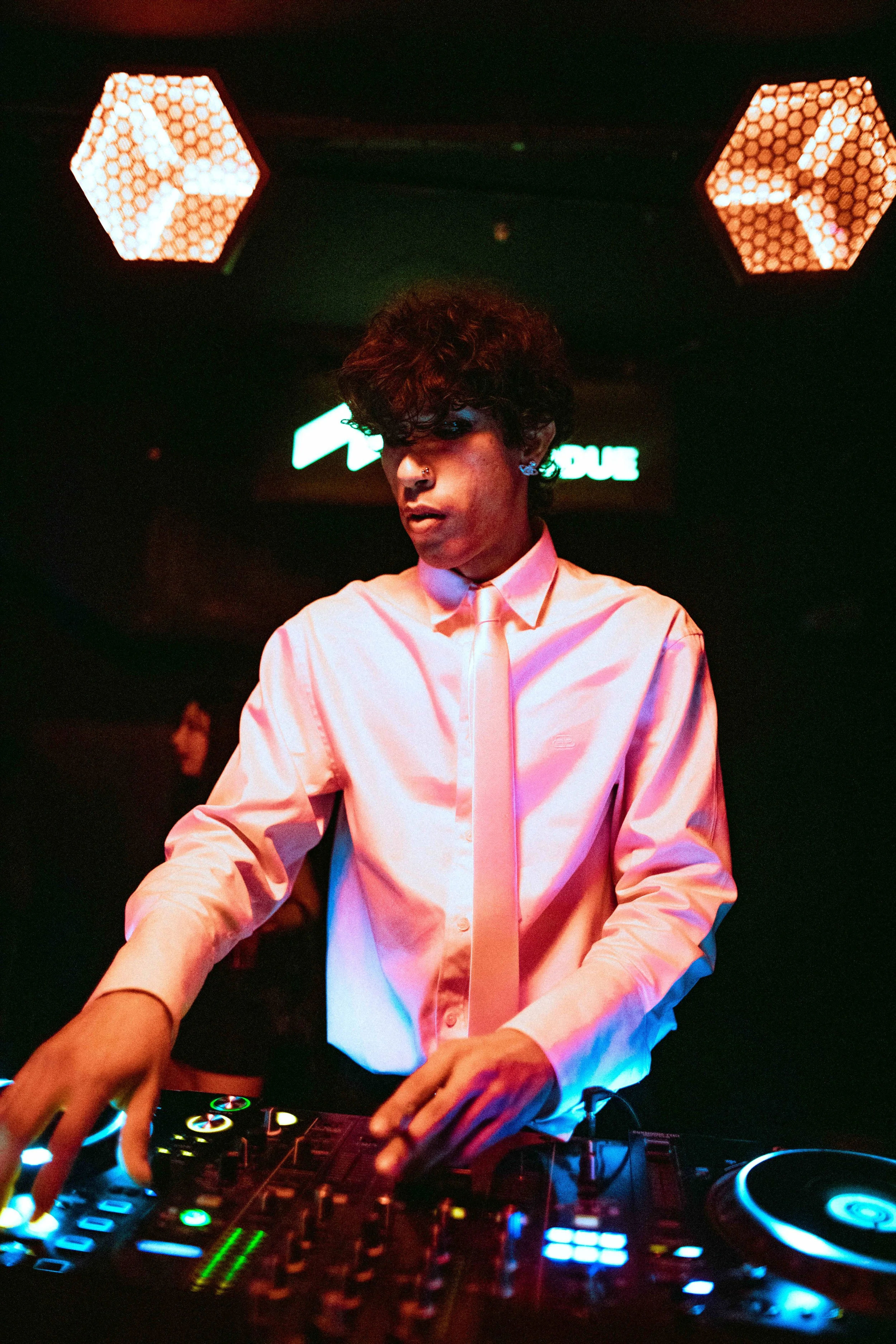 DJ con capelli riccioli scuri indossa camicia bianca e mixa musica in un club con luci colorate.