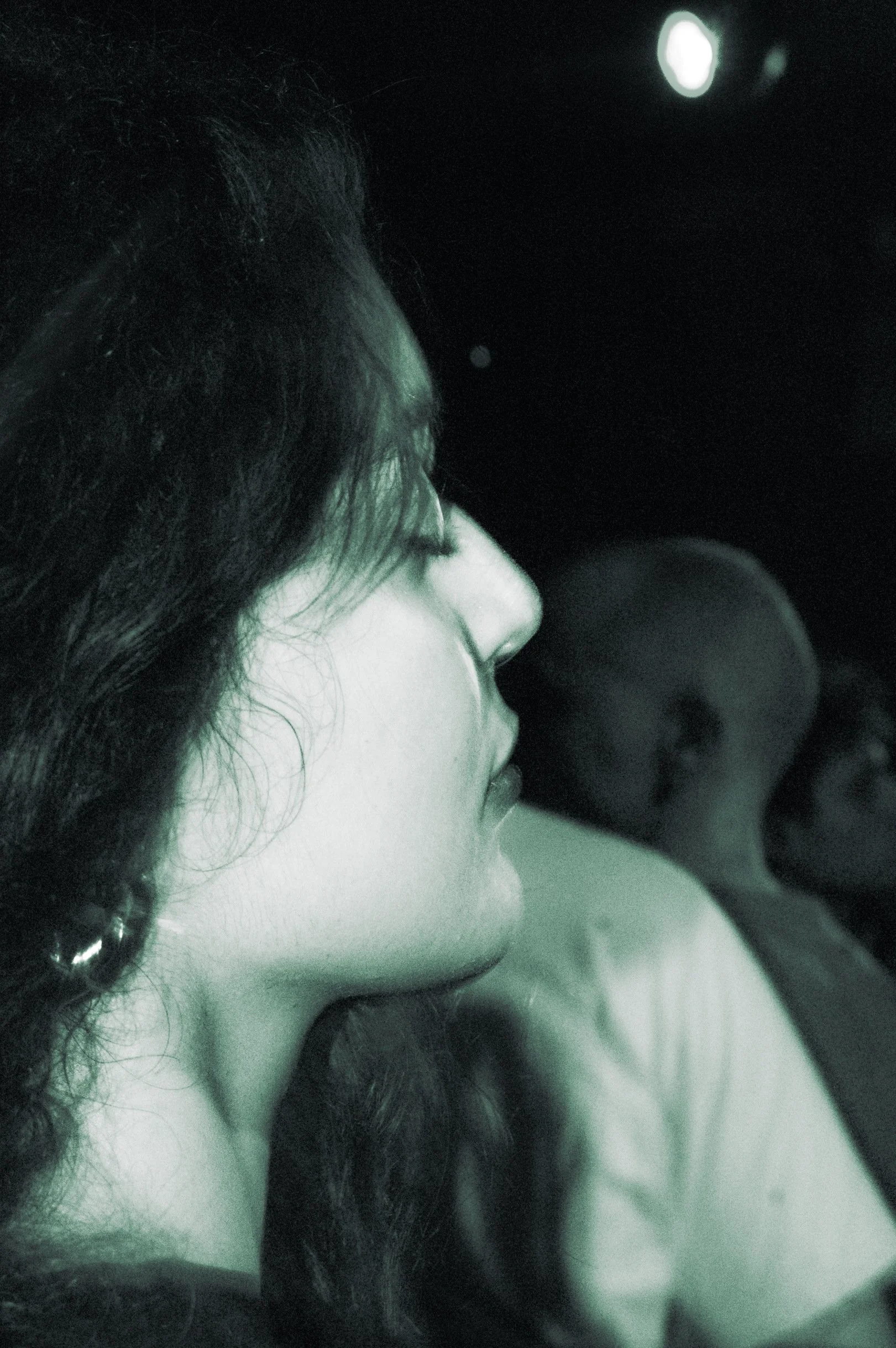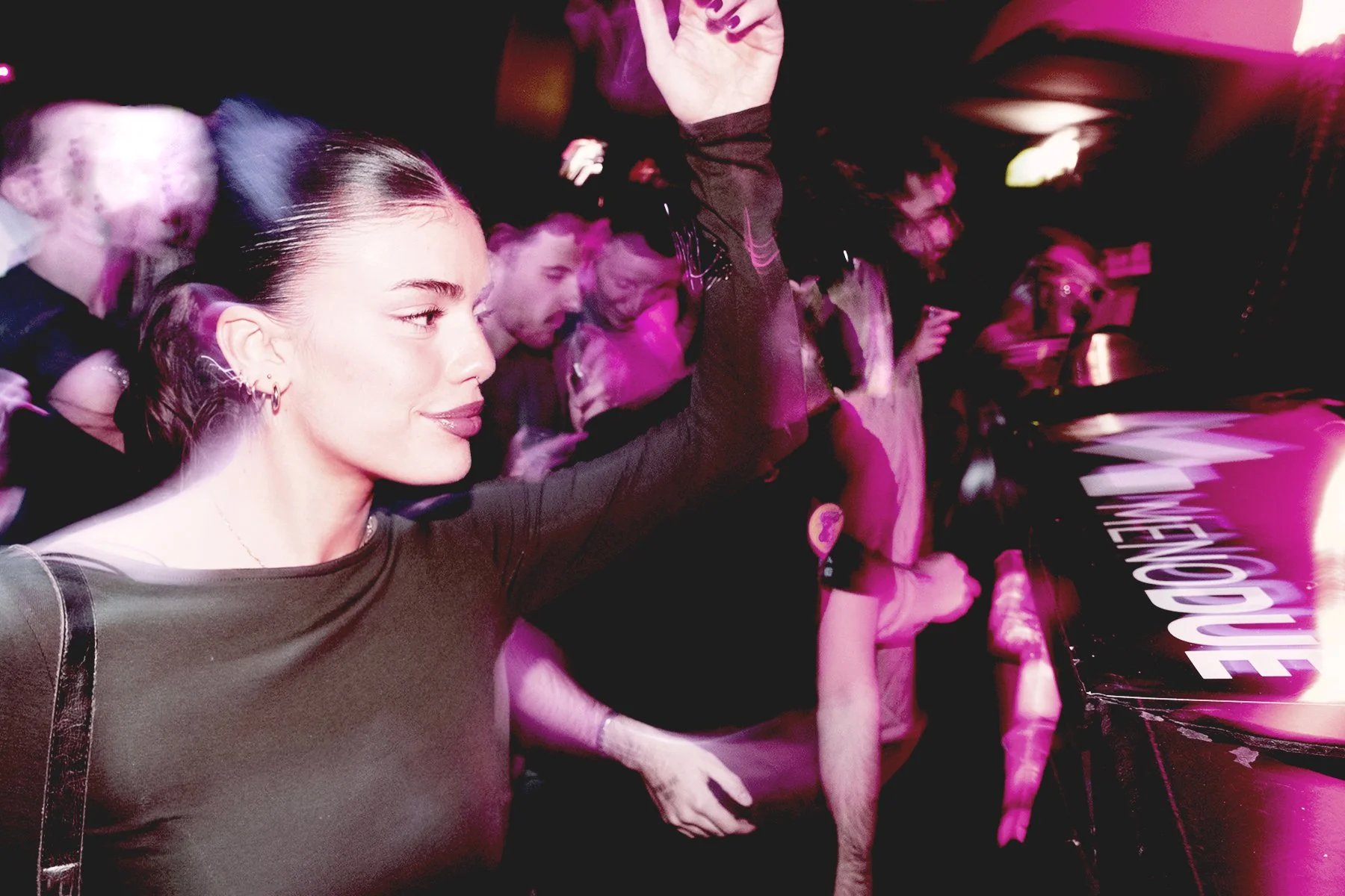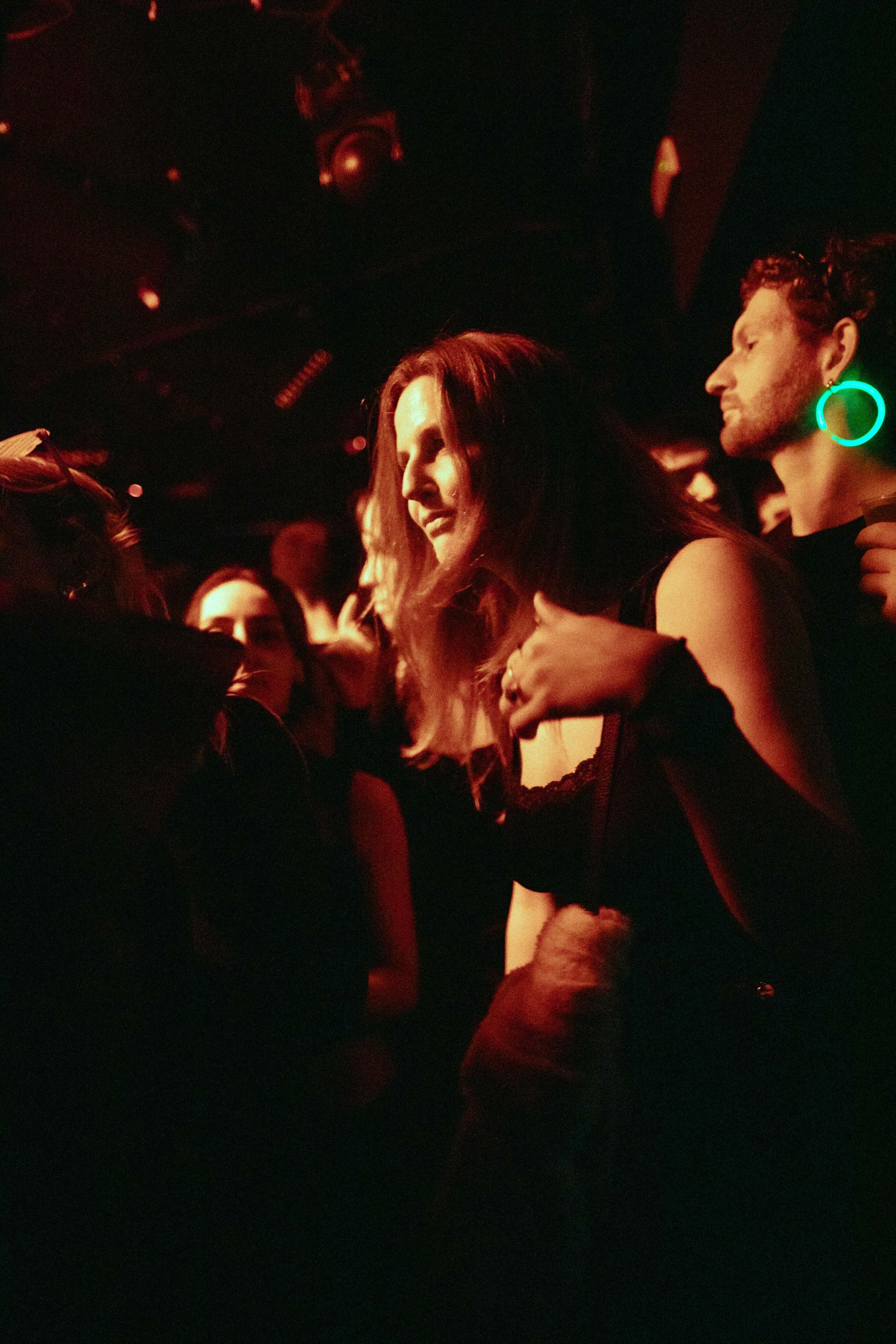 Una donna con i capelli lunghi e castani, vestita con una maglietta chiara, si trova in un ambiente oscuro con luci calde, circondata da altre persone in un luogo che sembra essere una discoteca o un concerto.