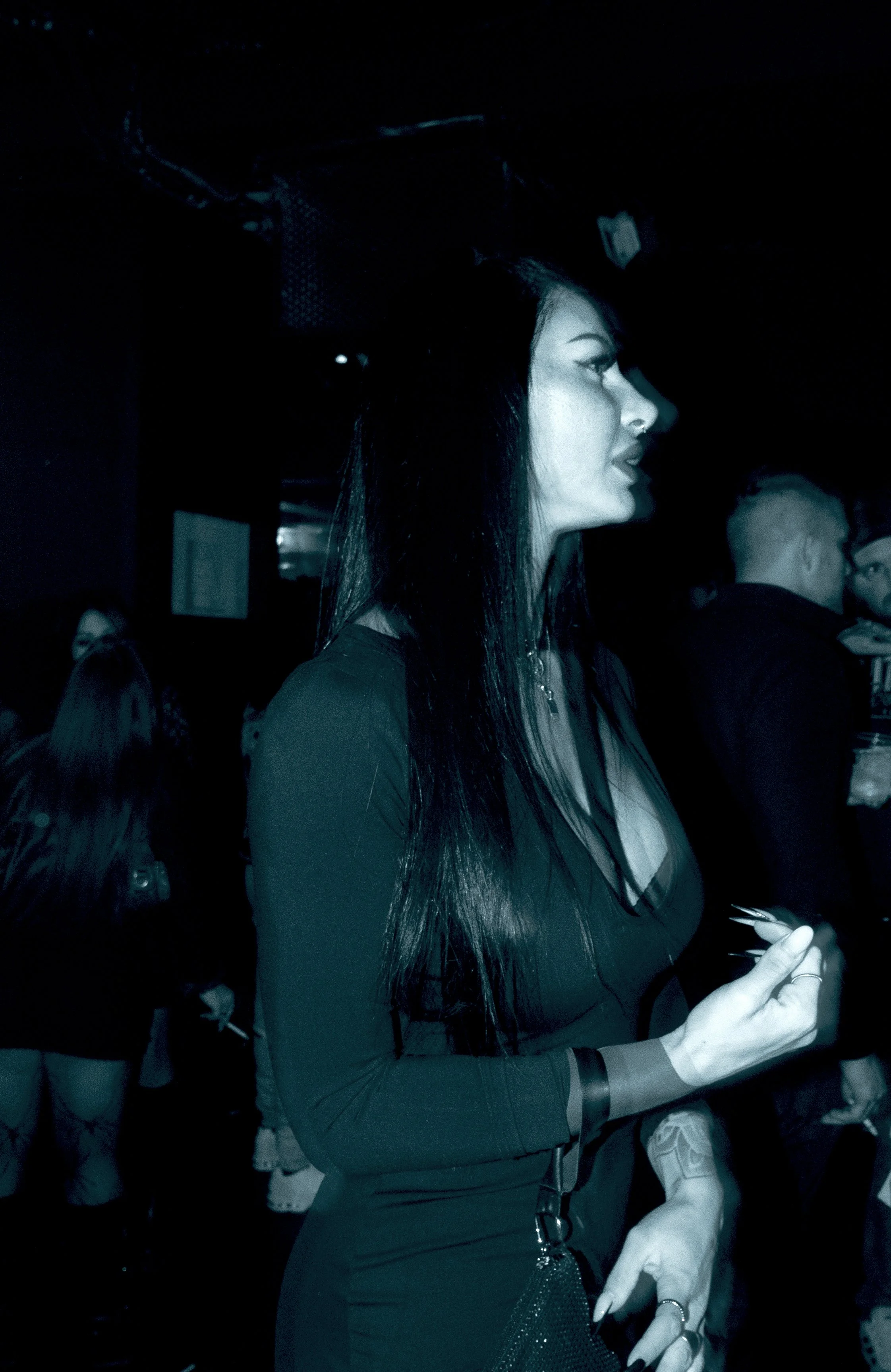 Una donna con capelli lunghi e trucco scuro, indossa una maglietta nera e una cintura con borchie, in un ambiente con luci basse e decorazioni retro, probabilmente un locale notturno o un bar.