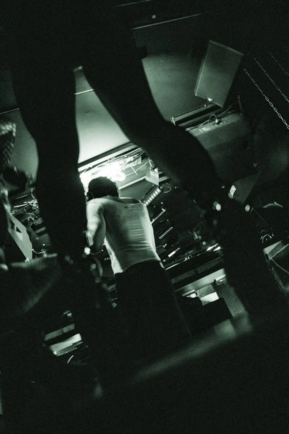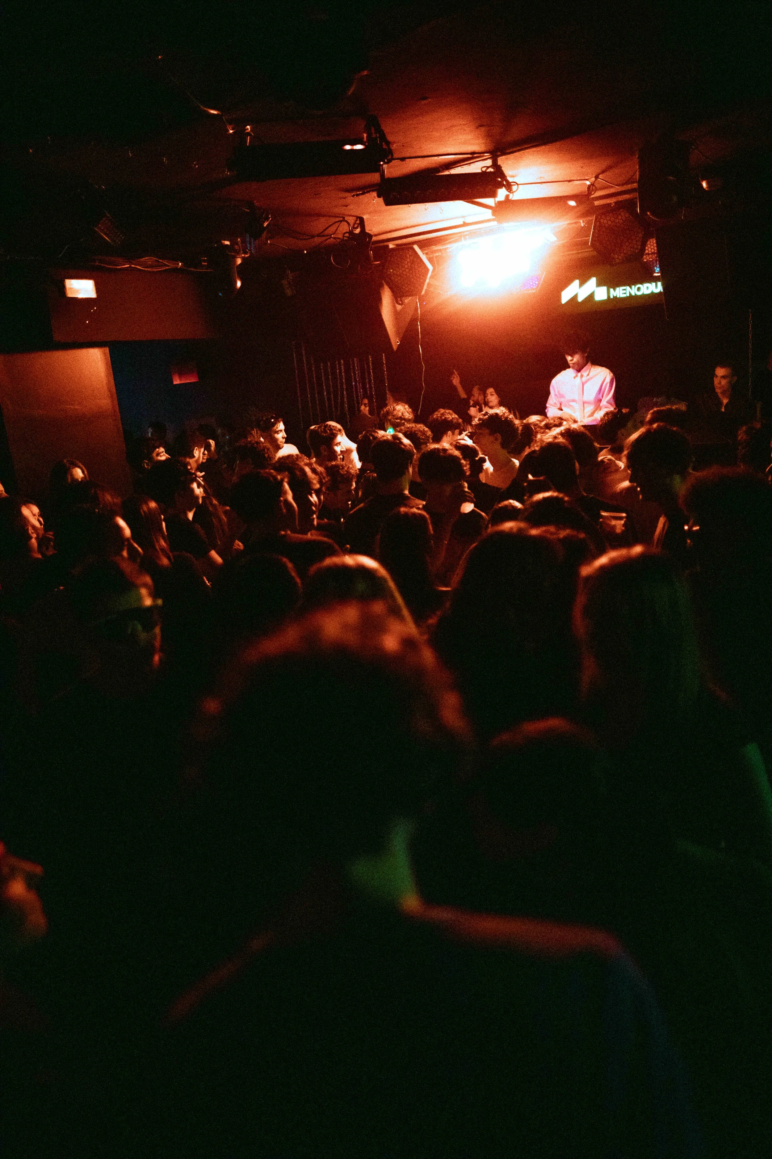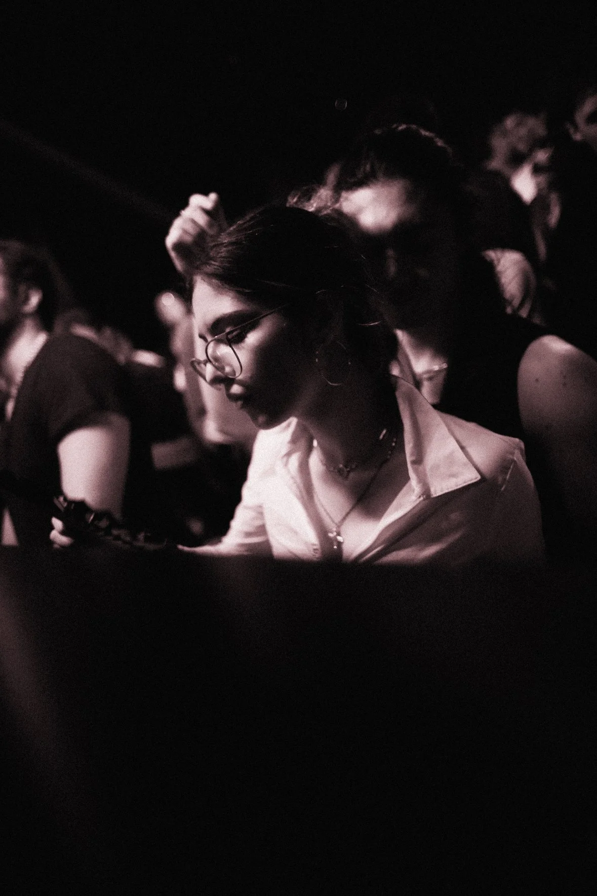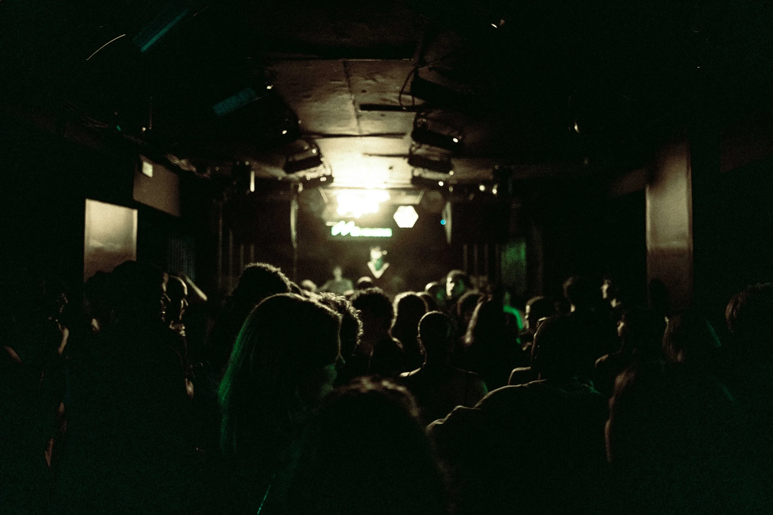 Pubblico seduto in un locale oscuro, probabilmente un club o un teatro, con luci puntate sul palcoscenico o sulla scena davanti a loro