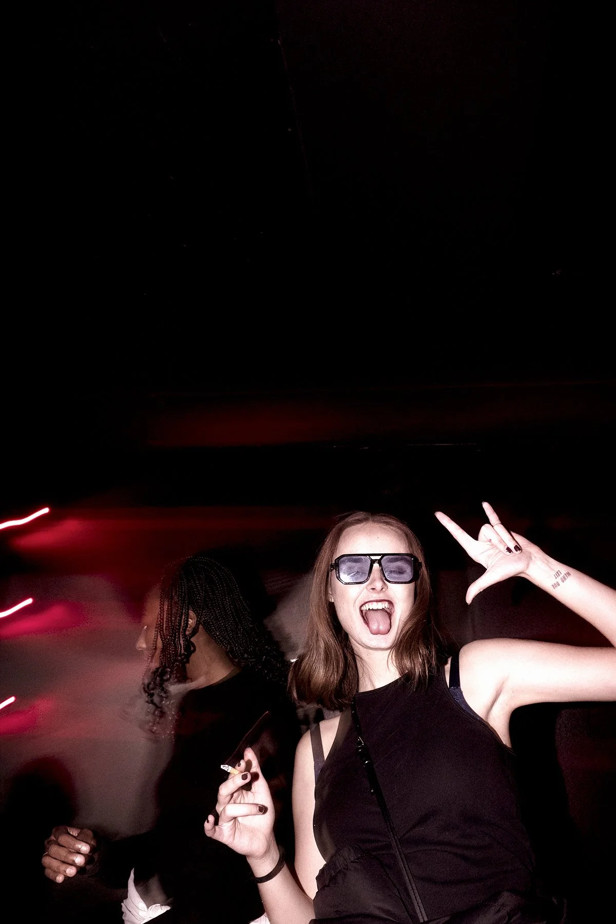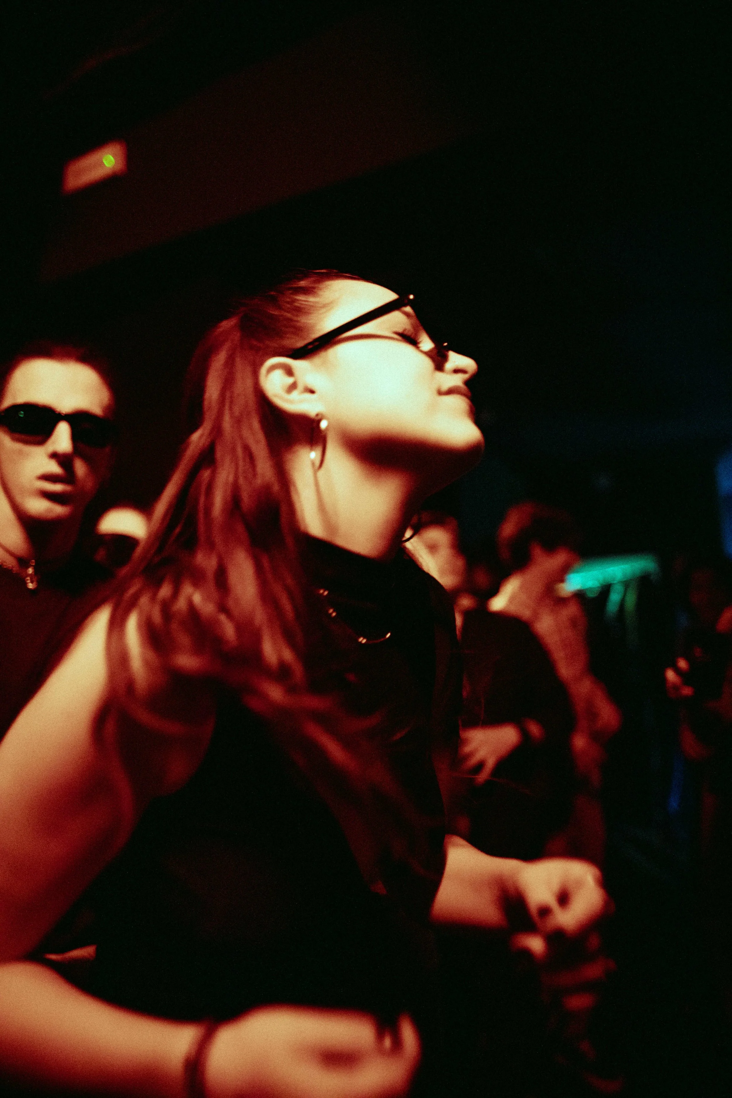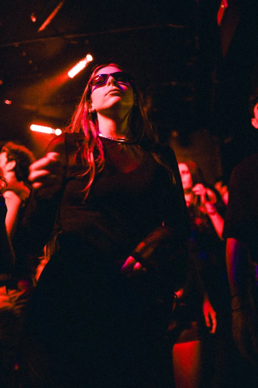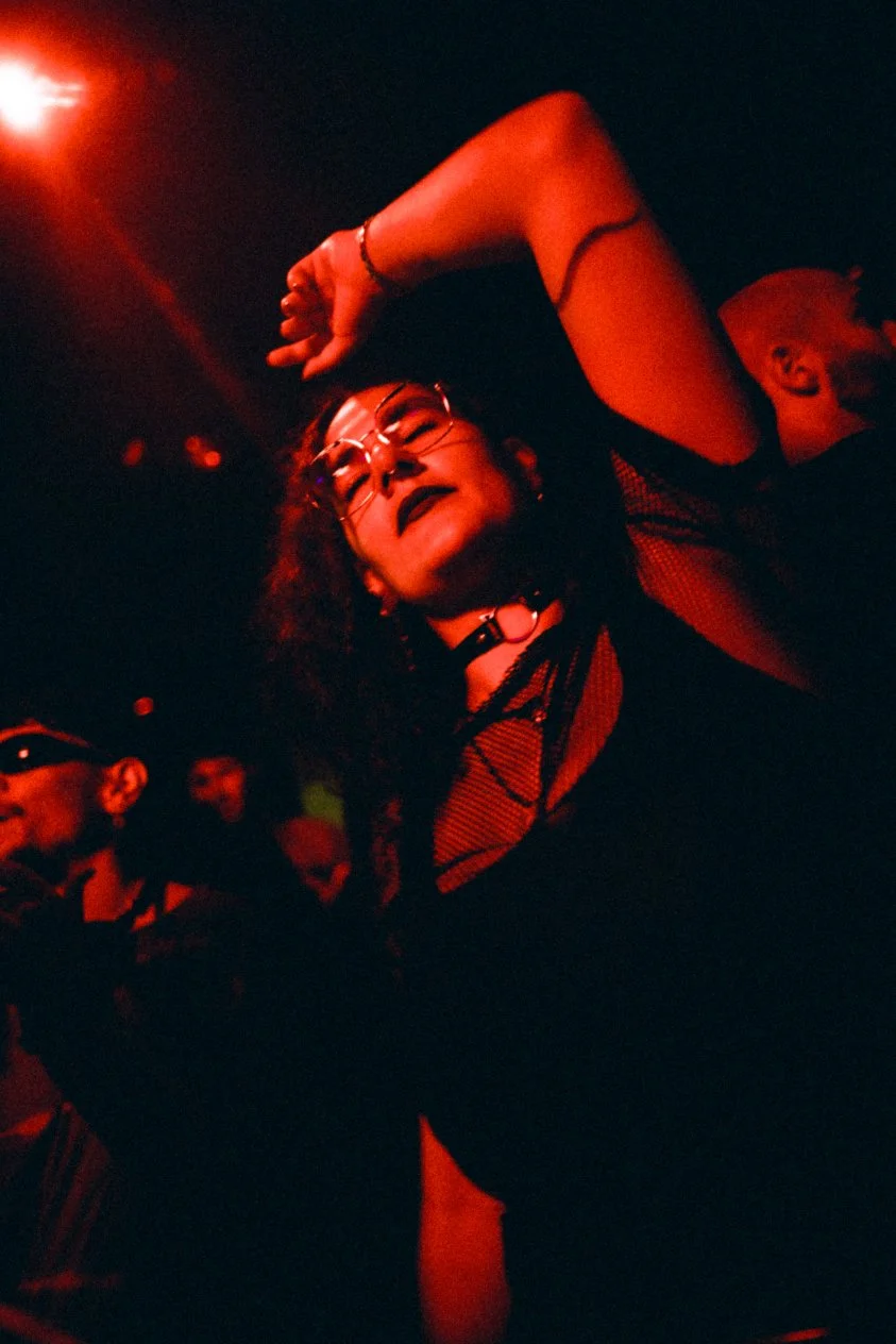 Ragazza con occhiali e orecchini, con la testa all'indietro, in un ambiente con illuminazione soffusa rossa, forse una discoteca o un concerto, con altre persone sullo sfondo.