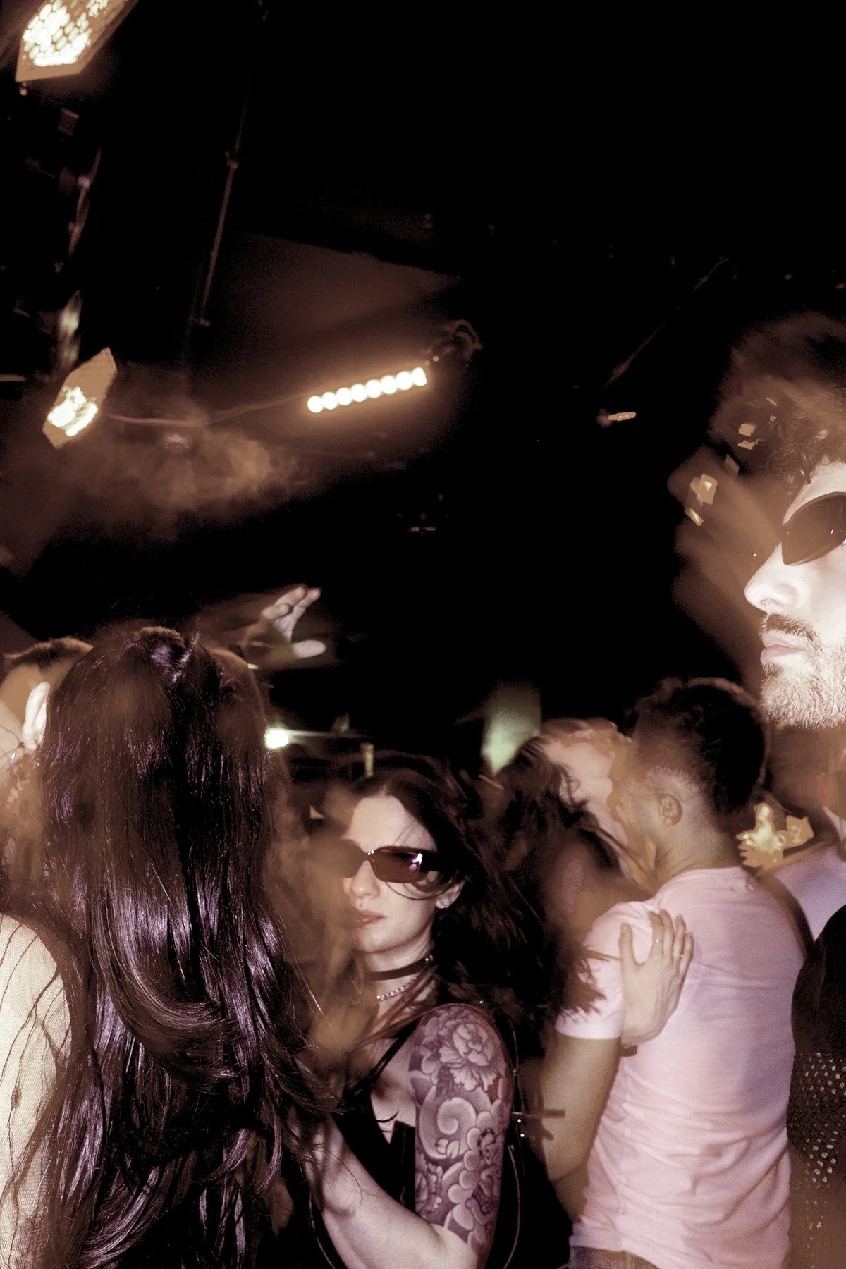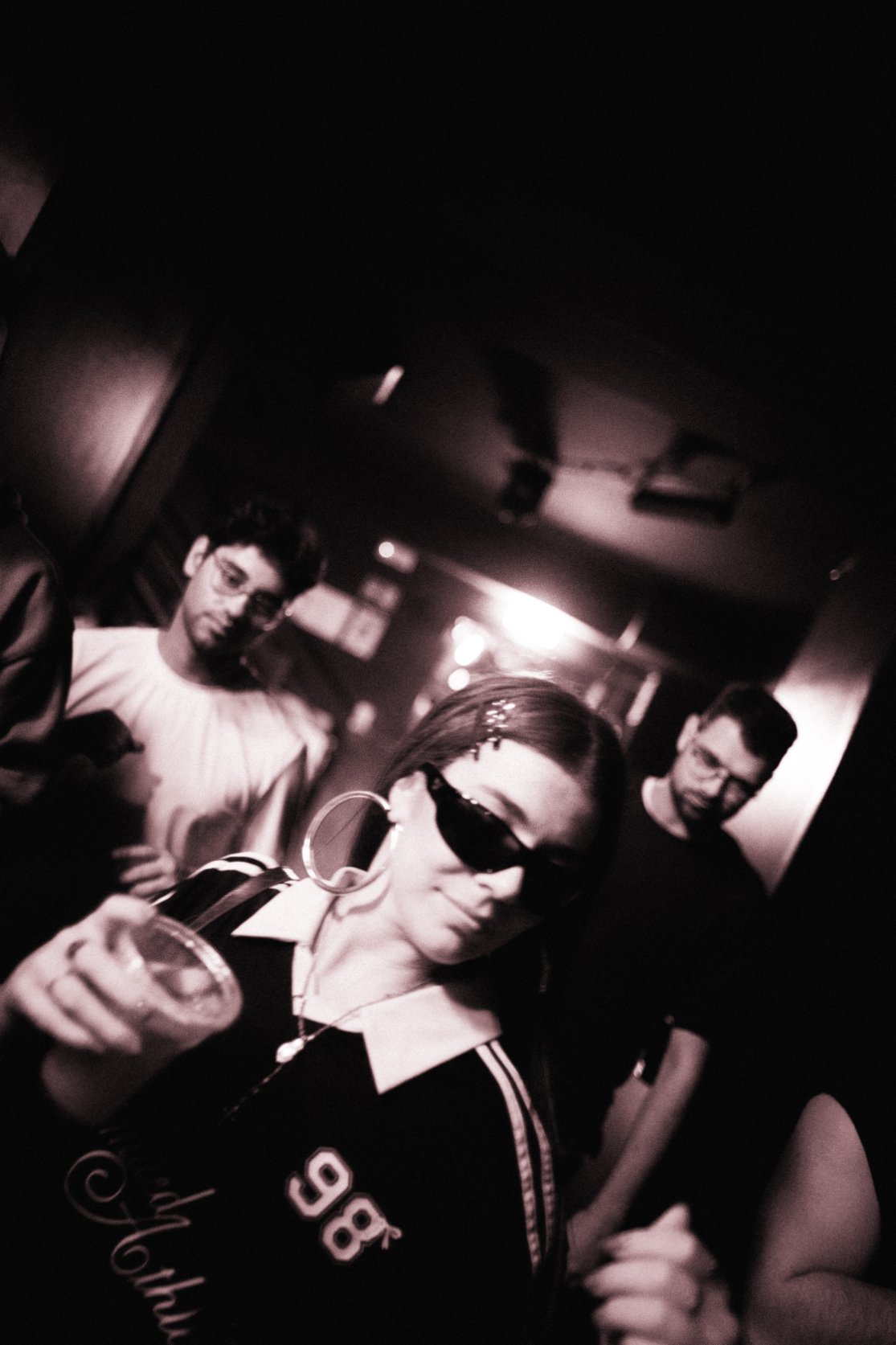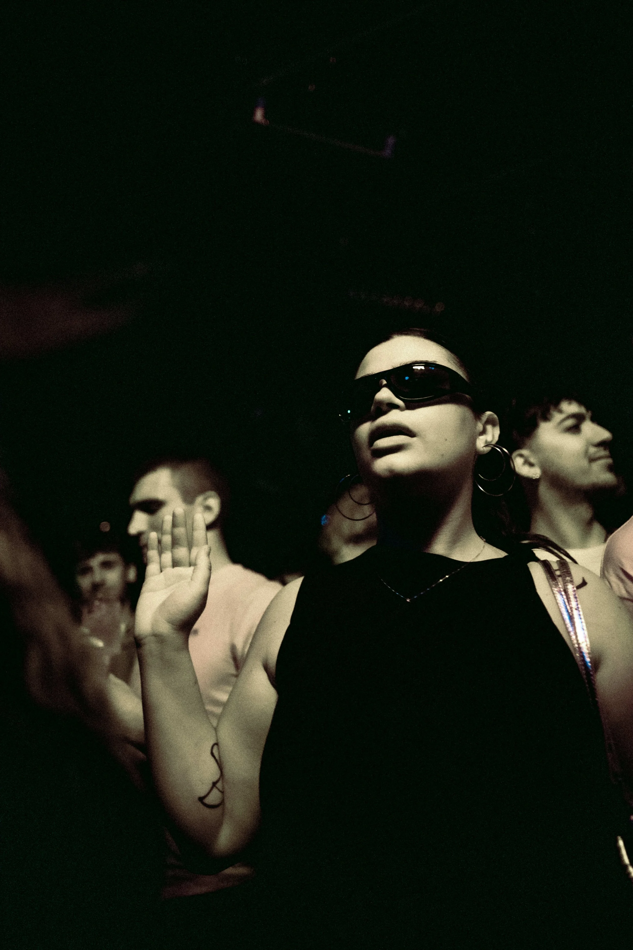 Gruppo di persone al nightclub, alcune con occhiali da sole, illuminazione soffusa, atmosfera da festa