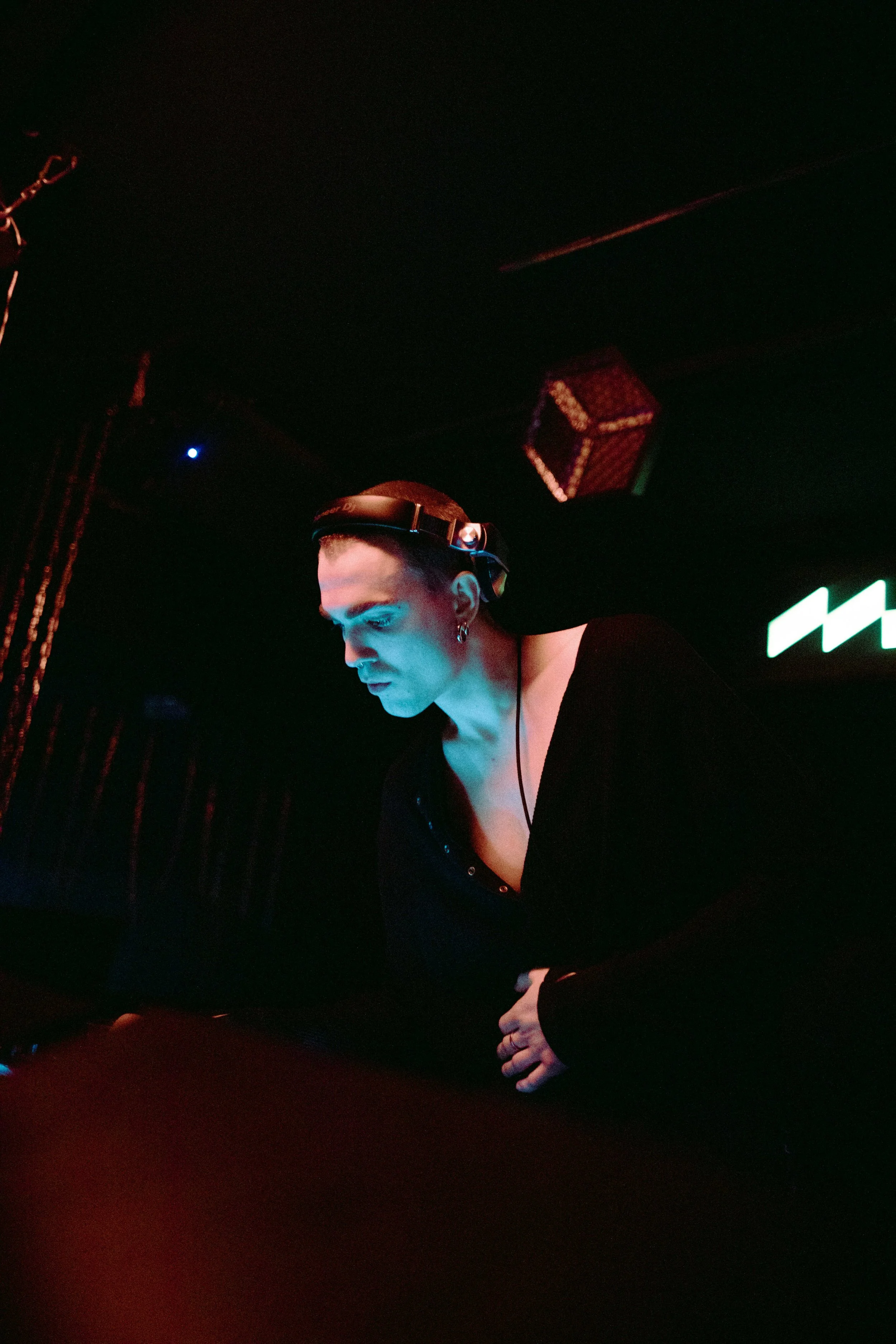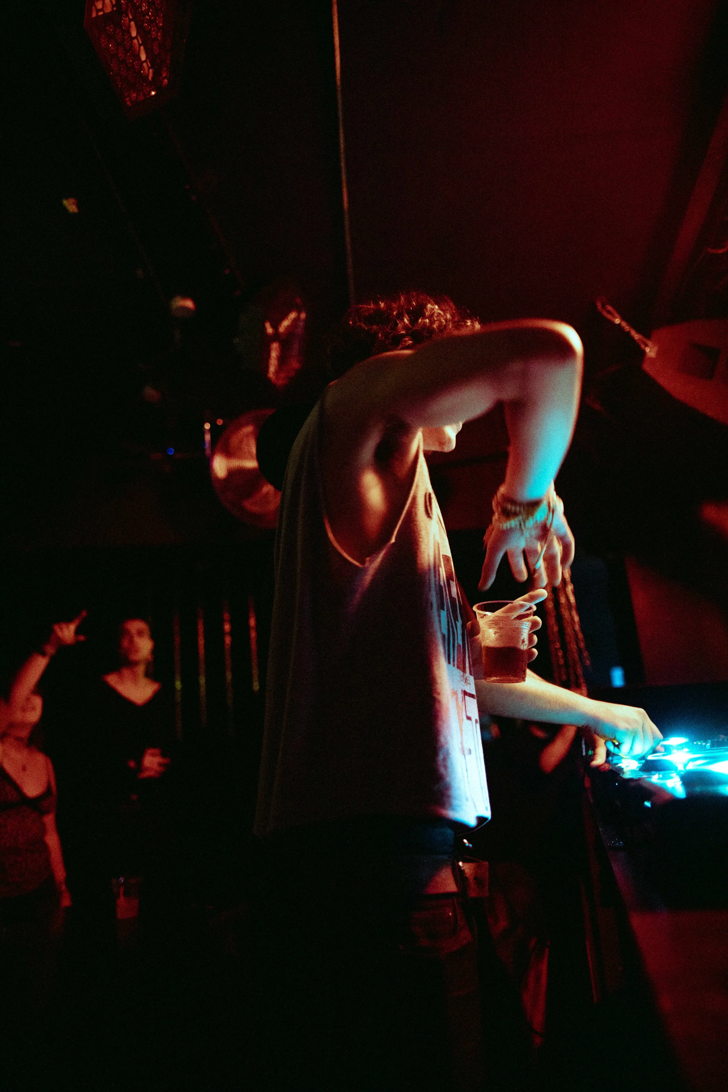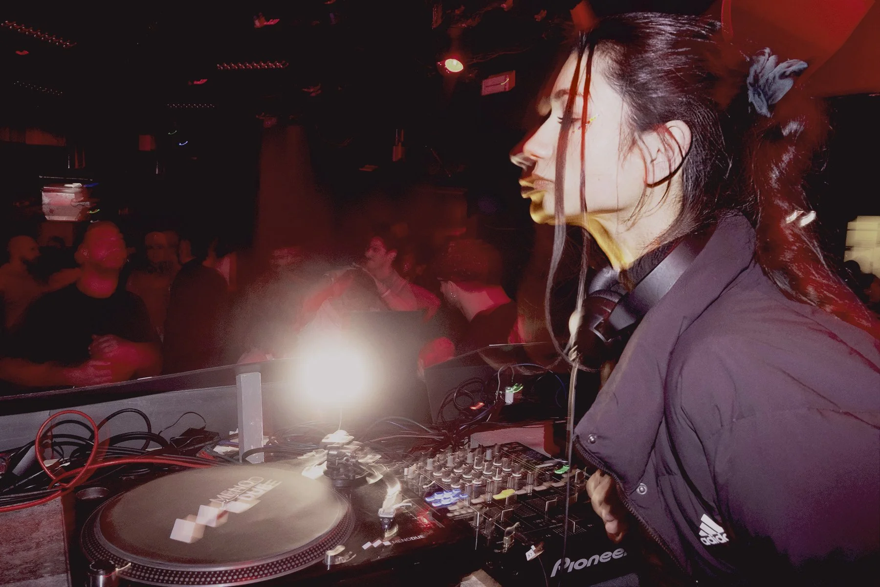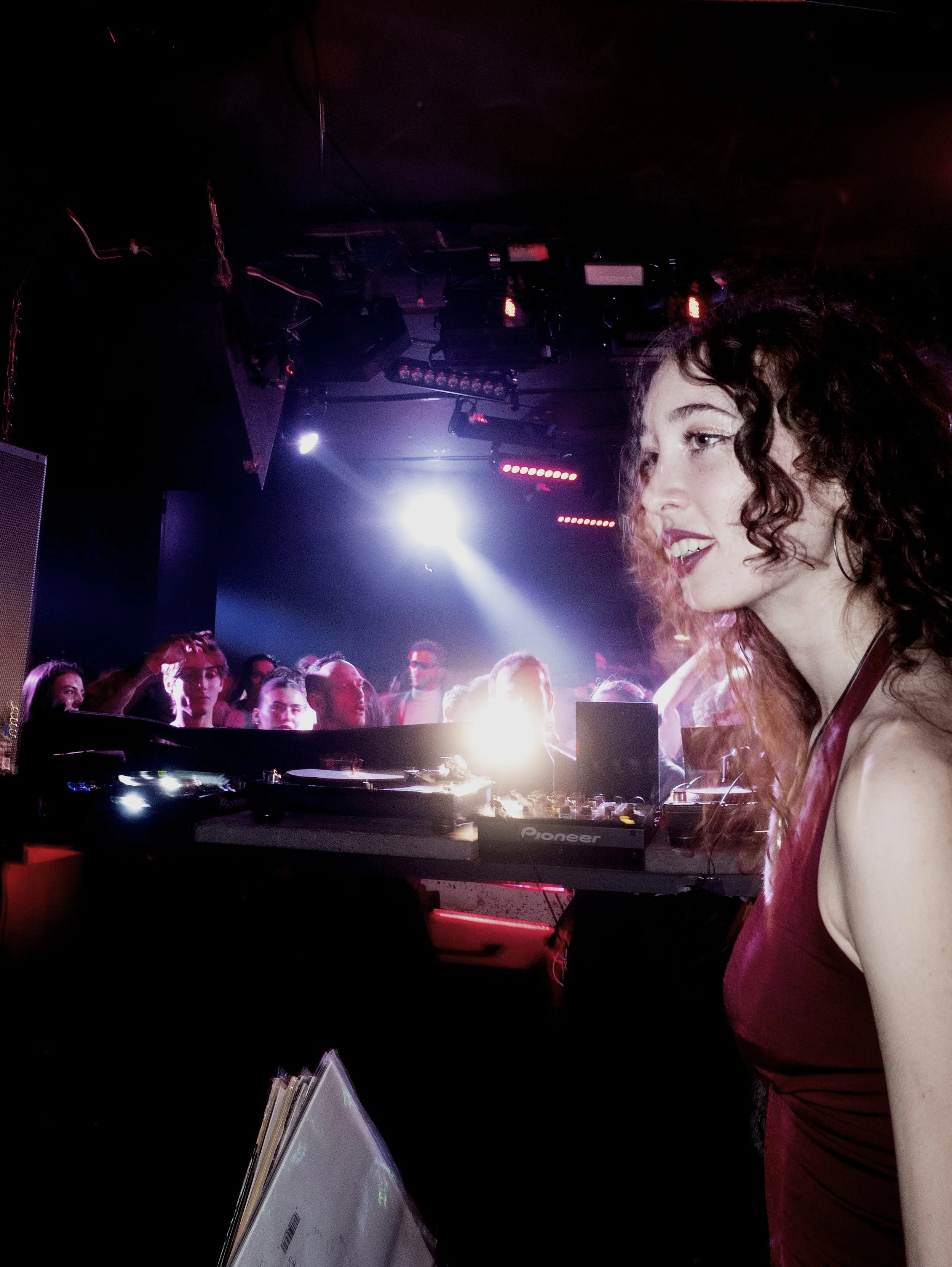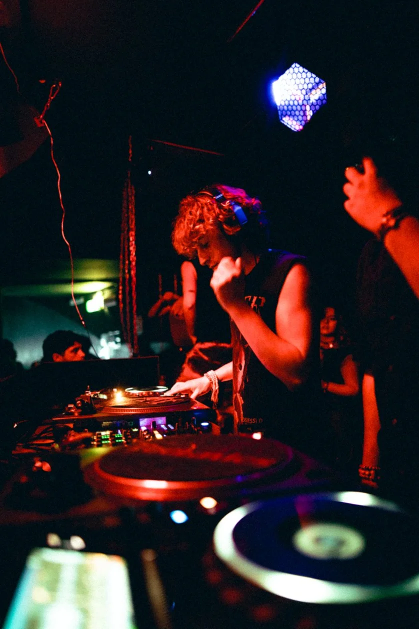 DJ con cuffie in un nightclub, illuminazione rossa e blu, persona con capelli ricci biondi che si muove mentre mixa musica, pubblico sullo sfondo.