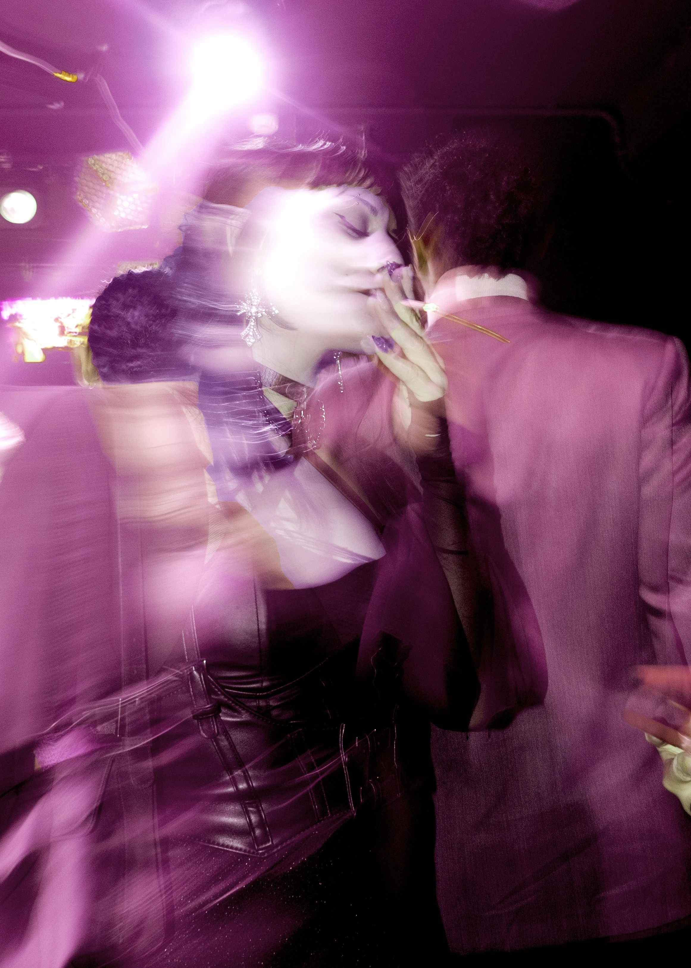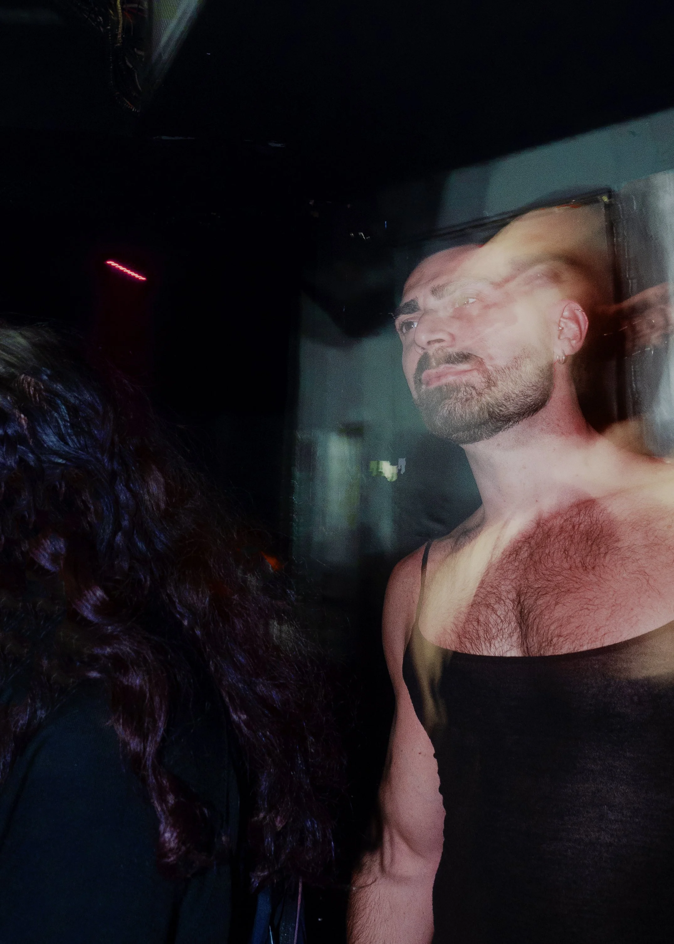 Due persone vestite con abiti di rete e accessori vestiti in un ambiente scuro con luci rosse, in posa sensuale.