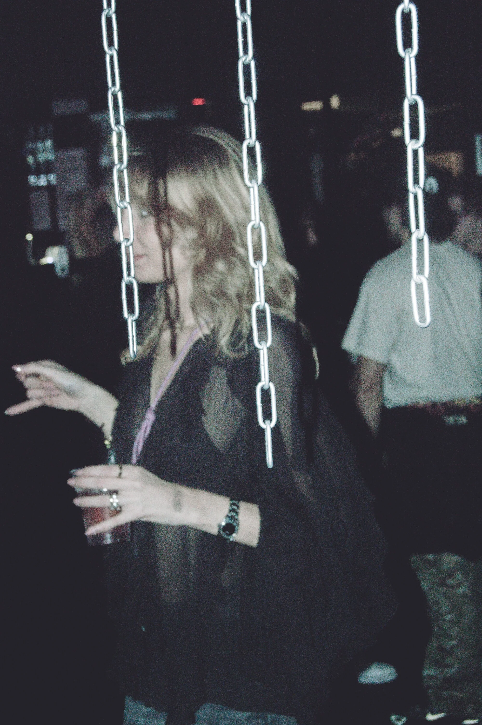 Donna con occhi chiusi seduta su un’altalena in un ambiente illuminato da luci calde, con altre persone sullo sfondo.