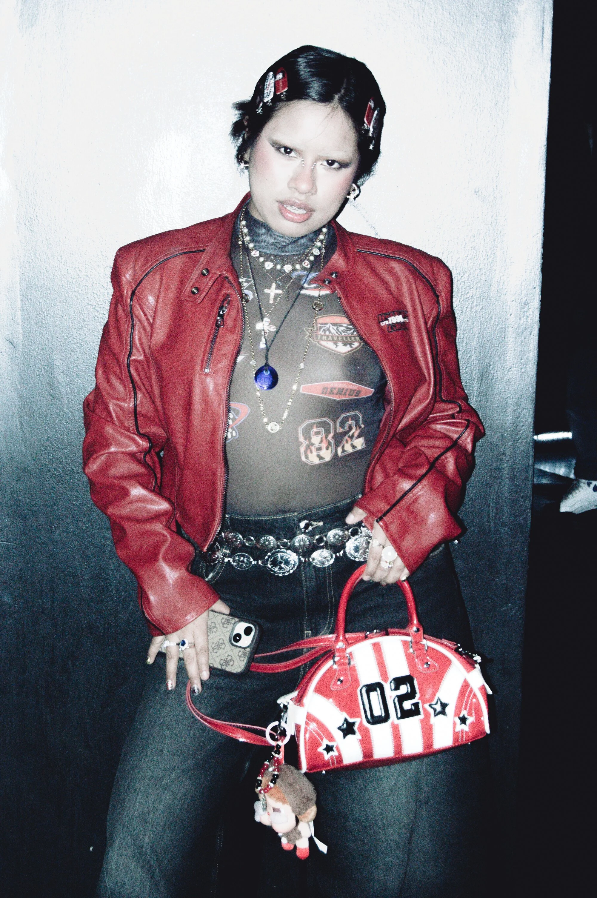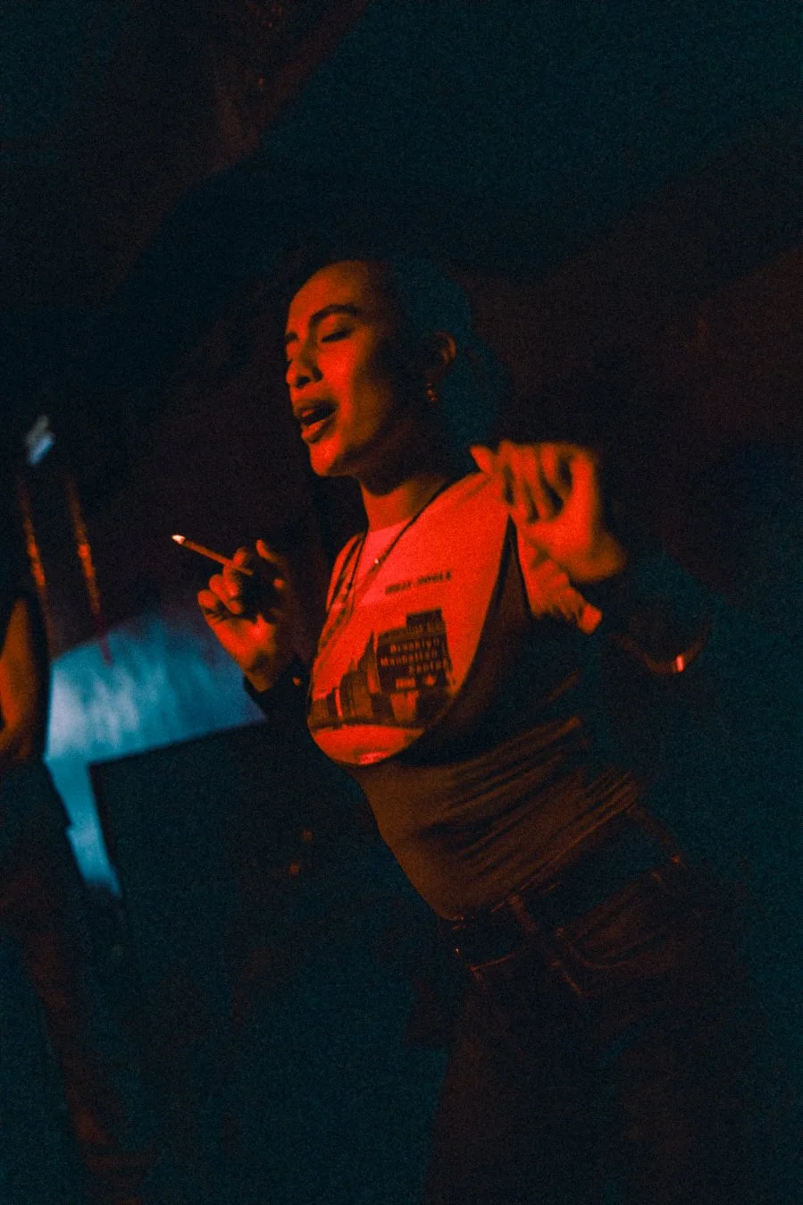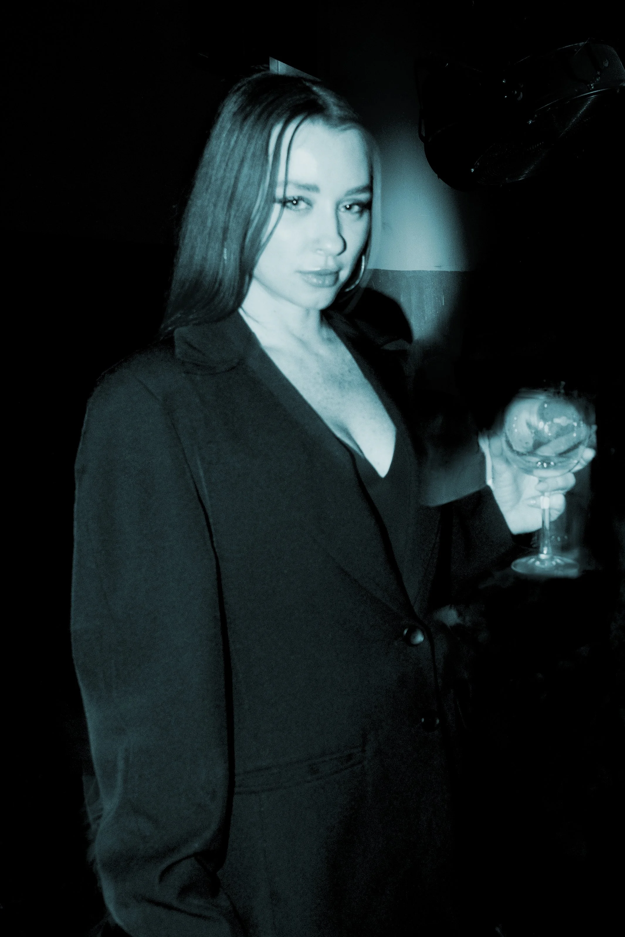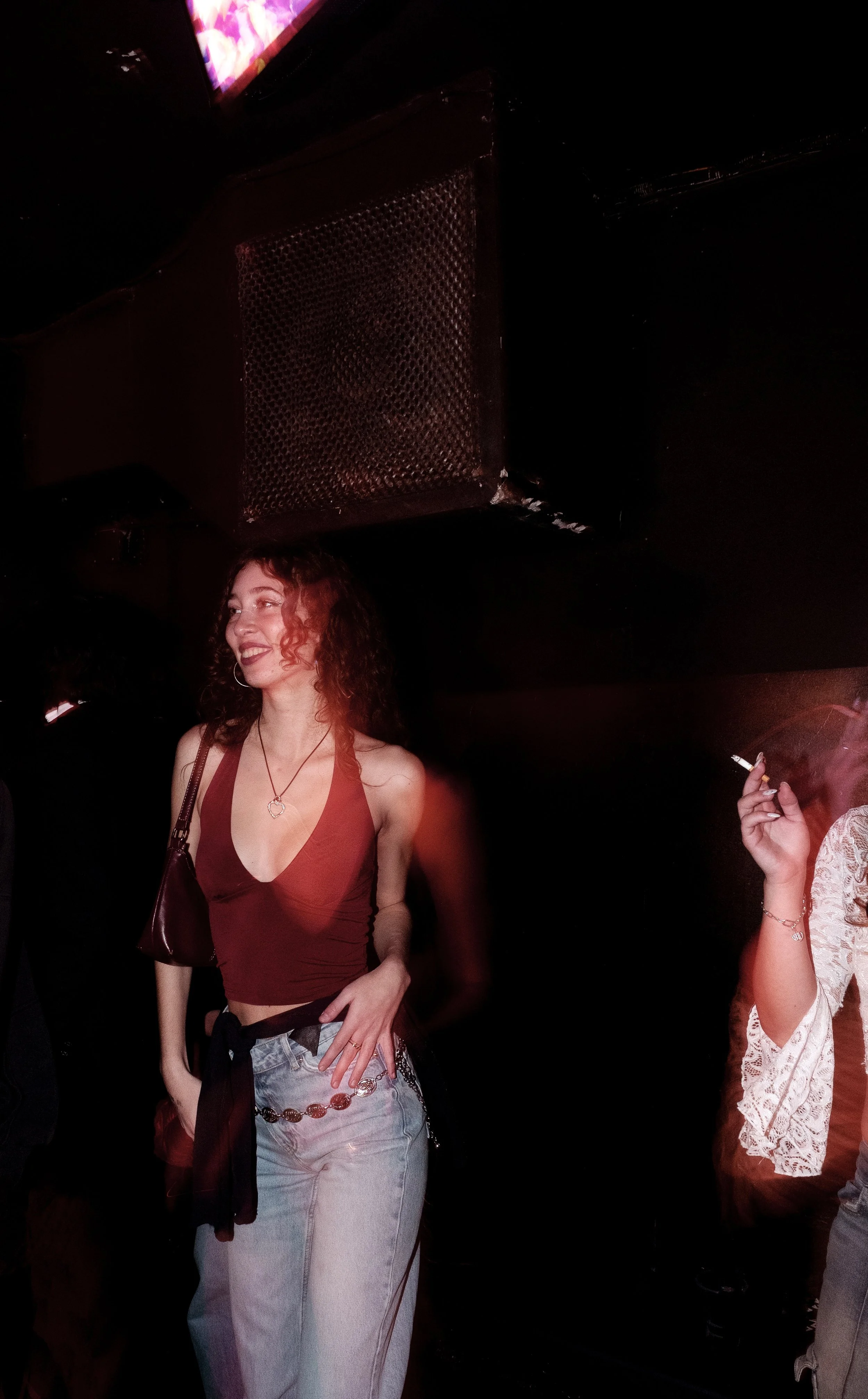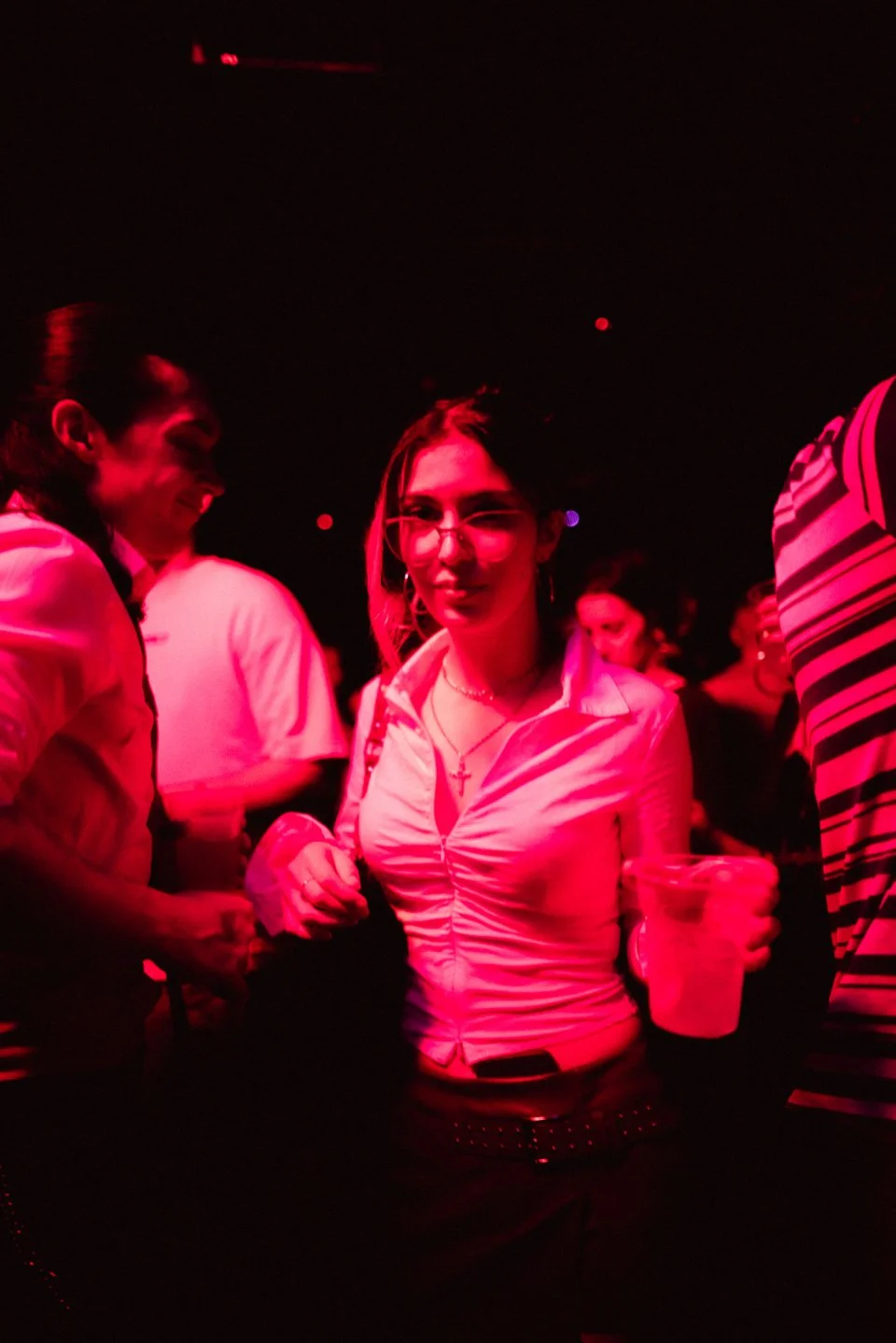 Una ragazza con capelli ricci e abbigliamento da sera tiene un drink in mano in un ambiente di notte con illuminazione rossa.