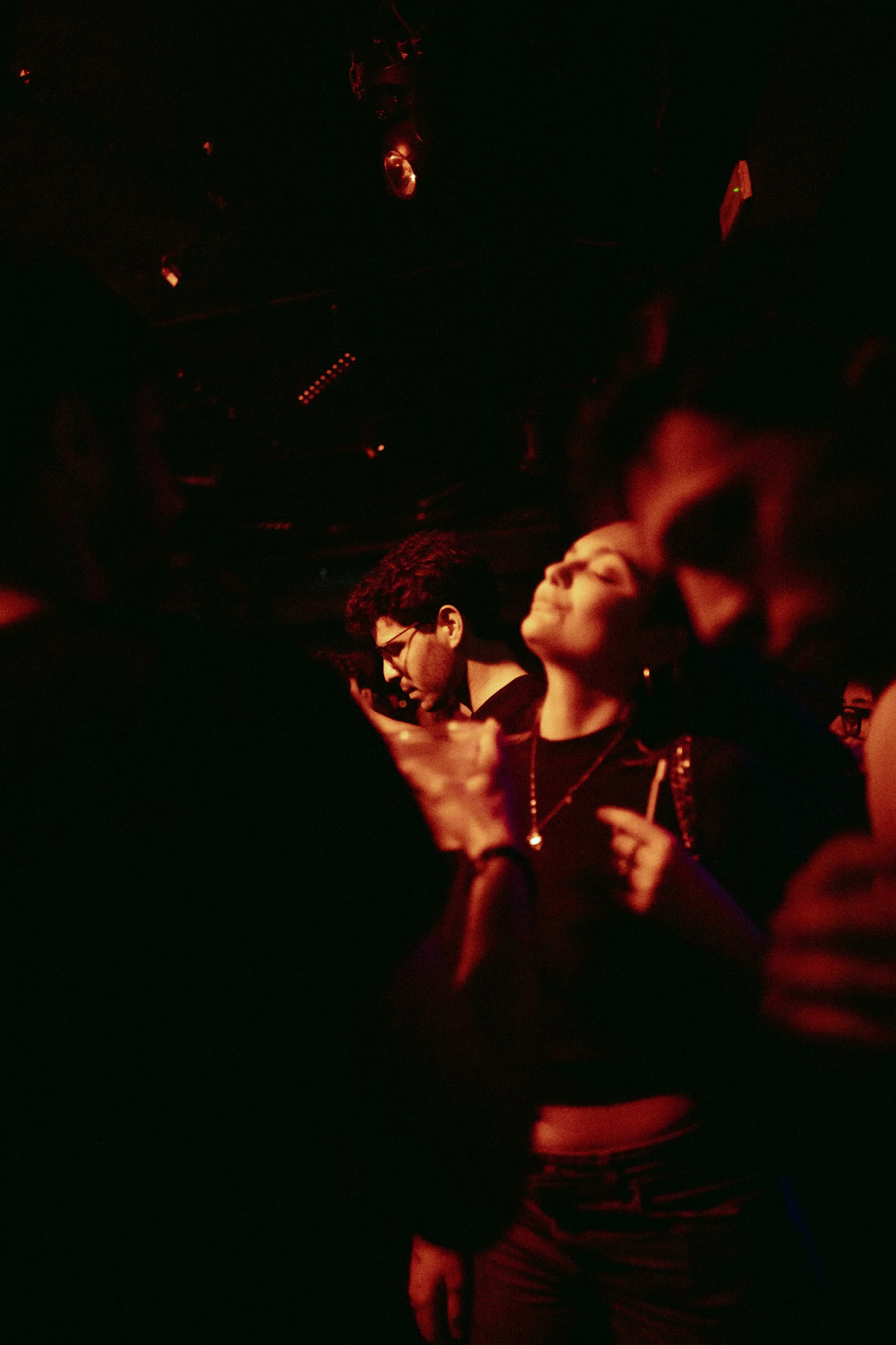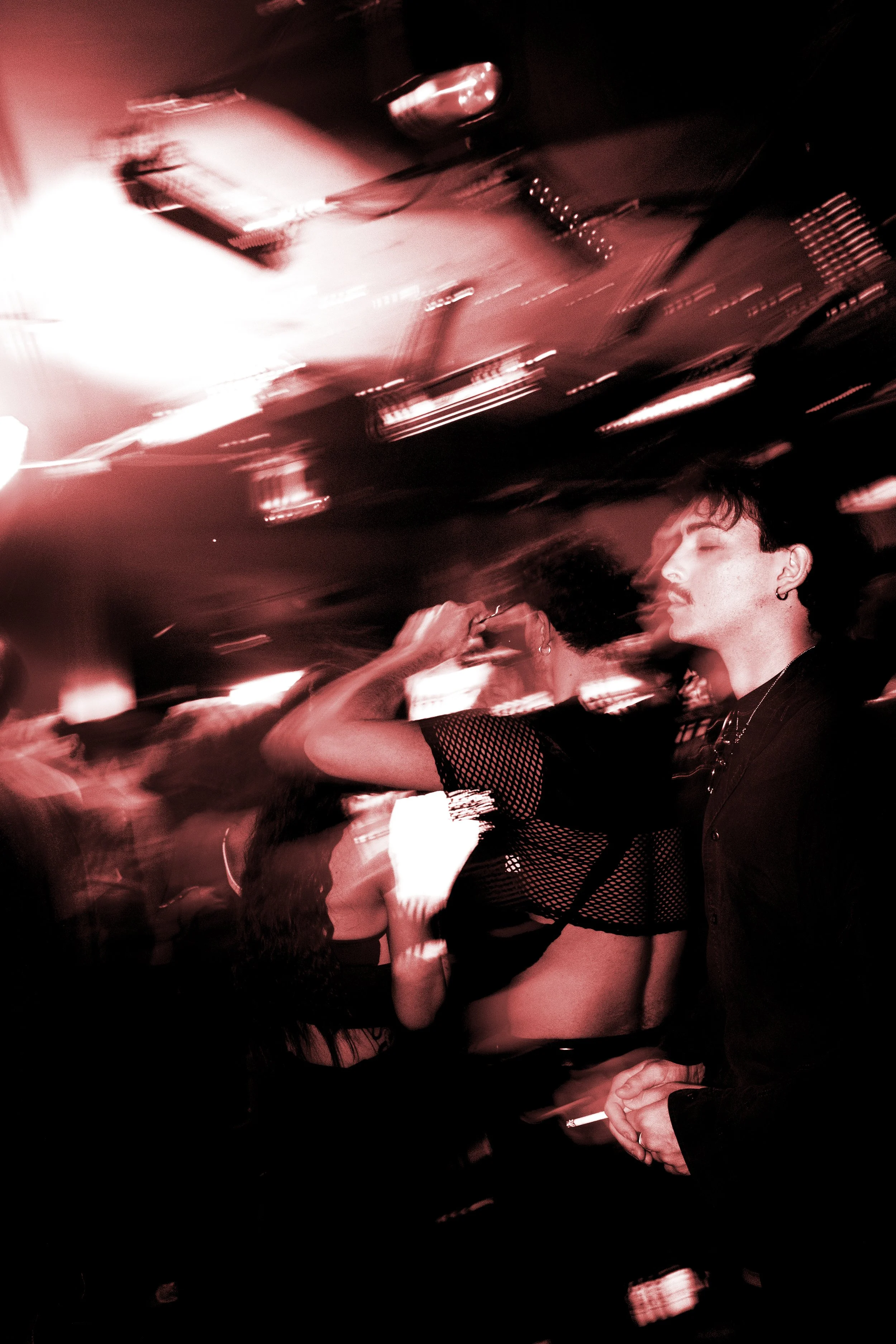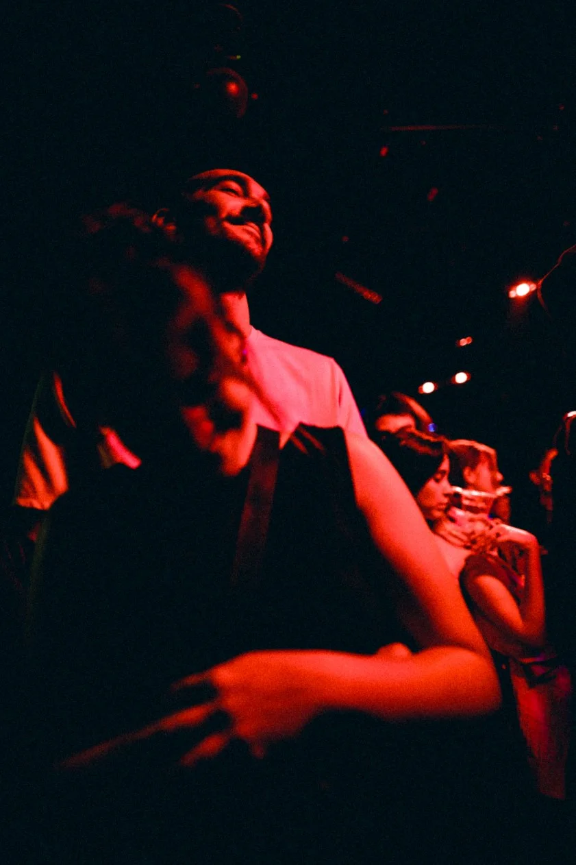 Persone che ballano in sottofondo rosso oscuro, in un ambiente con luci soffuse.
