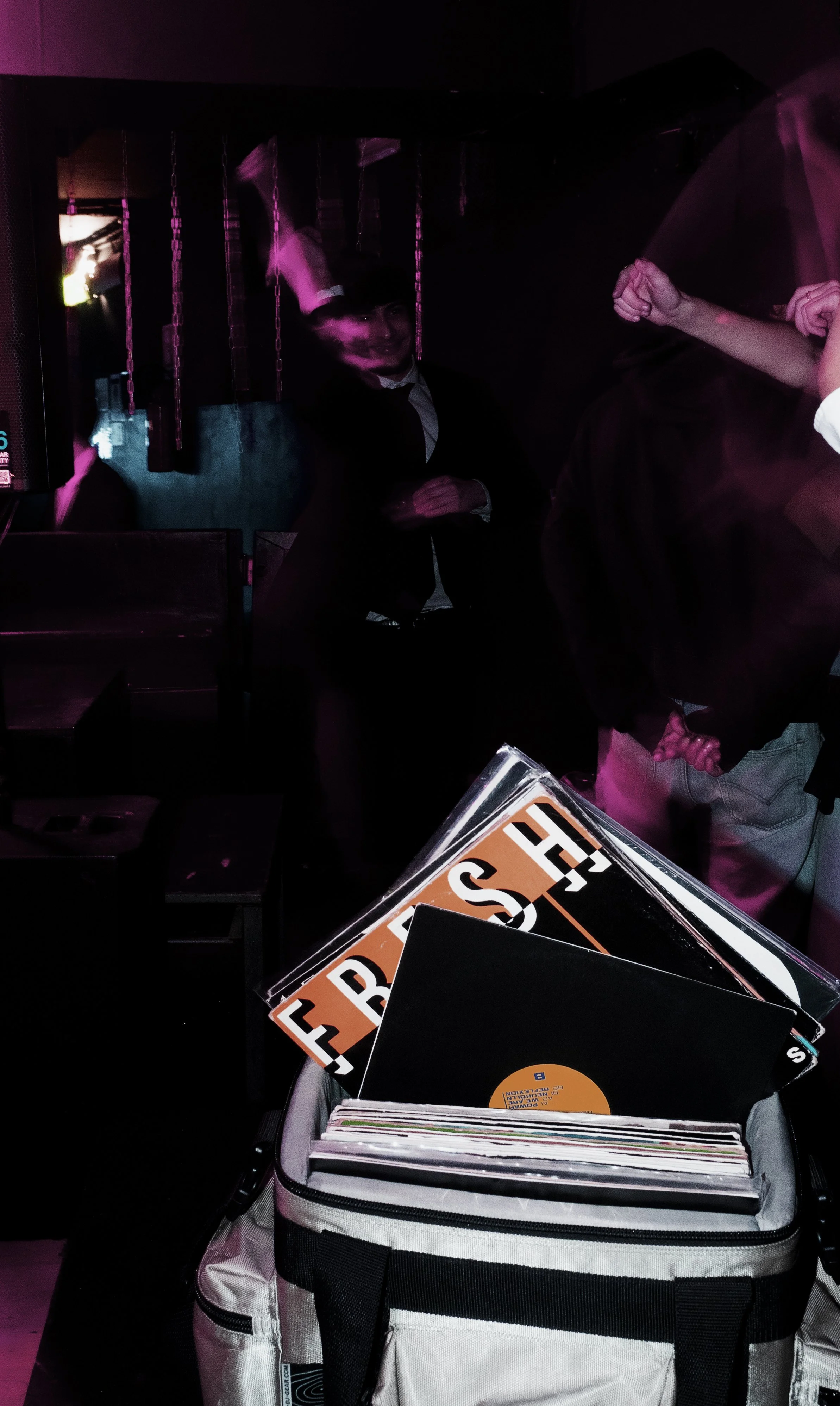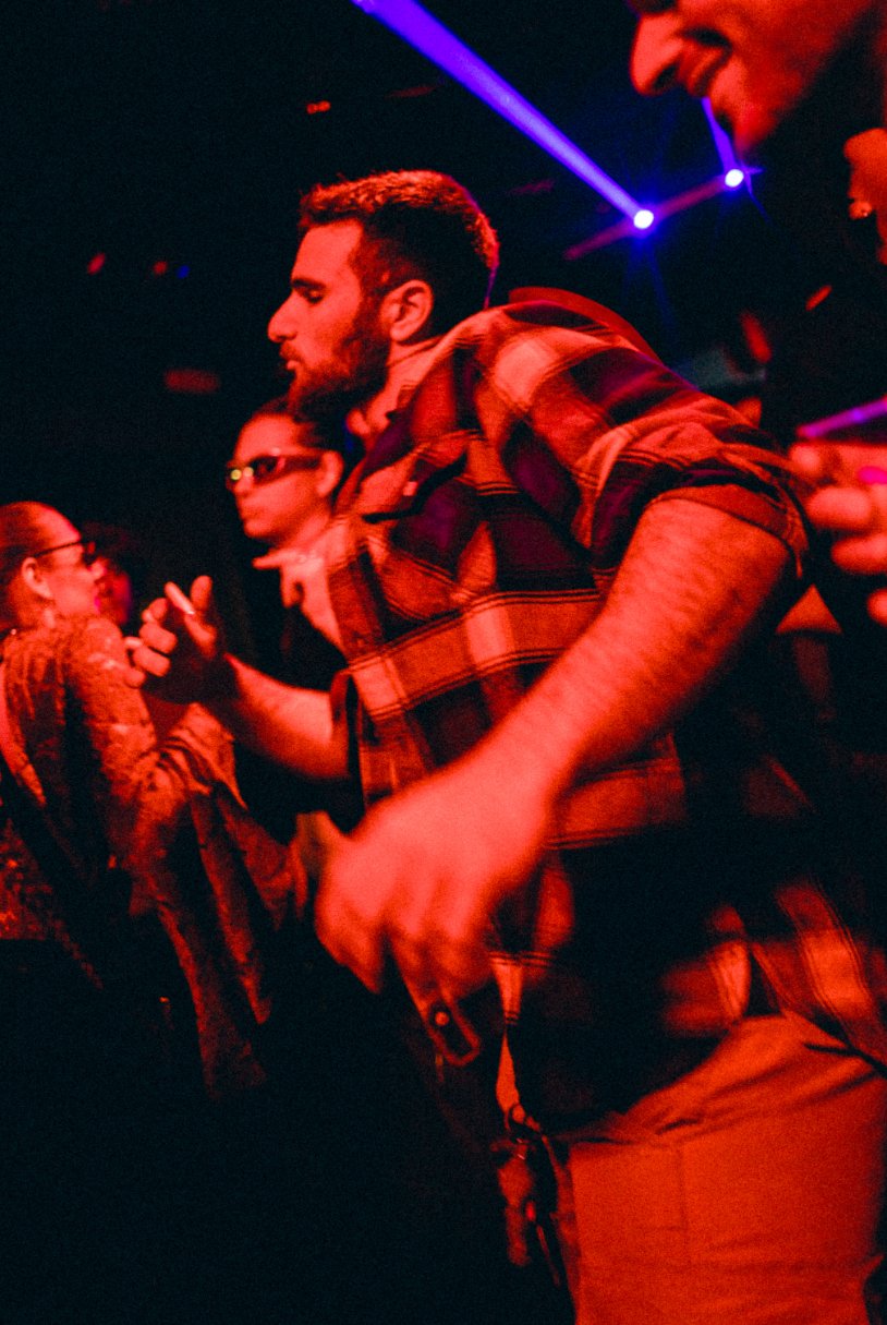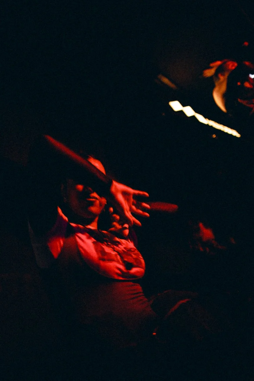 Persone che ballano in sottofondo rosso oscuro, in un ambiente con luci soffuse.