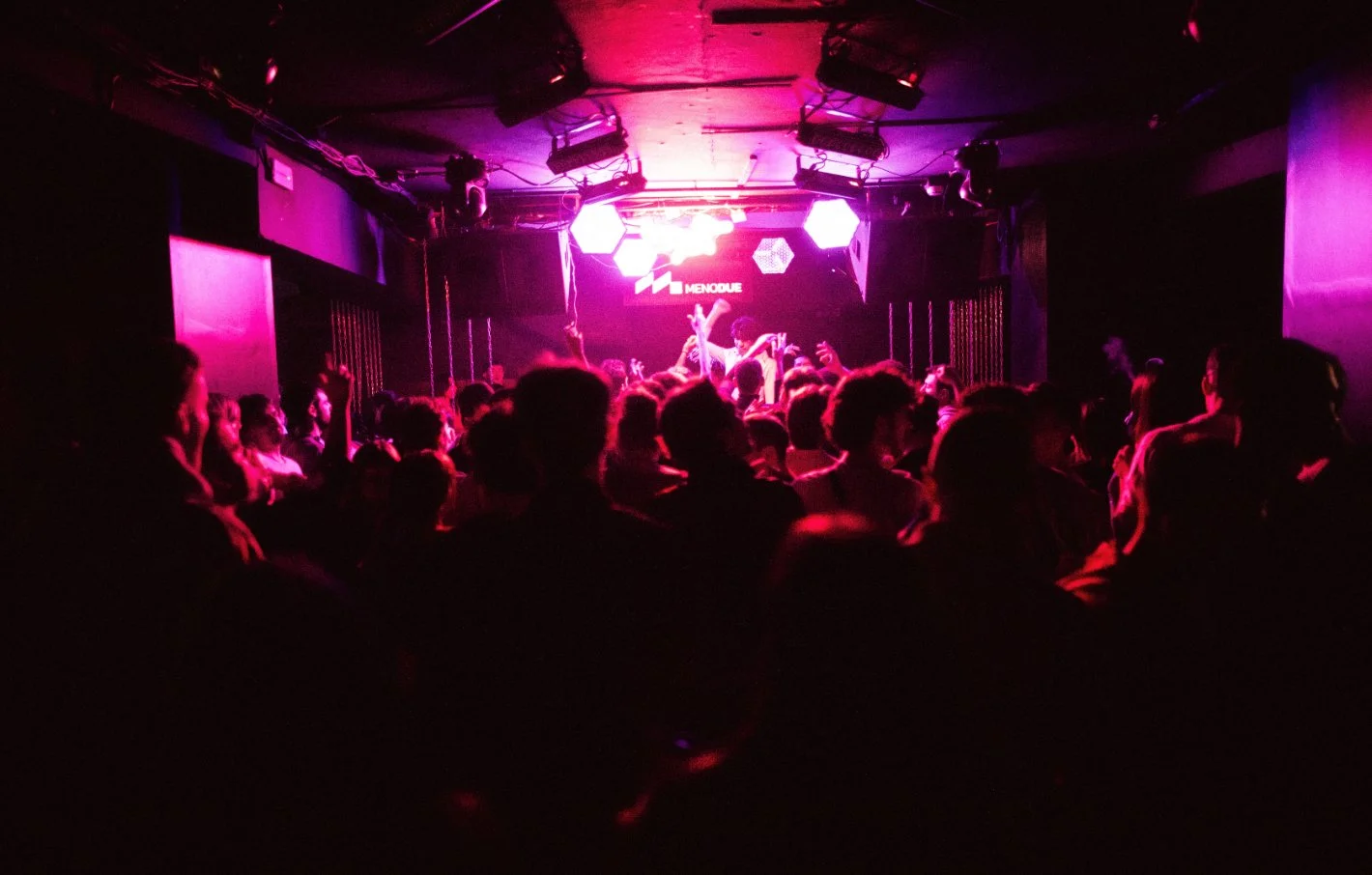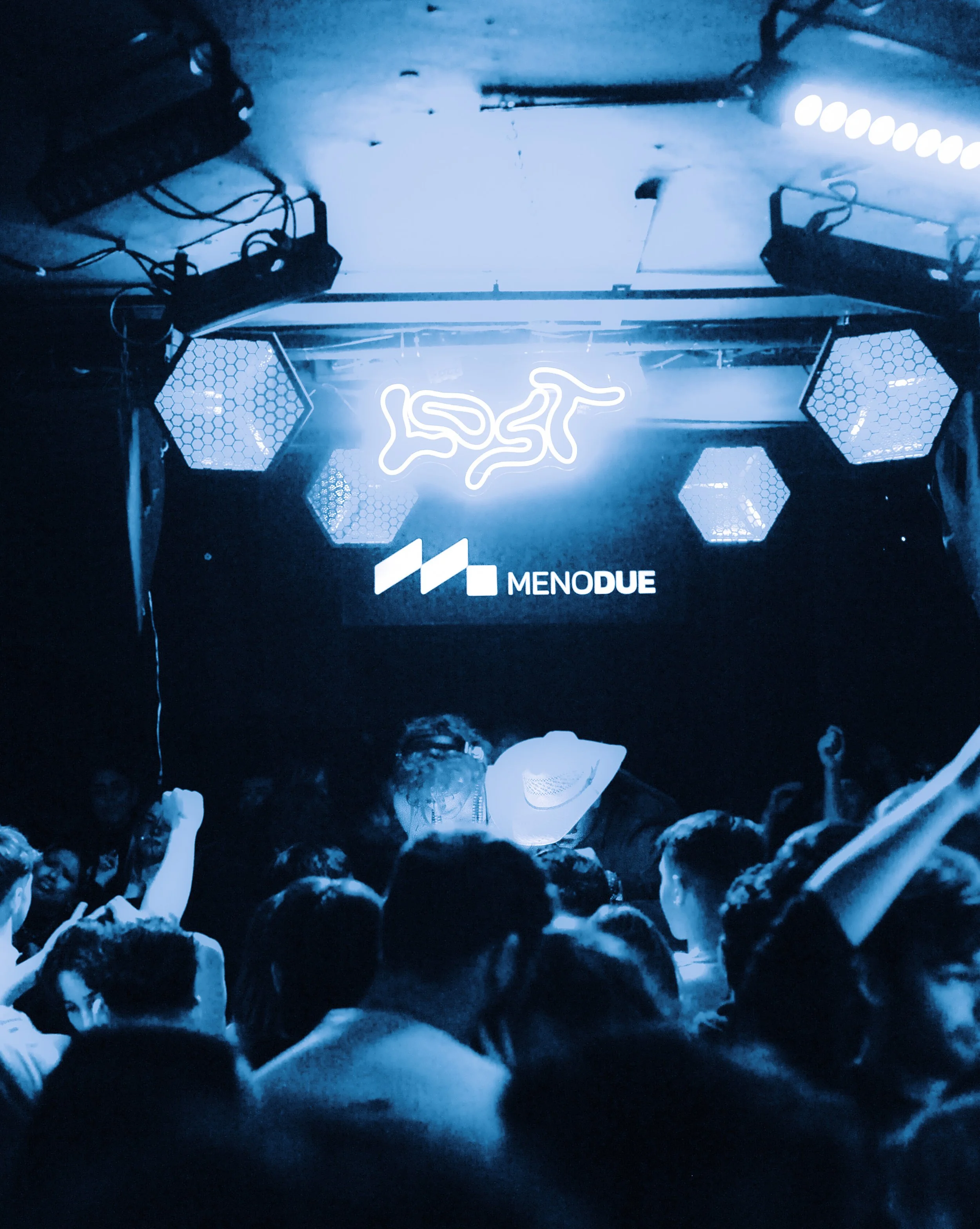 Un DJ si esibisce in un locale con una folla di persone, con luci soffuse e un pannello sopra con il logo di Menodue.