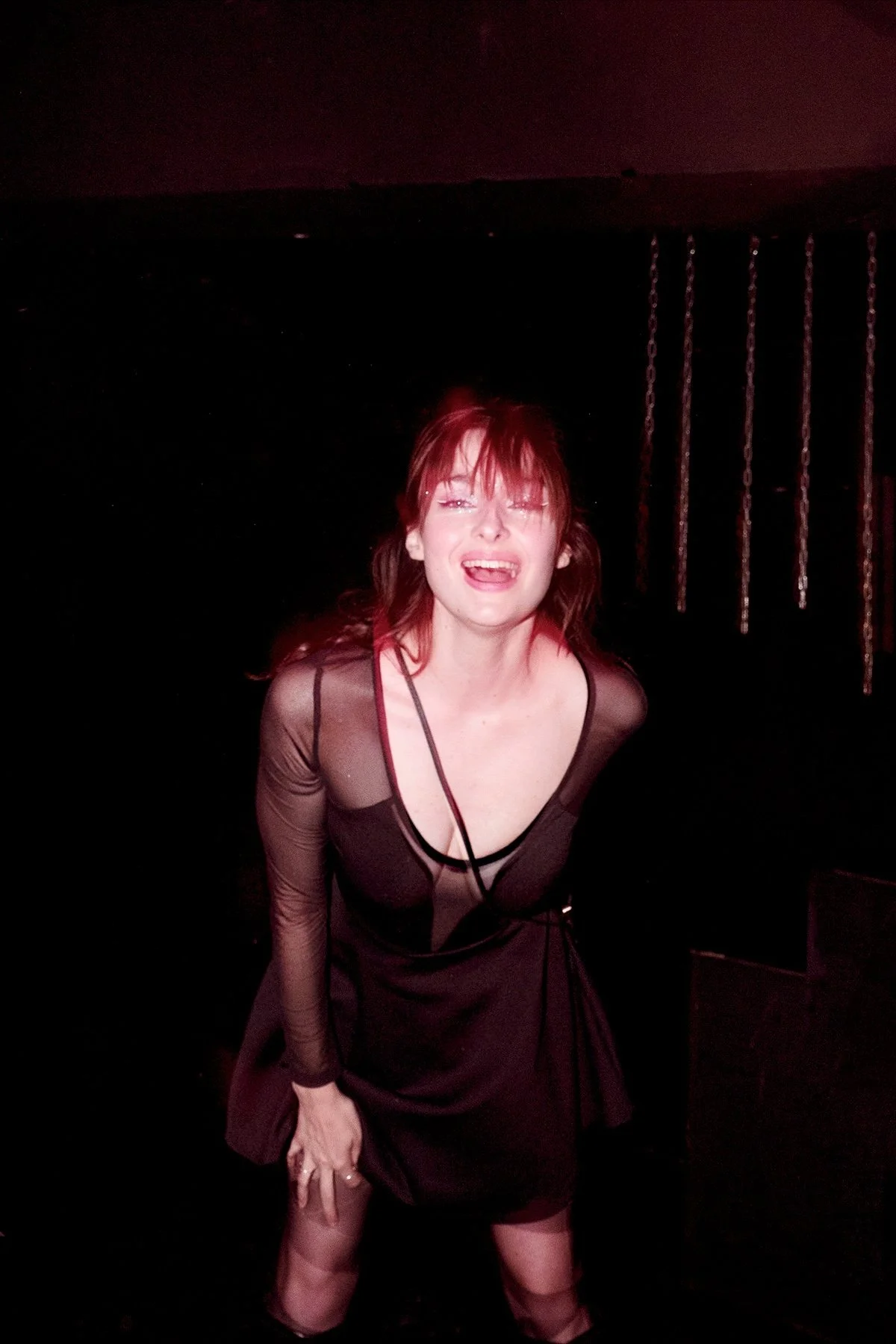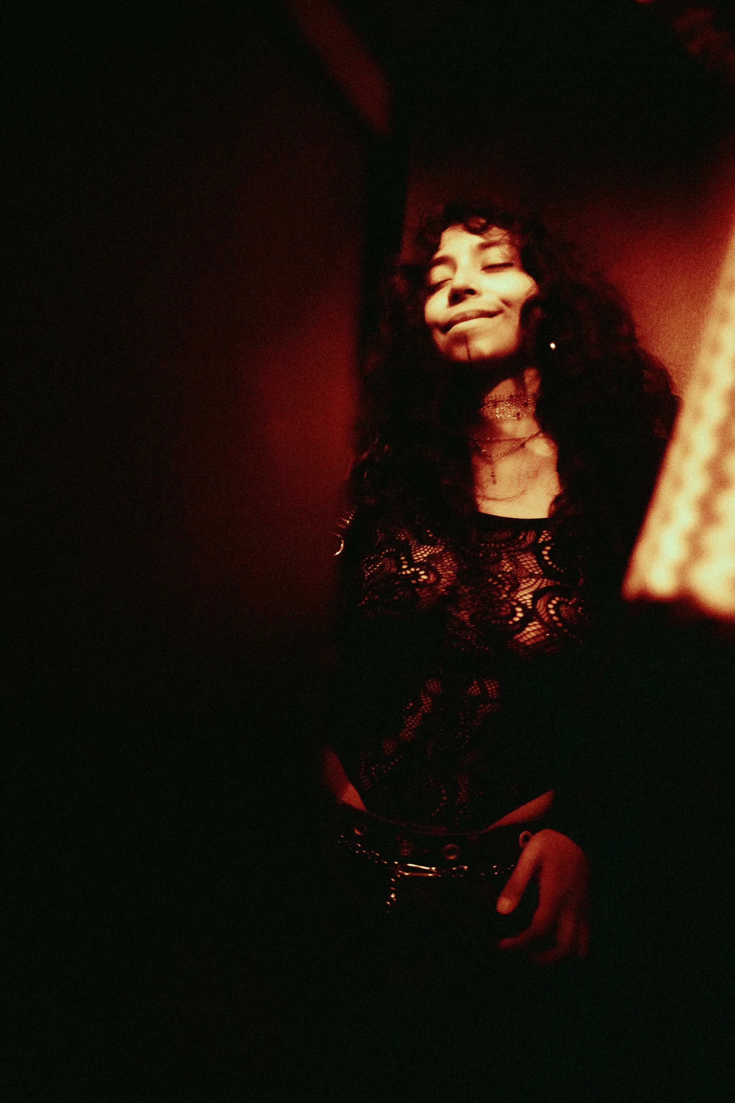 Ragazza con abito in pizzo nero, capelli ricci, sorriso e occhi chiusi, in un ambiente con luci rosse