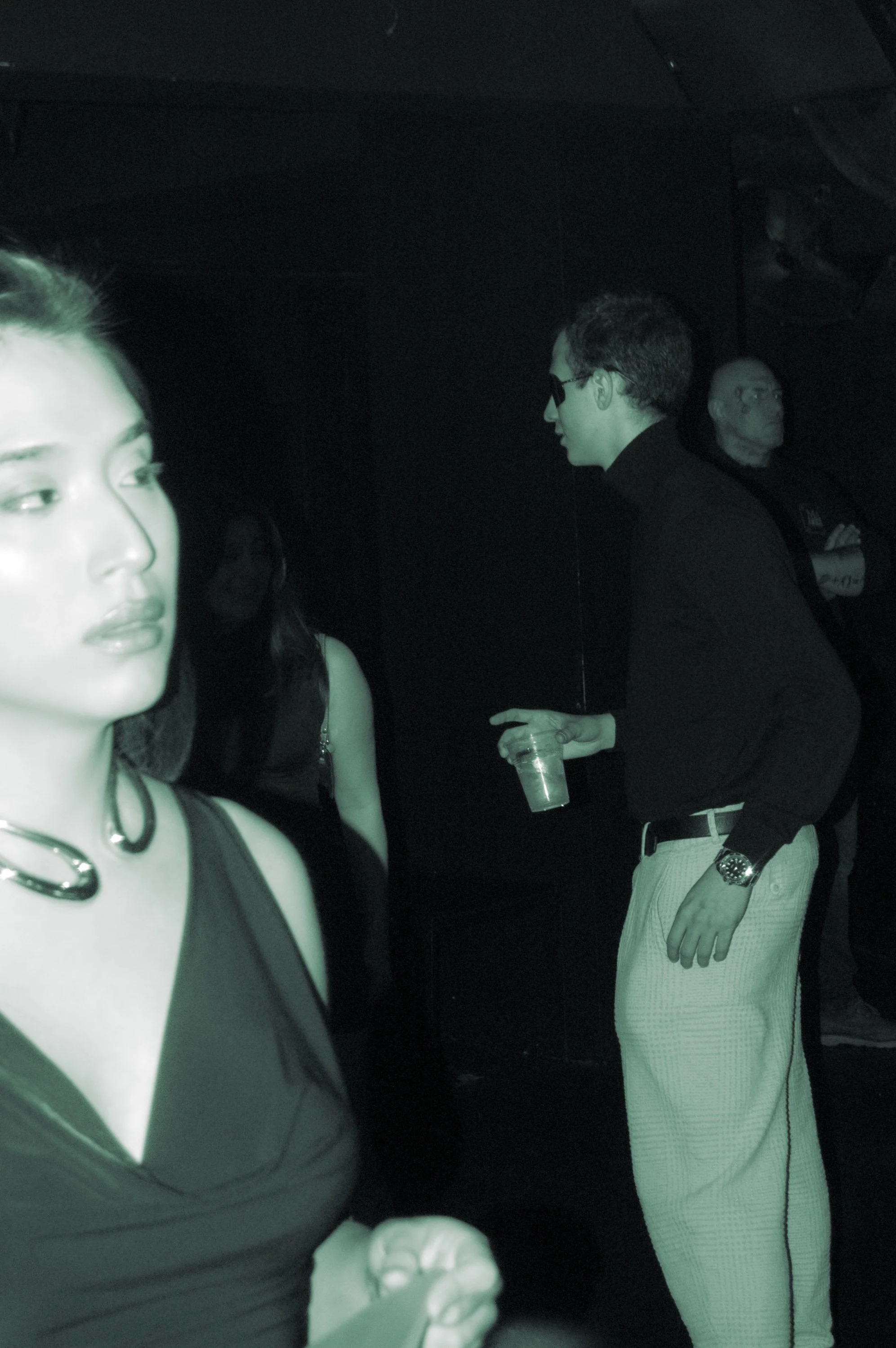 Persone in un ambiente di festa, alcune con tatuaggi visibili, indossano abiti scuri e accessori come collane, in un'illuminazione calda e soffusa.