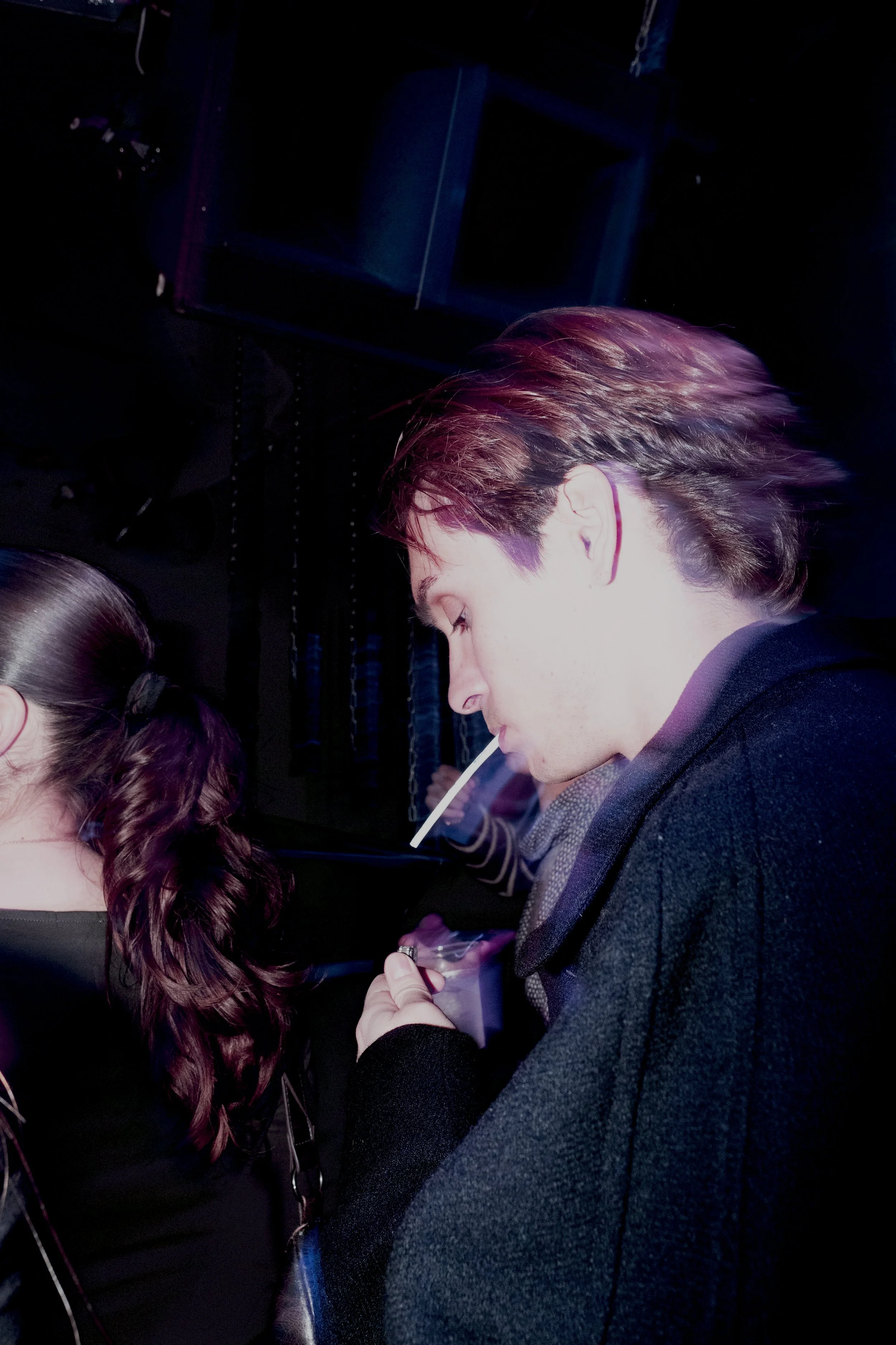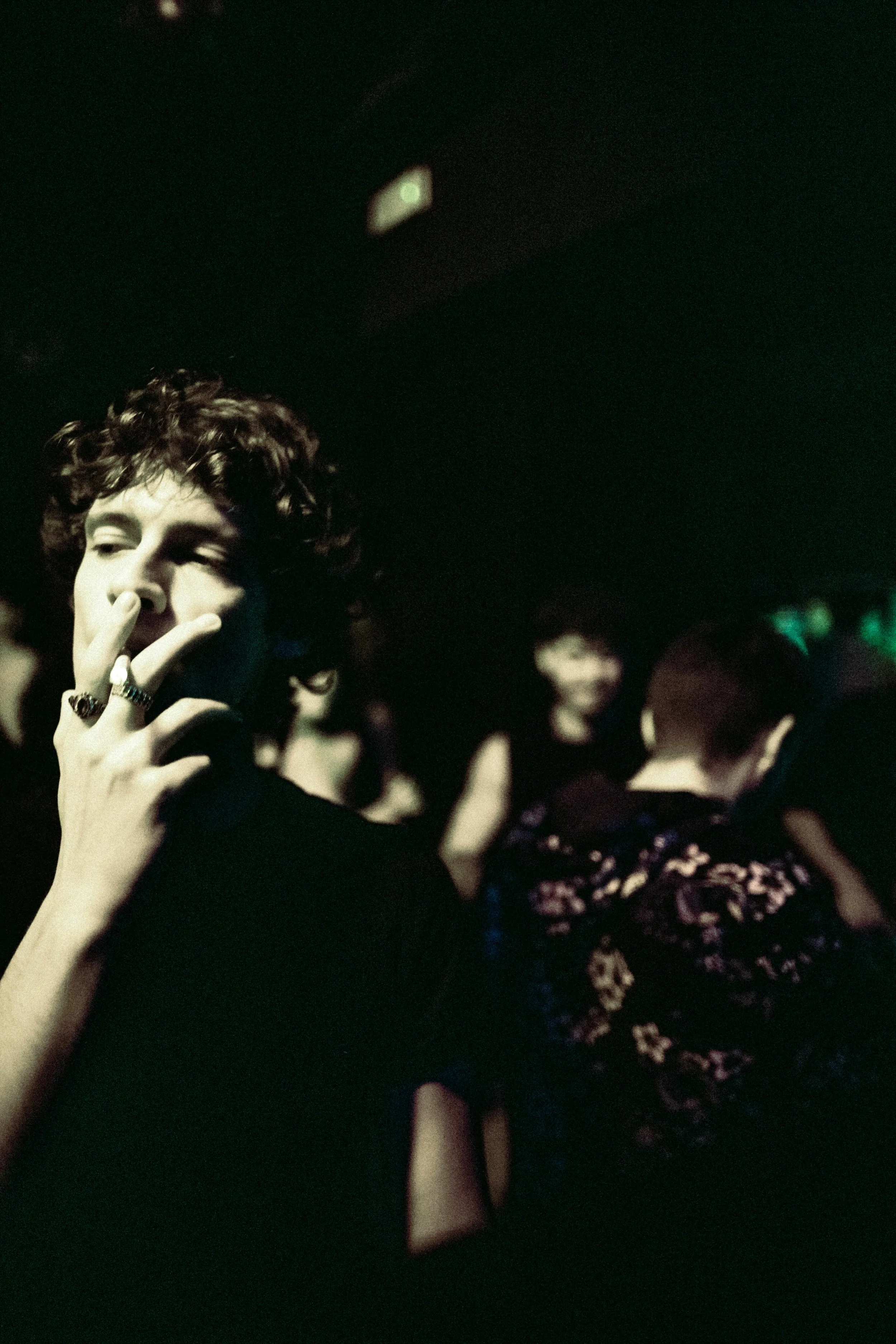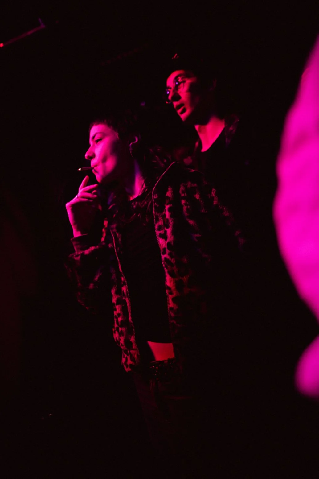 Persone in un locale musicale con luci soffuse, alcune fumano e stanno ascoltando musica.