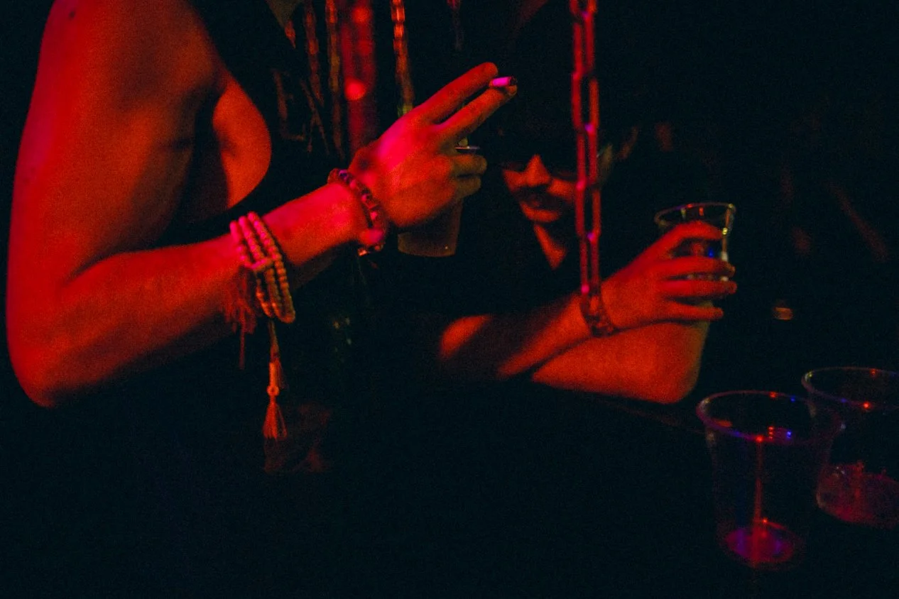 Due persone sedute in un ambiente buio con illuminazione rossa, una di loro mostra un gesto di pace con le dita, mentre l'altra tiene un bicchiere in mano.
