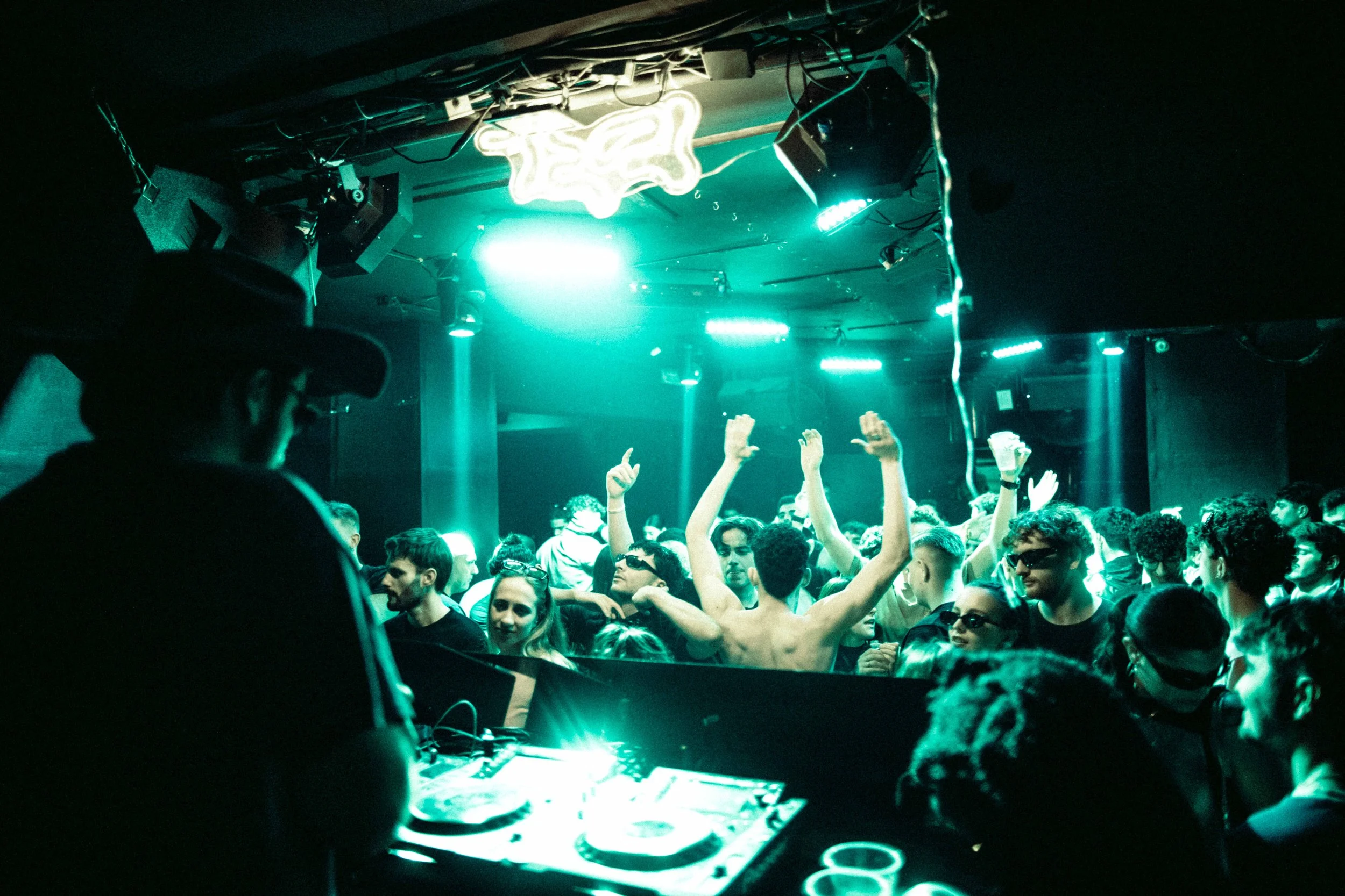 Una scena di un club con una folla di persone che ballano e si divertono, vista da dietro un DJ che sta suonando alla console.
