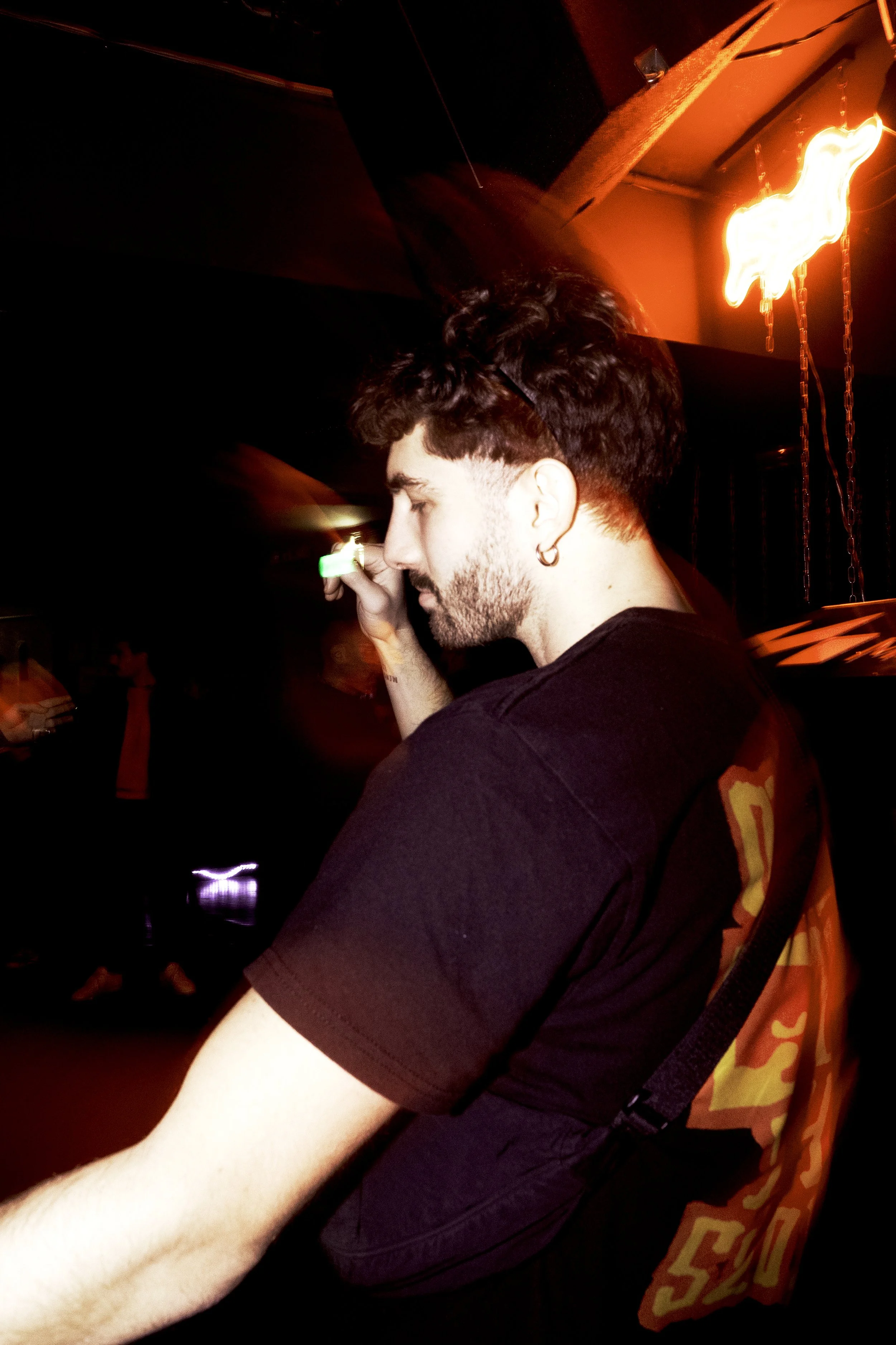 Una persona con capelli ricci e vestita con una maglietta con la scritta 'EXUME' sorride mentre tiene un bicchiere in mano, in un ambiente oscurato con luci rosse.