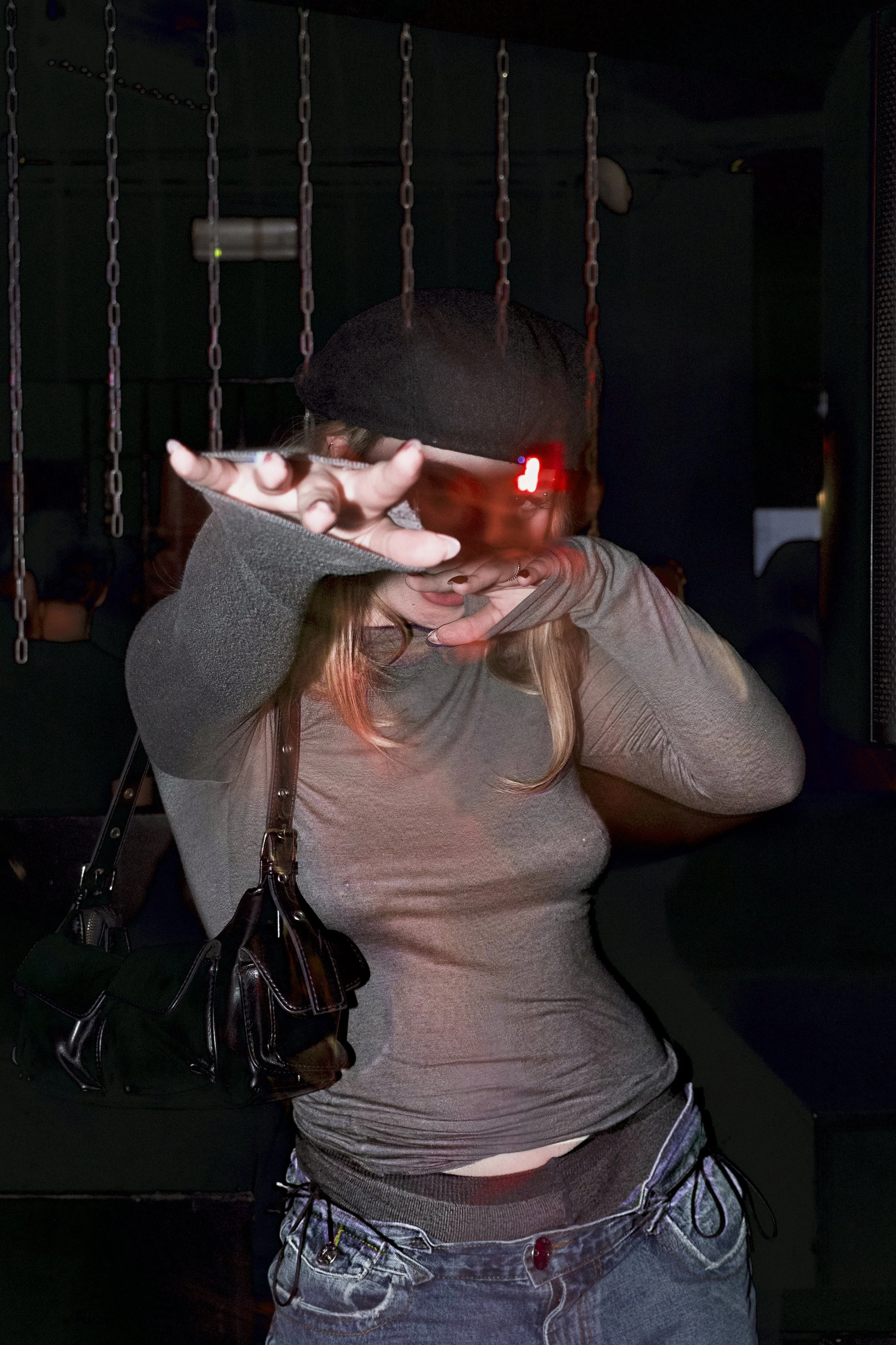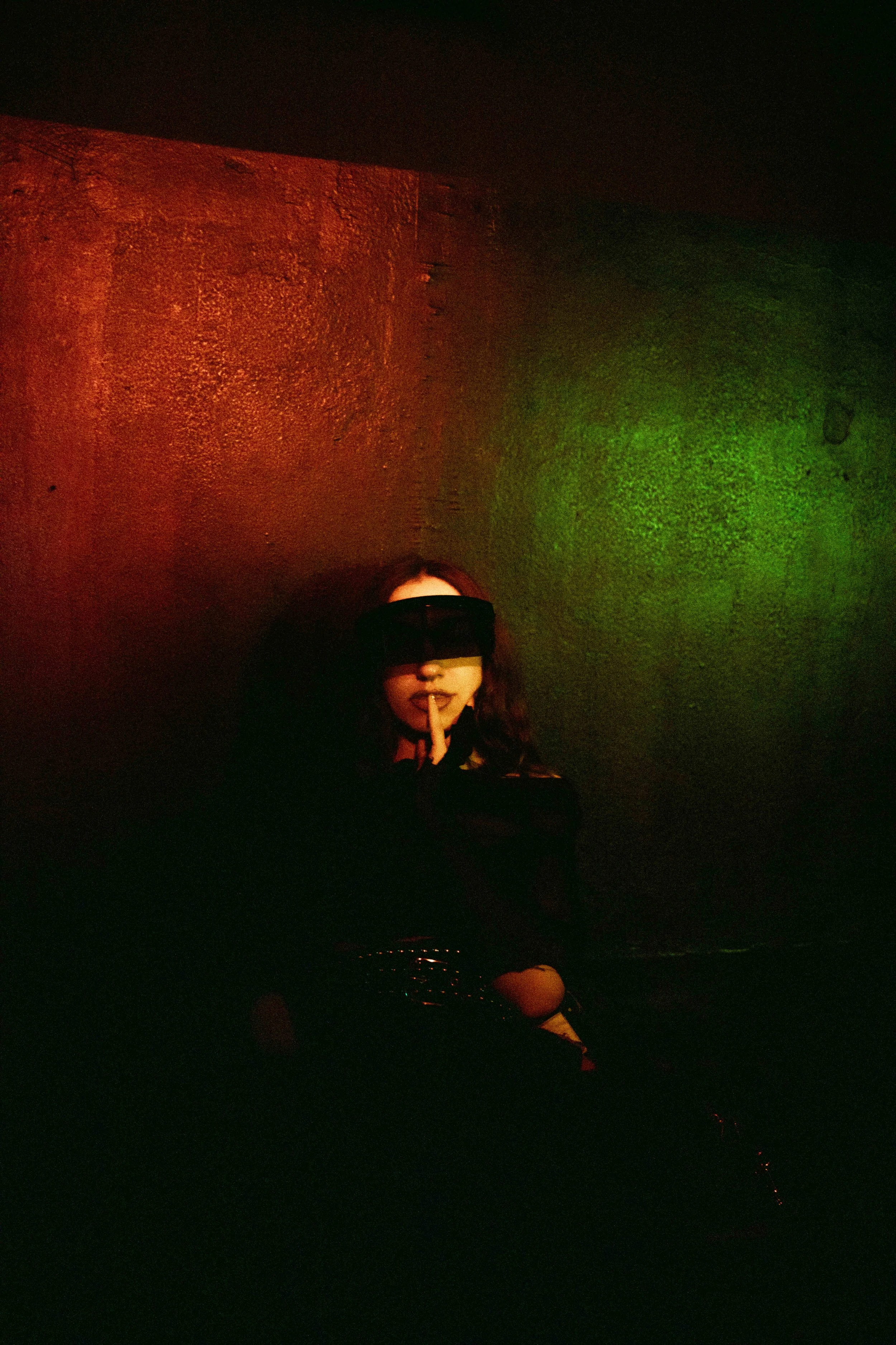 Donna con capelli lunghi, indossa occhiali scuri e una felpa nera, si trova in un ambiente scuro con luci rosse, in piedi contro una parete di pietra. Condizioni di illuminazione bassissima aggiungono un effetto drammatico alla scena.