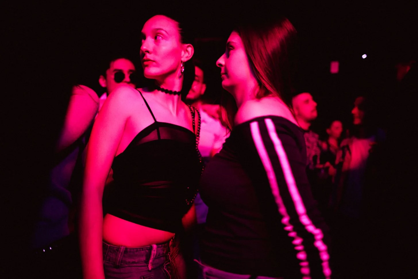 Due donne in un locale notturno, una con i capelli raccolti e l'altra con i capelli lunghi, mentre si divertono e tengono un bicchiere. Sfondo con luci rosse e un atleta con cuffie che guarda uno schermo.