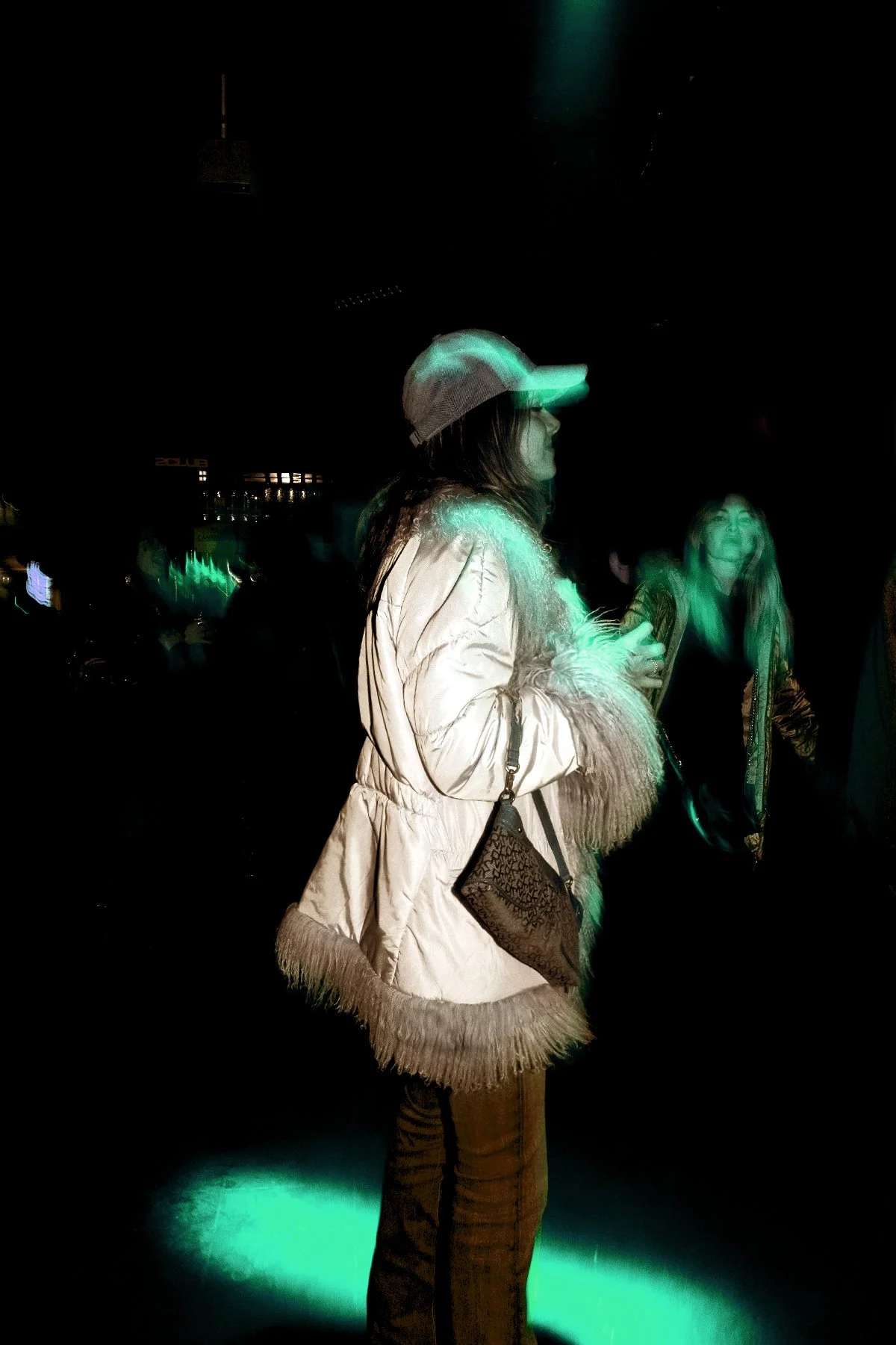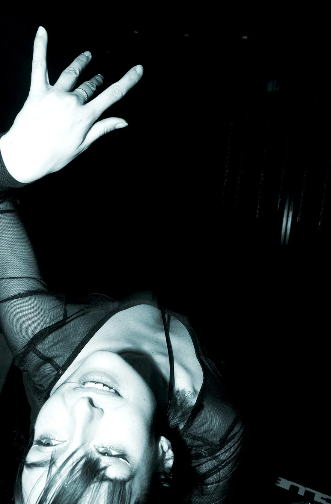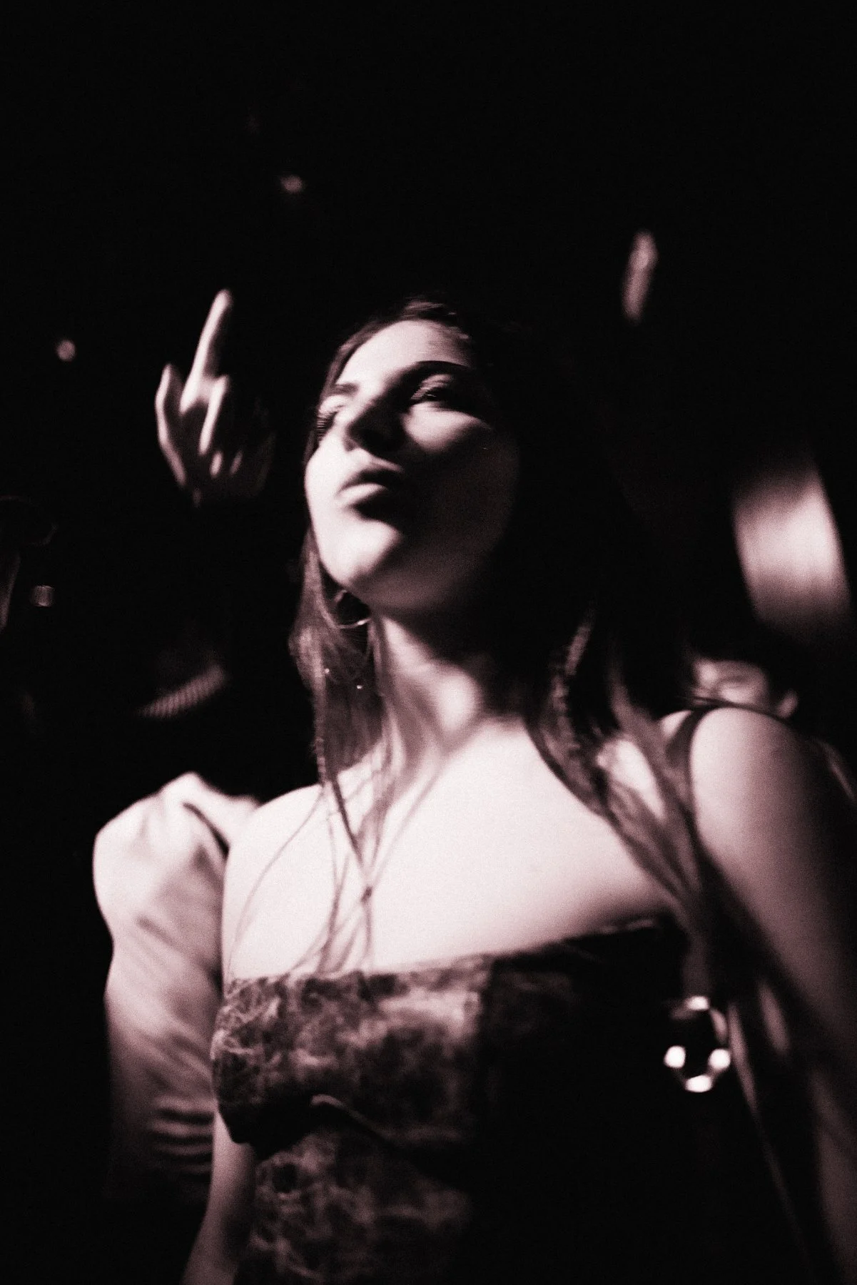 Una donna con capelli castani, vestita di nero, che sembra ballare o ascoltare musica in un ambiente con illuminazione soffusa o soffusa, in un evento o concerto.
