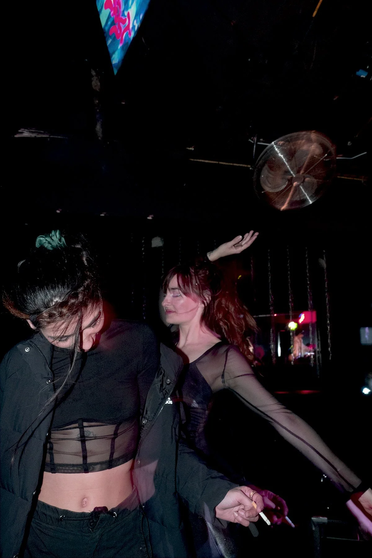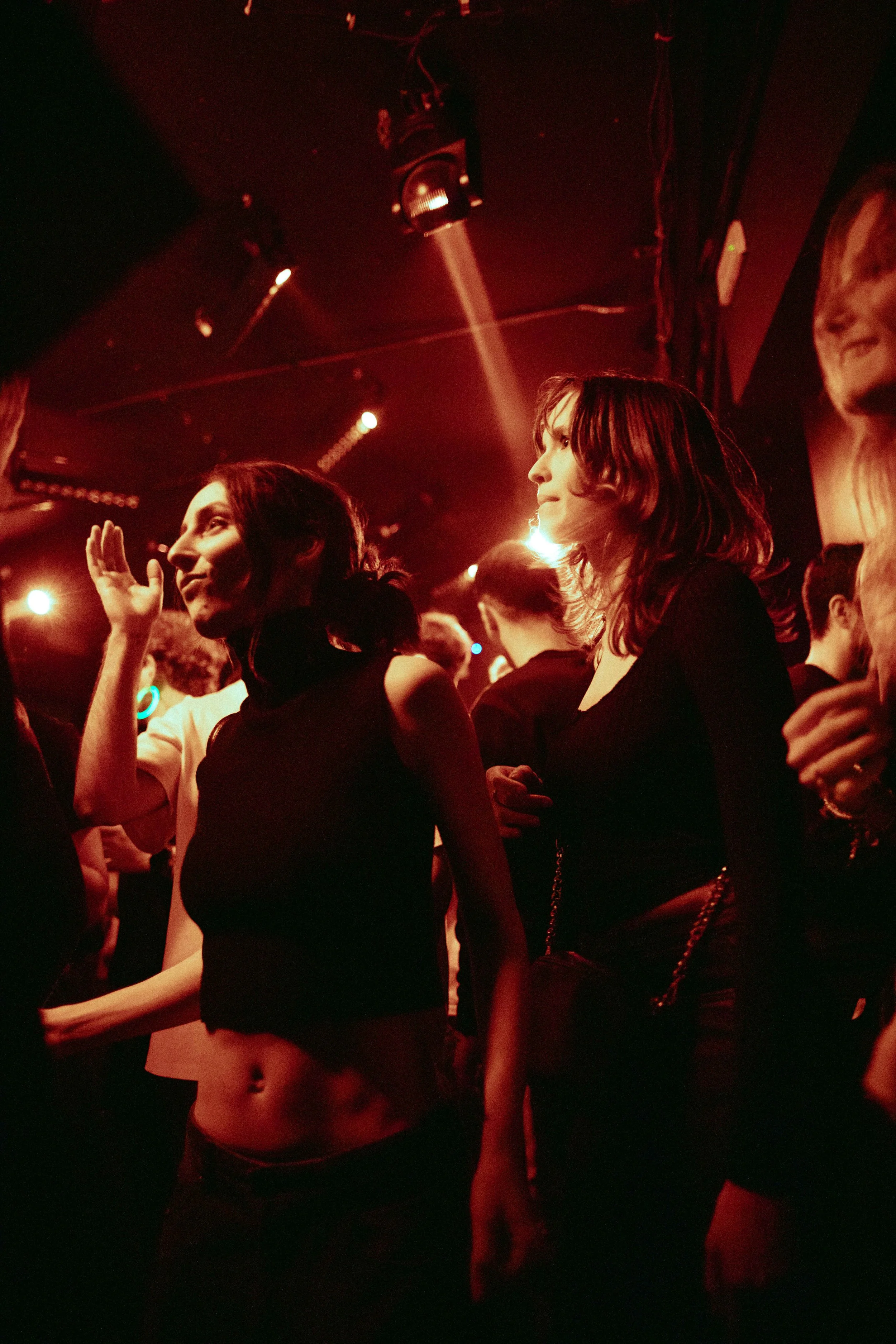 Persone in un locale notturno con luci colorate, vista dal basso, con due donne che ballano e sorridono.