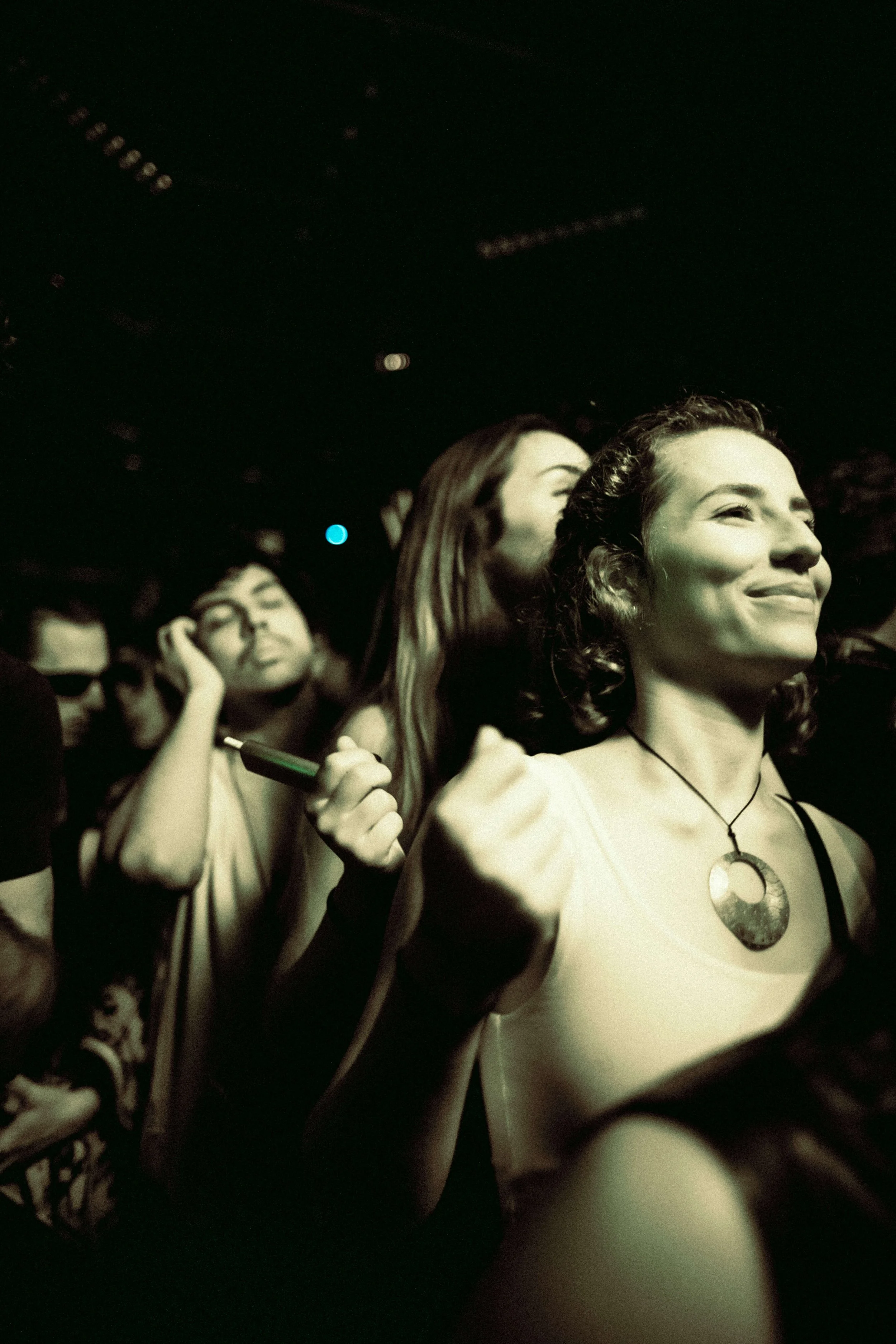 Gruppo di persone in un concerto, alcune con espressioni di gioia e relax, alcune con occhi chiusi o che ascoltano attentamente, in un ambiente con luci soffuse.