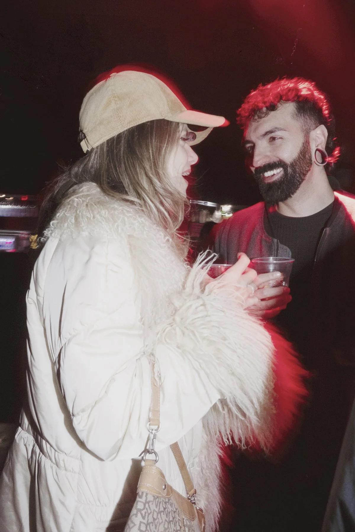 Due persone che si stanno divertendo e ridendo, mentre sono in un ambiente oscuro con luci rosse, in un contesto che sembra una festa o un concerto. La persona a sinistra ha i capelli corti e un sorriso aperto, mentre quella a destra indossa occhiali