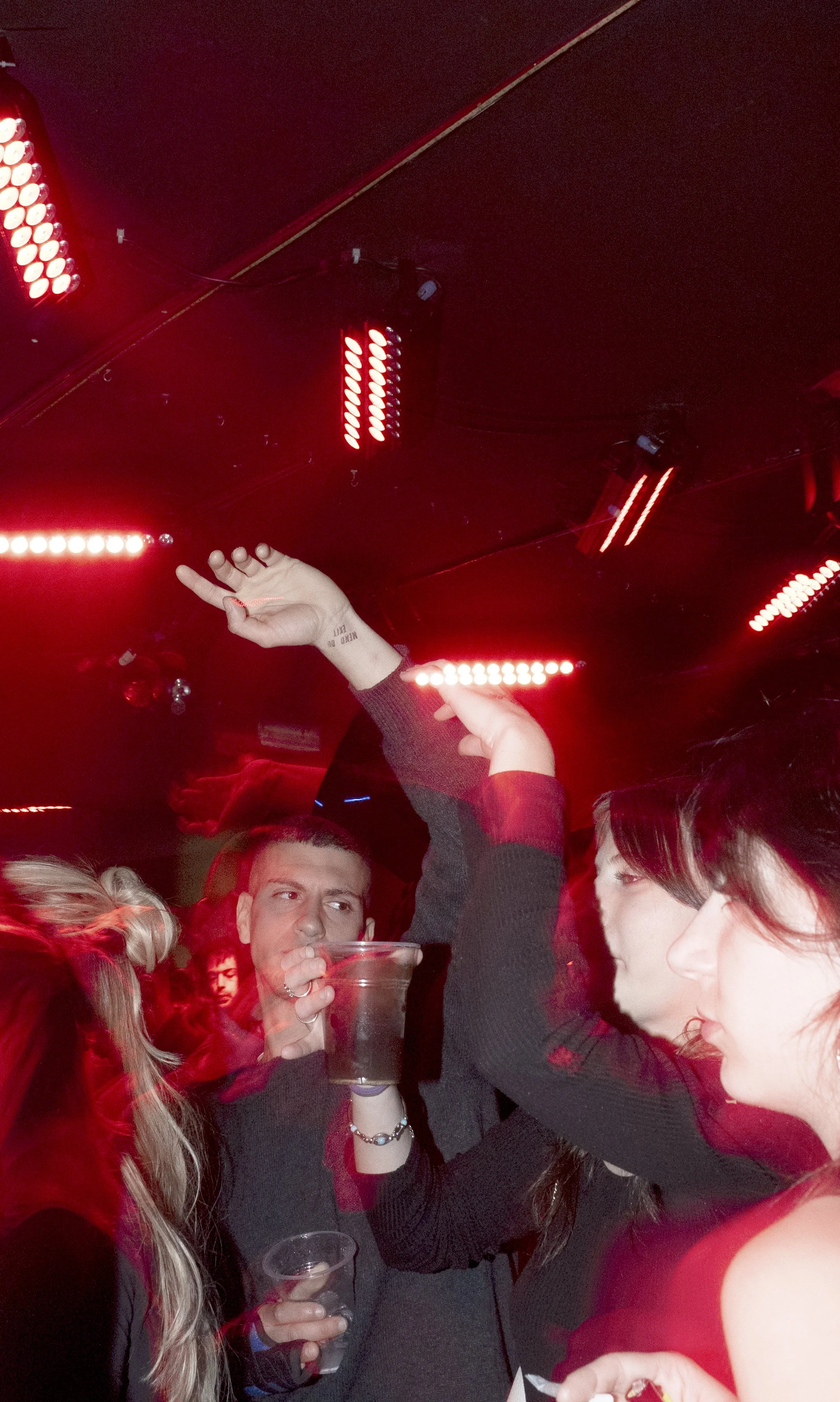 Gruppo di persone in un ambiente rumoroso, probabilmente una discoteca, illuminato da luci rosse.