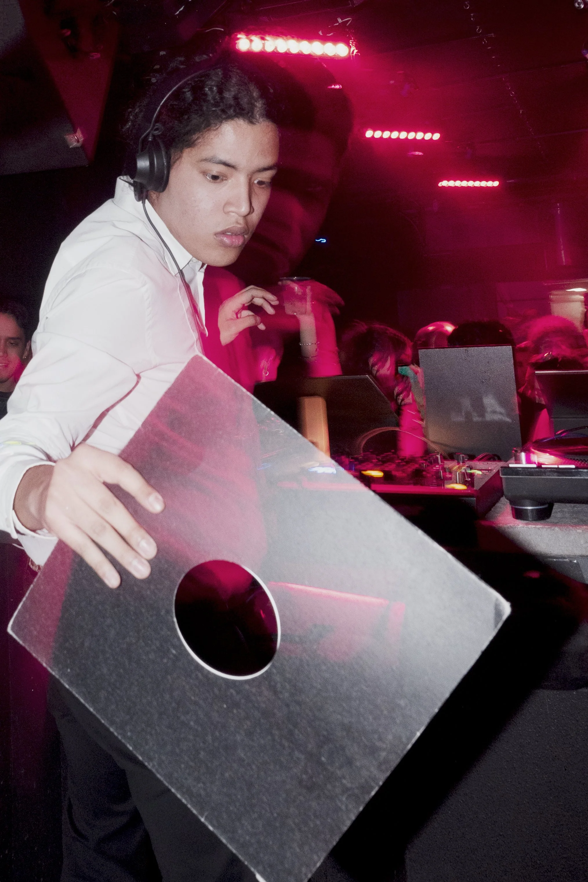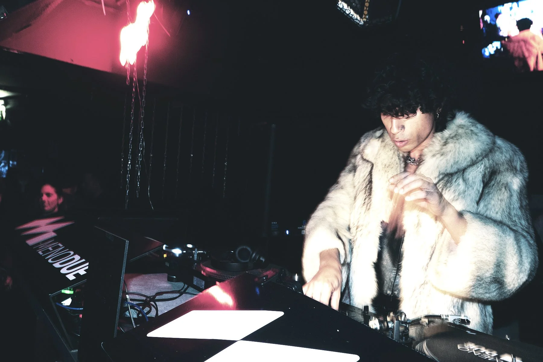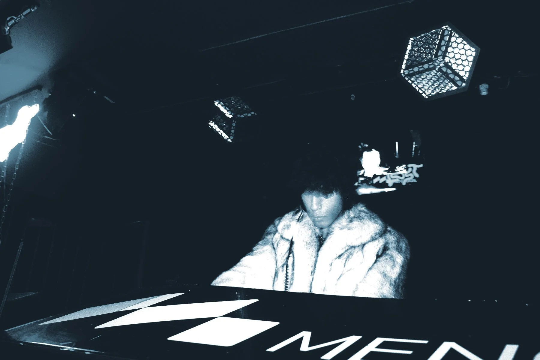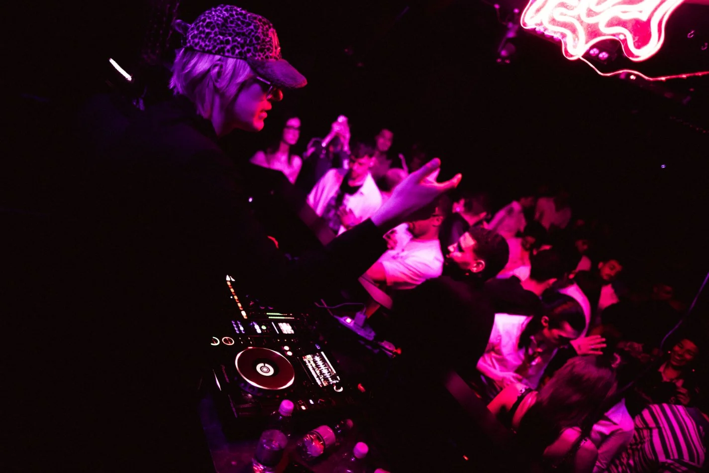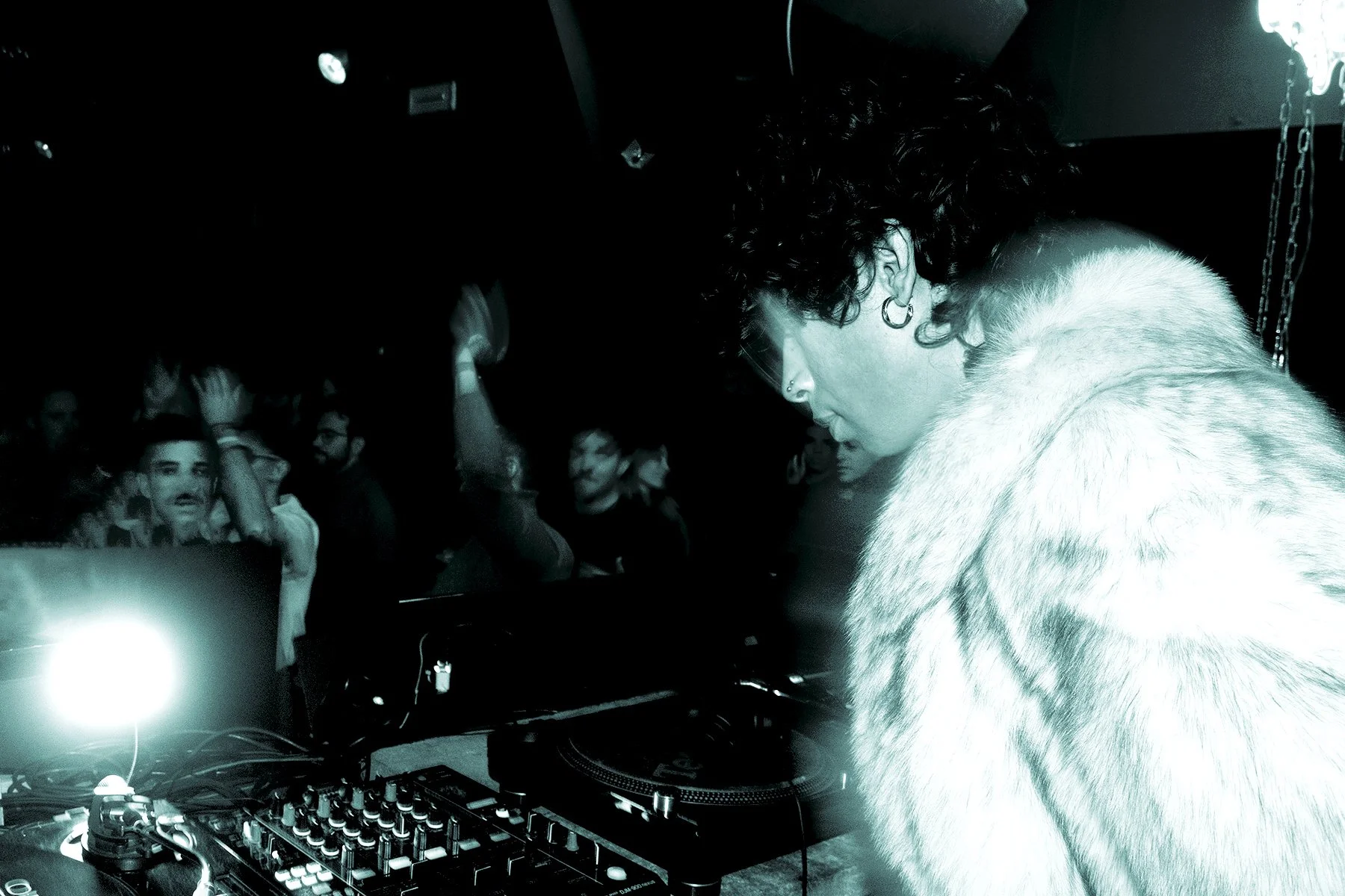 Un DJ con capelli ricci e tatuaggi davanti a un giradischi in un club, con altre persone sullo sfondo, illuminato da luci fluorescenti.