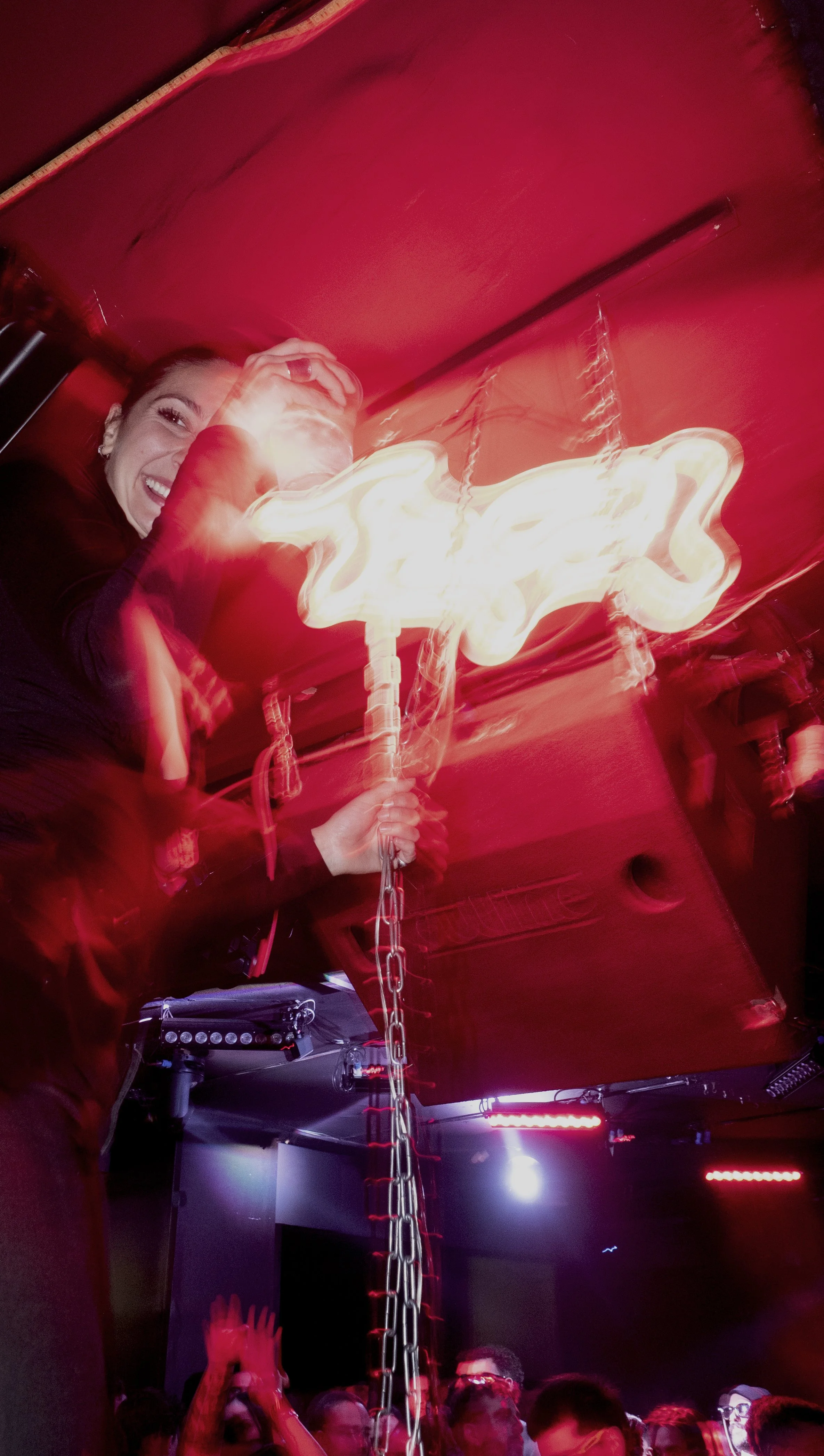 Una donna con occhiali da sole in un ambiente con luci al neon, indossa un top di pelle e guarda verso l'alto in un contesto notturno, probabilmente in un locale.