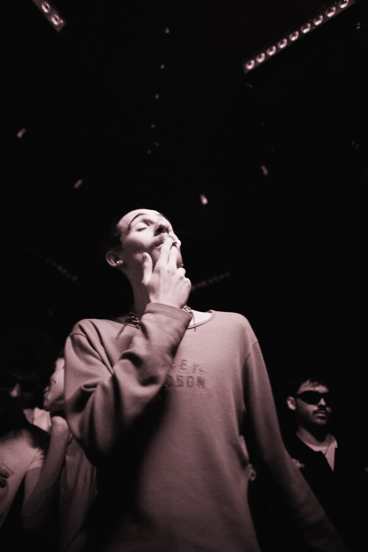 Persona che si gode un momento in un ambiente con luci soffuse, probabilmente in un locale notturno o in una discoteca, indossando una felpa a maniche lunghe con righe e un cappello con scritte.