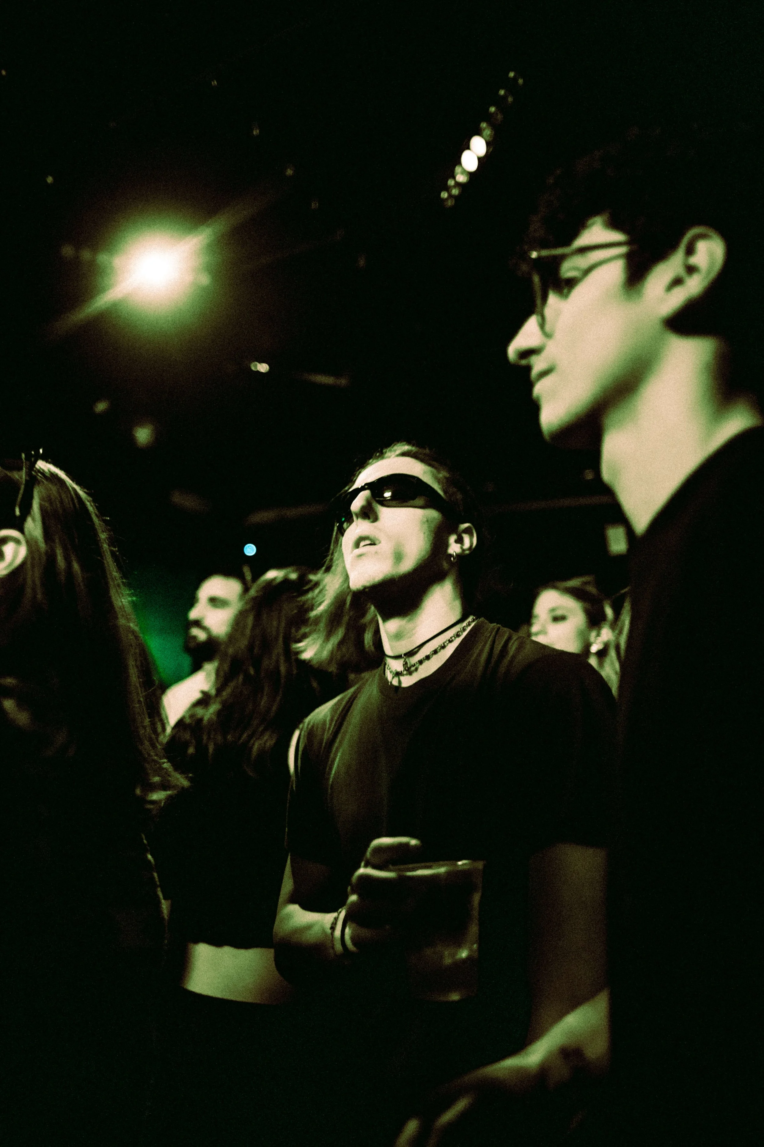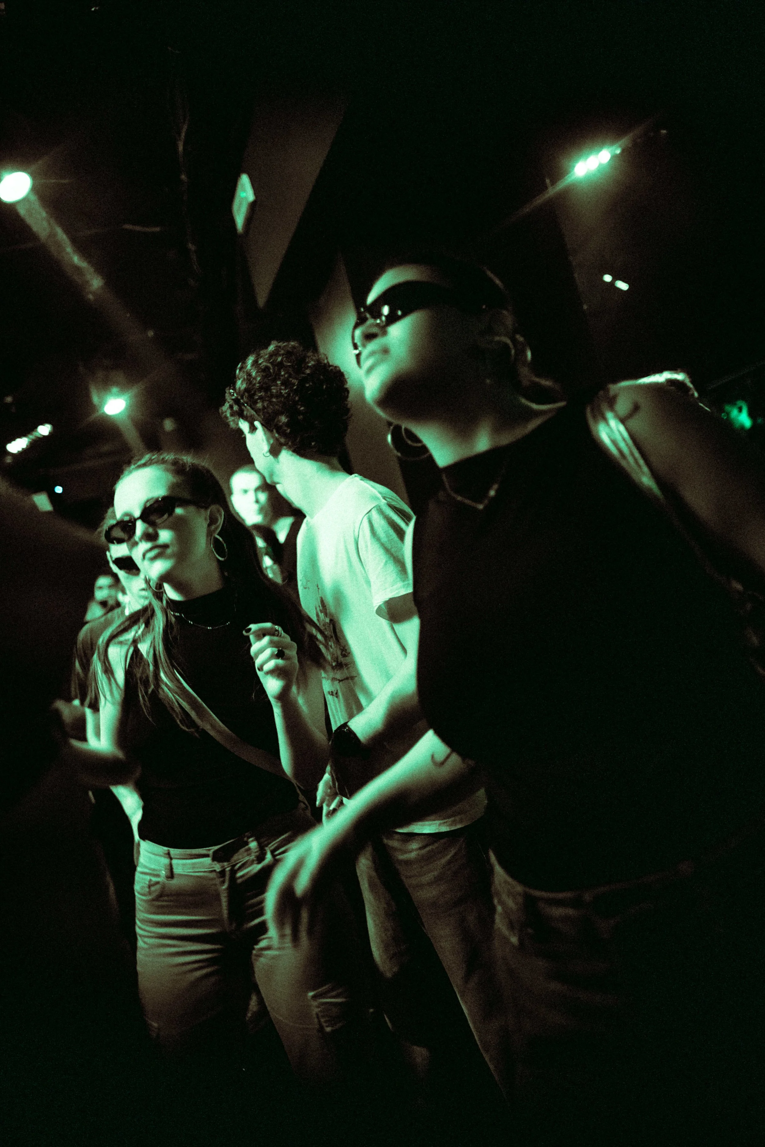 Gruppo di persone al concerto o in un club, alcune indossano occhiali da sole e ascoltano la musica, ambiente con luci verdi e atmosfera vivace.