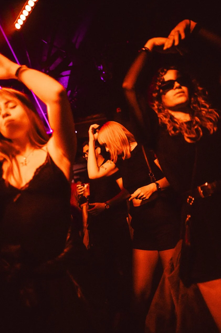 Donne danzanti in un ambiente con luci colorate, probabilmente in un club o a una festa, con sorrisi e un'atmosfera di divertimento.