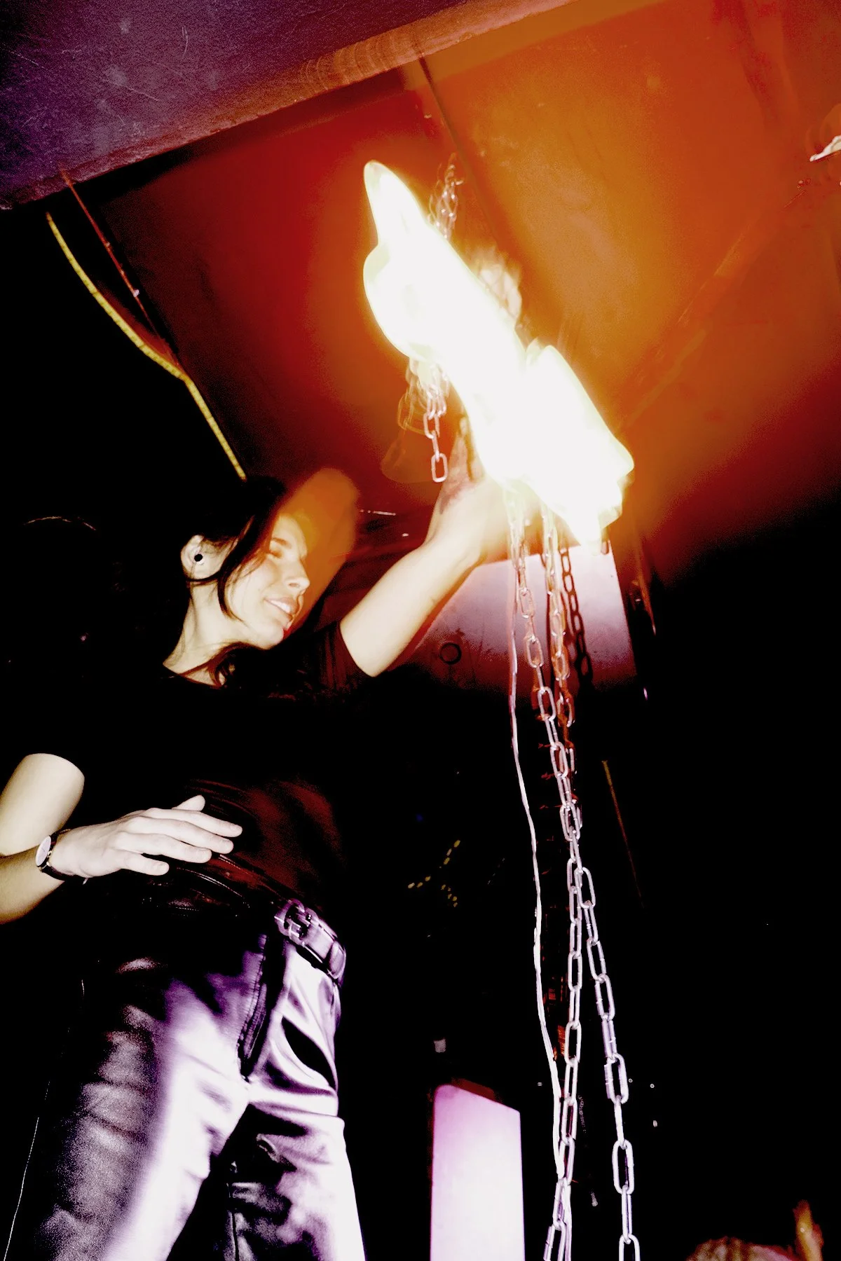 Una persona in un ambiente oscuro, illuminata da luci rosse, con catene fluorescenti rosa sospese sopra di lei.