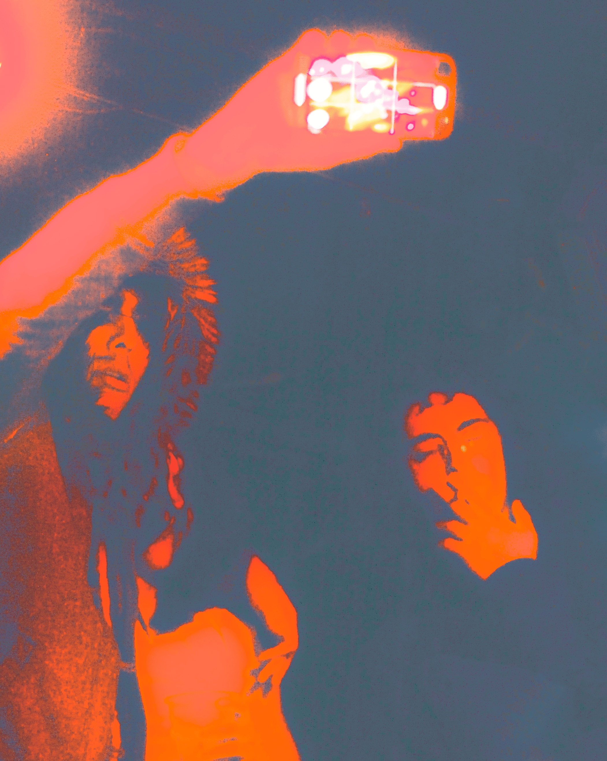 Ritratto di un giovane uomo in un ambiente con luci soffuse di diversi colori, che si scatta un selfie.