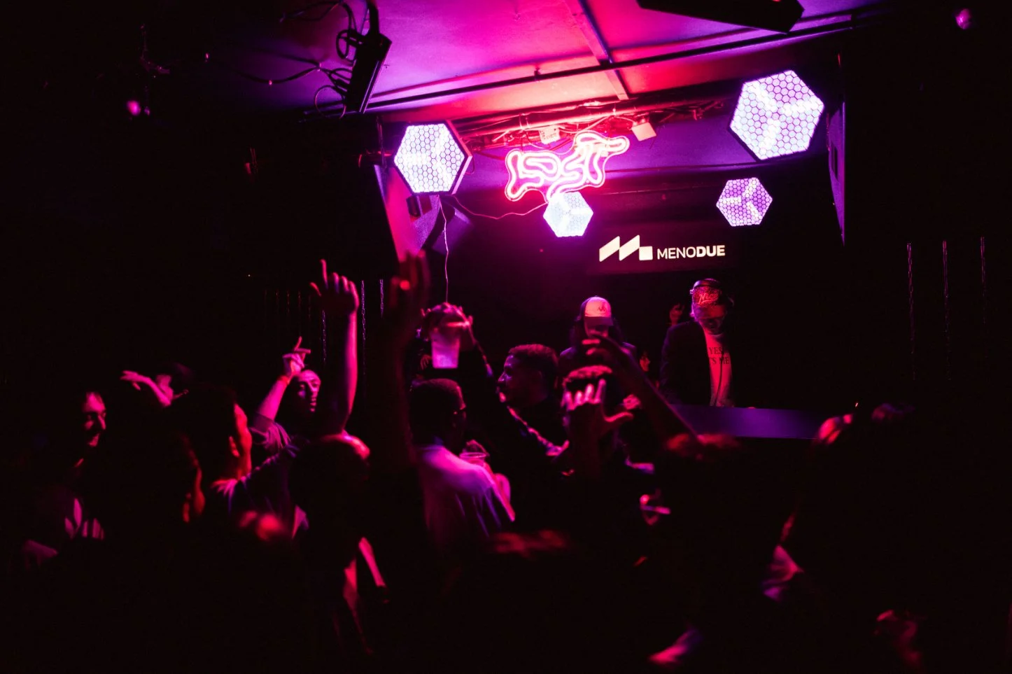 Club con DJ e persone che ballano e si divertono, illuminazione soffusa e schermo con scritto Menodue.