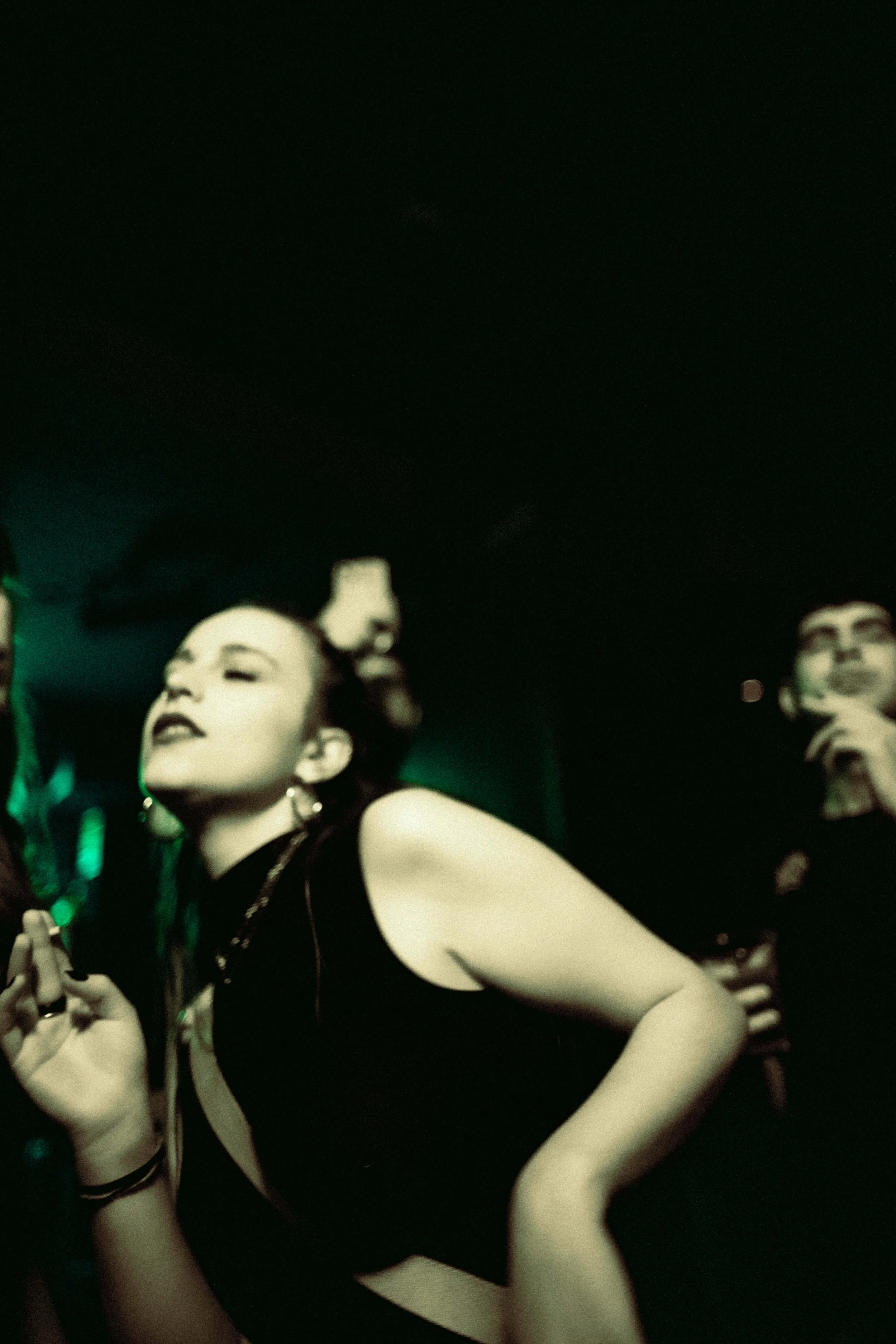 Una donna con trucco scuro e acconciatura elegante in un ambiente oscuro con luci verdi, mentre altri giovani sono sullo sfondo.