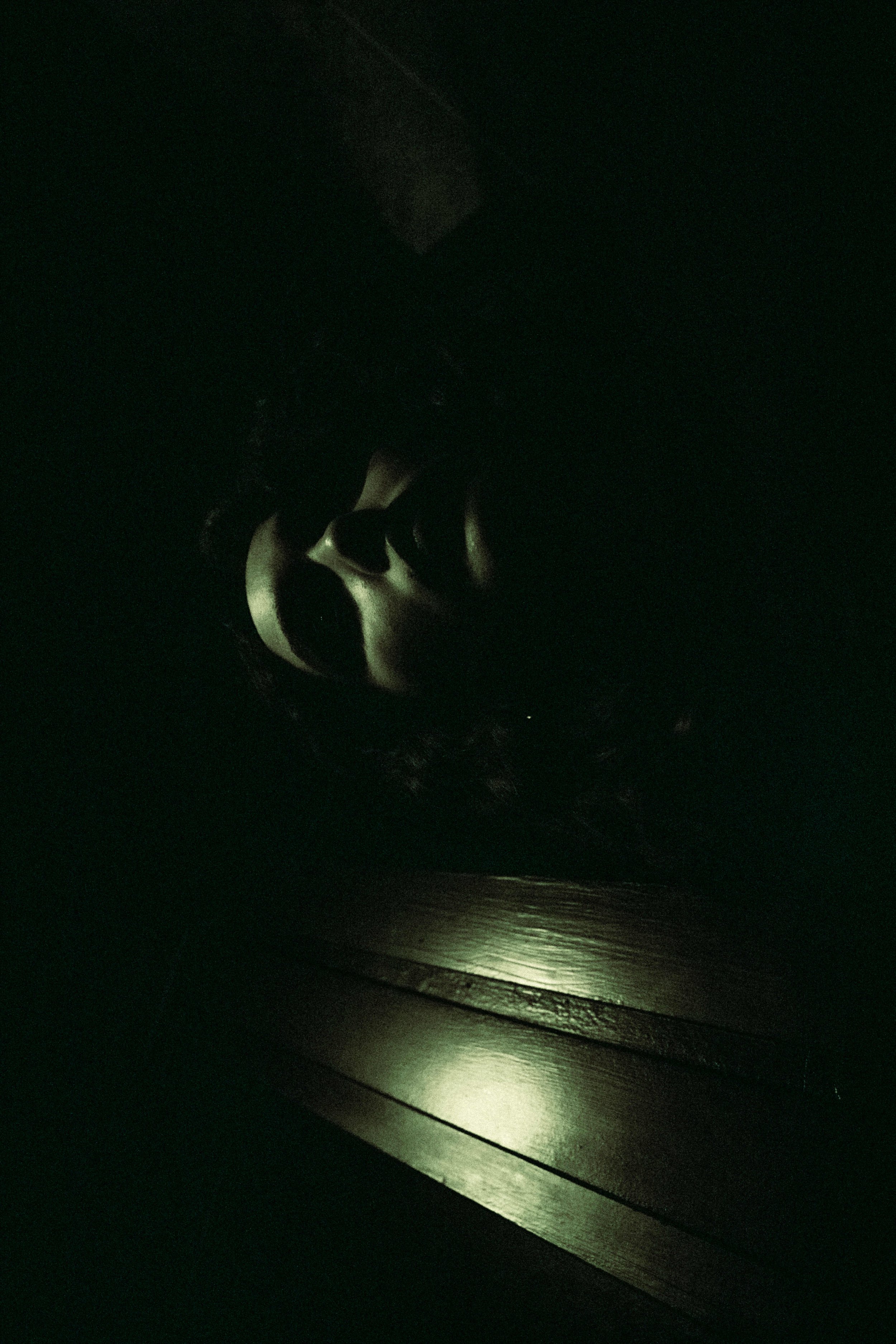 Volto umano con un disegno di colore chiaro sulle parti del viso, visibile in una stanza buia con un fascio di luce che illumina il pavimento.