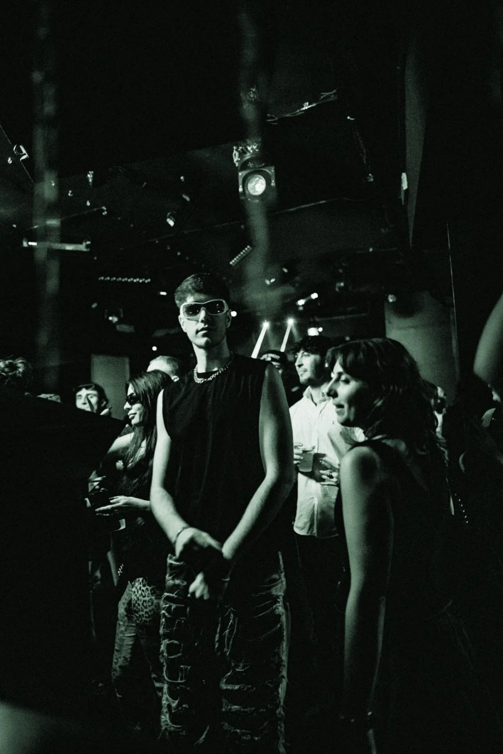Gruppo di giovani in un club notturno, alcuni con abiti scuri e accessori come occhiali da sole e collane, in un ambiente poco illuminato.